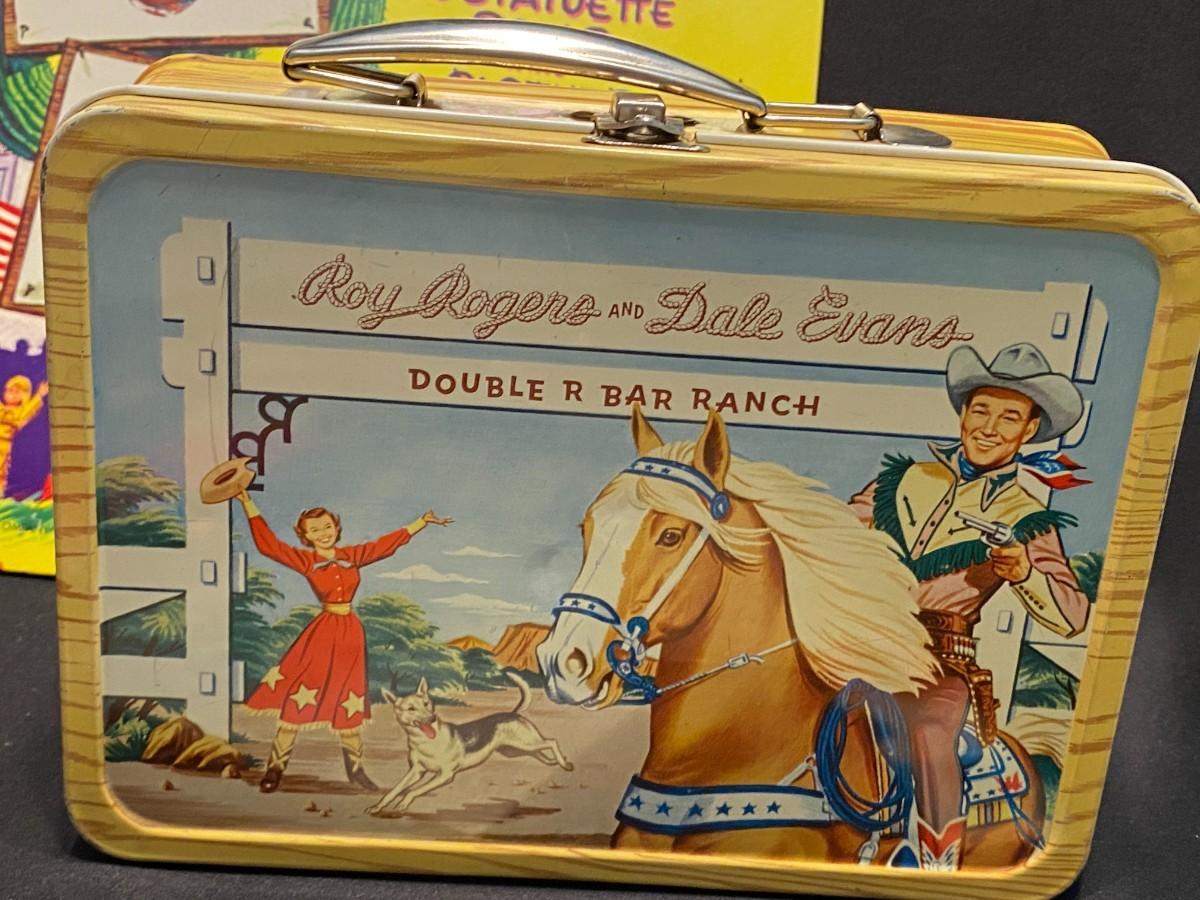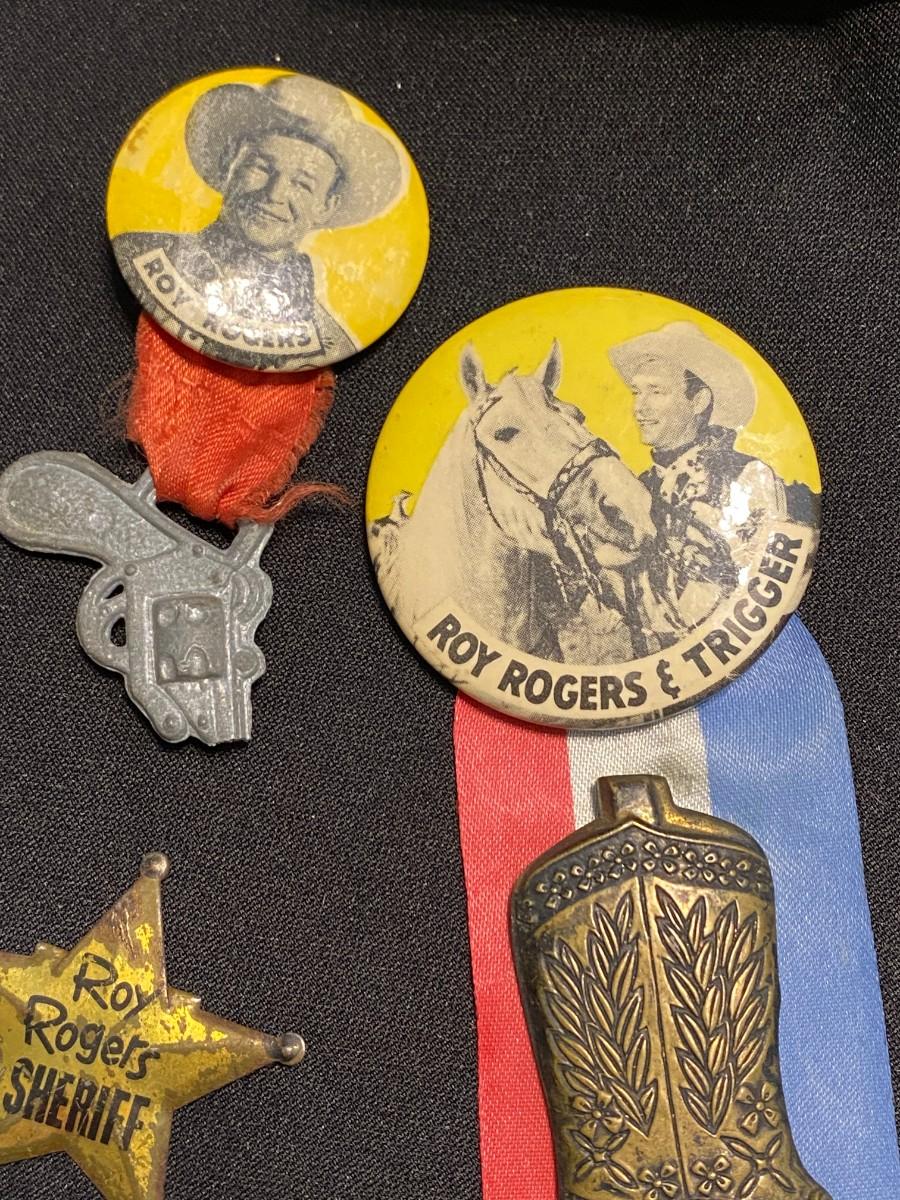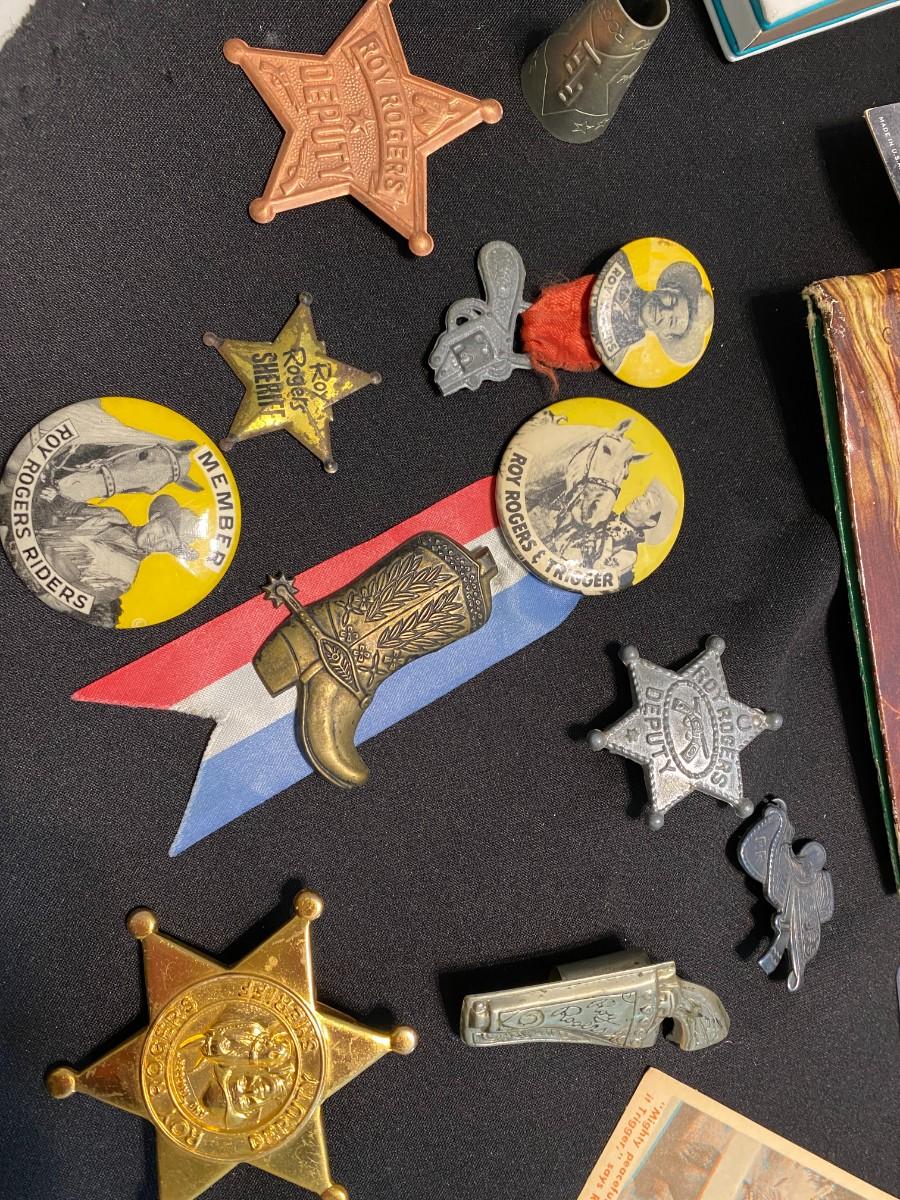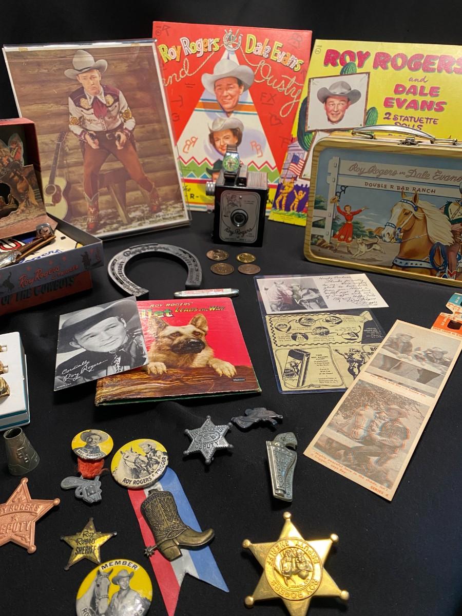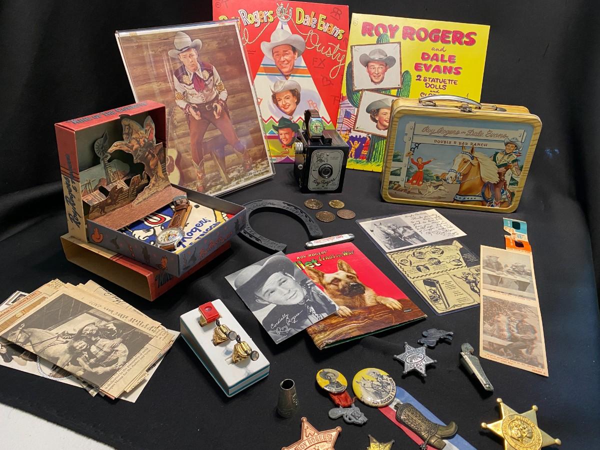 Large Lot of Roy Rogers Vintage Collectibles Ephemera Lunch Box Thermos Books Coins Badges Pins and Horseshoe