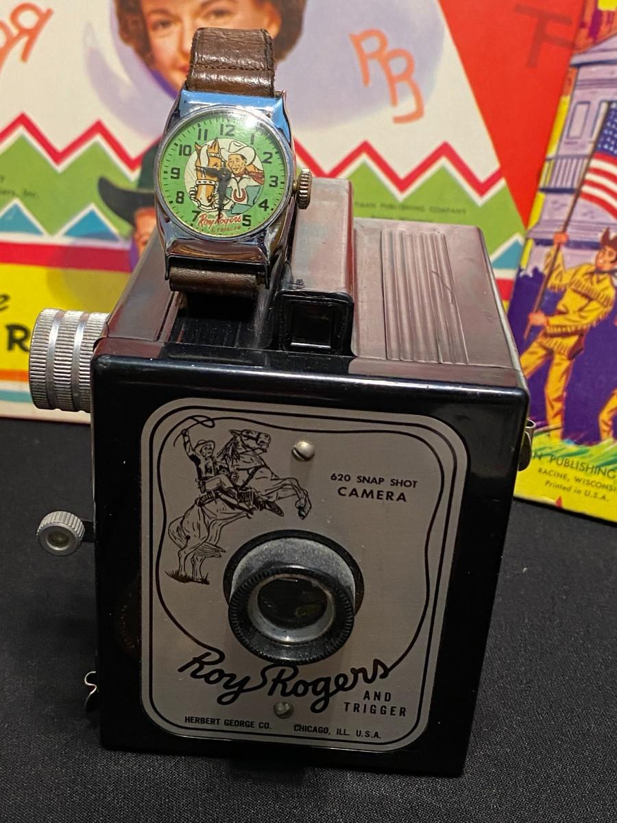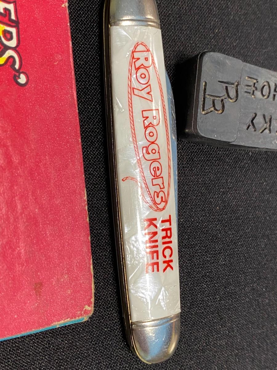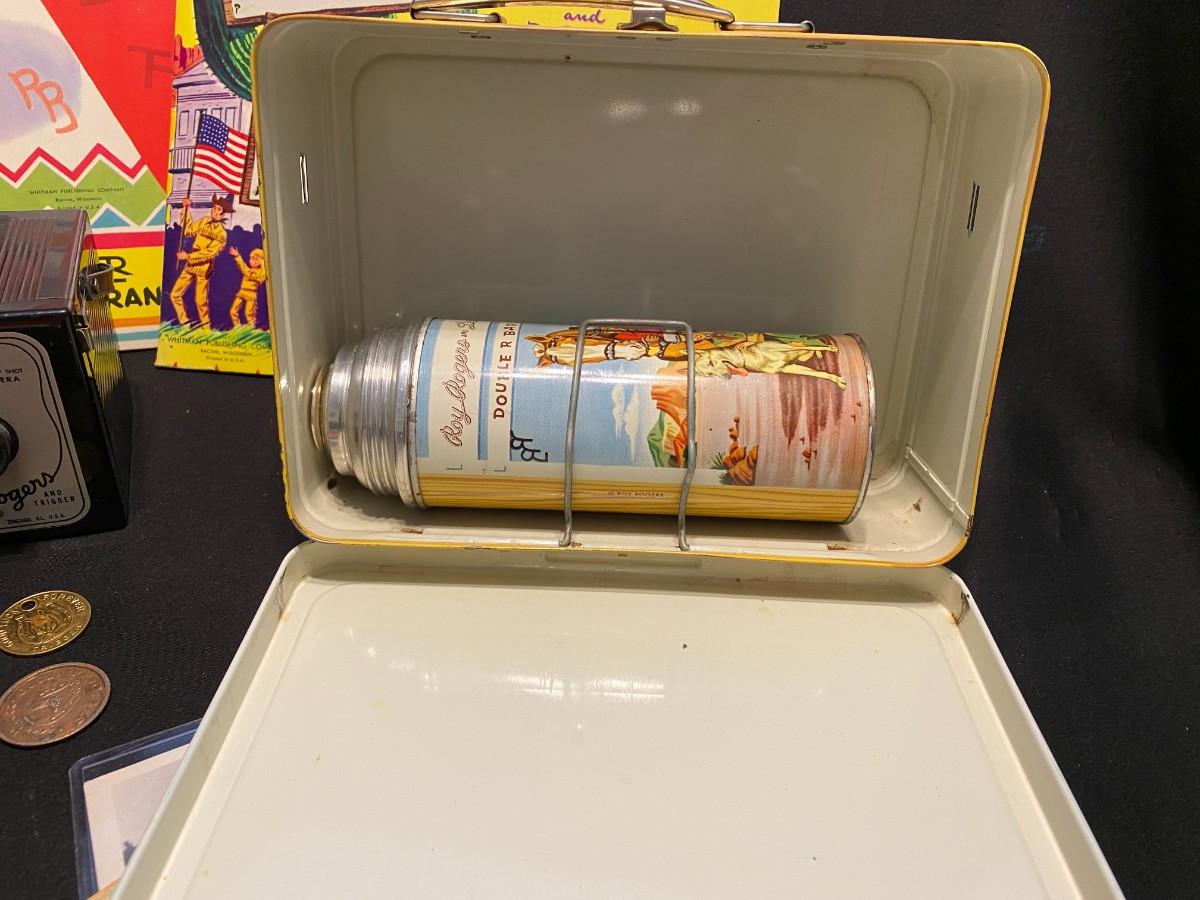 Large Lot of Roy Rogers Vintage Collectibles Ephemera Lunch Box Books Coins Badges Pins and Horse shoe. Includes Roy Rogers snapshot camera, button with ribbon and boot, watch, riders button, button with gun, badges, pocket knife, tin finger rings, lucky coins, saddle pin with pin back, Quaker cereal iron branding ring, microscope metal ring, and lunch box with thermos Roy Rogers and Dale Evans collectibles. Condition as shown.