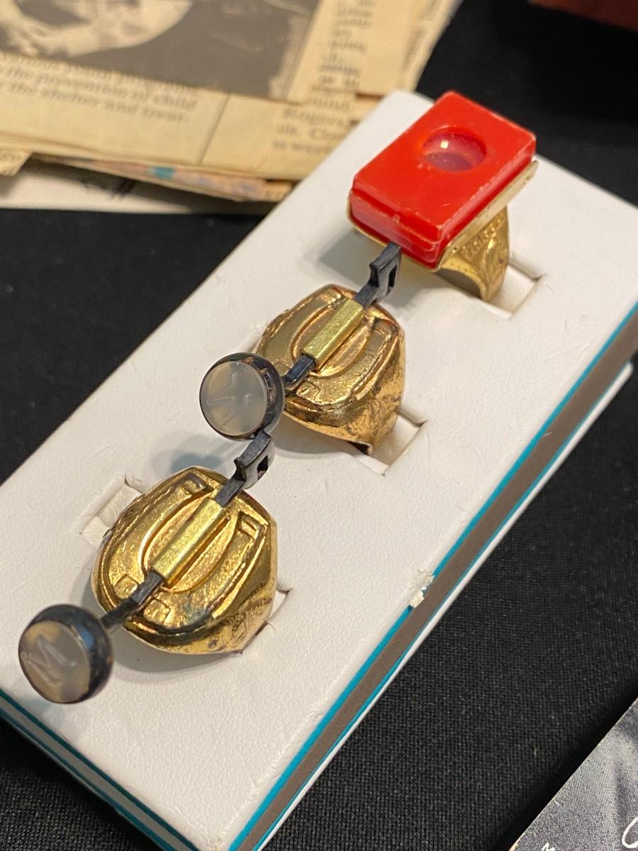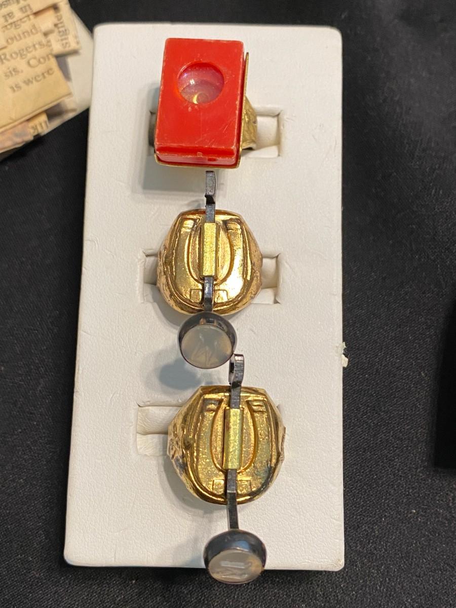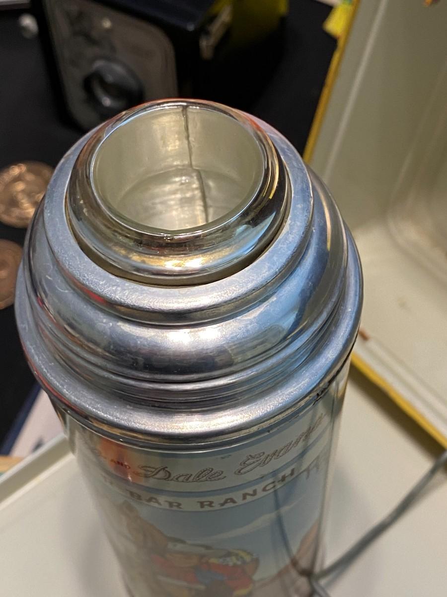 Large Lot of Roy Rogers Vintage Collectibles Ephemera Lunch Box Books Coins Badges Pins and Horse shoe. Includes Roy Rogers snapshot camera, button with ribbon and boot, watch, riders button, button with gun, badges, pocket knife, tin finger rings, lucky coins, saddle pin with pin back, Quaker cereal iron branding ring, microscope metal ring, and lunch box with thermos Roy Rogers and Dale Evans collectibles. Condition as shown.