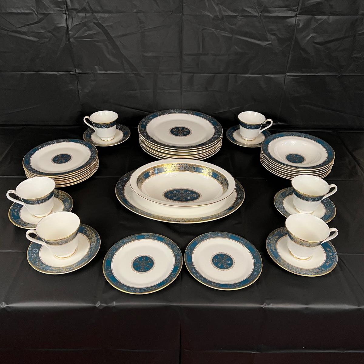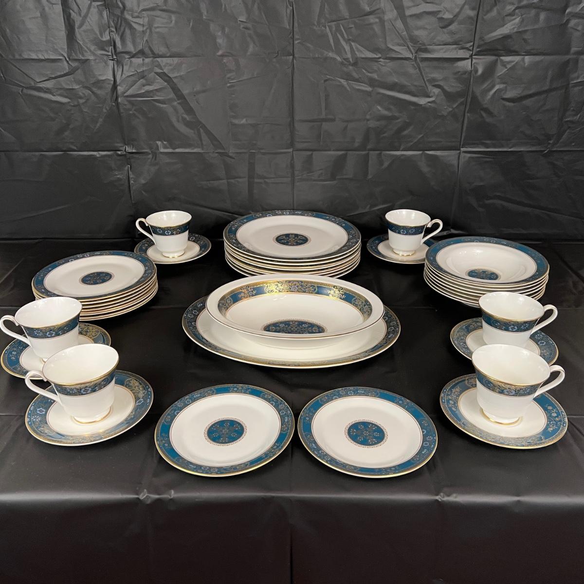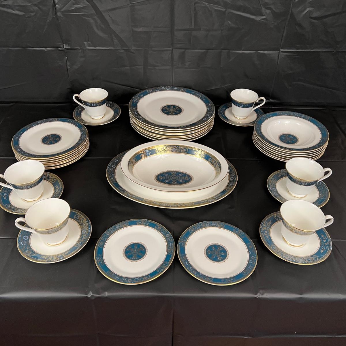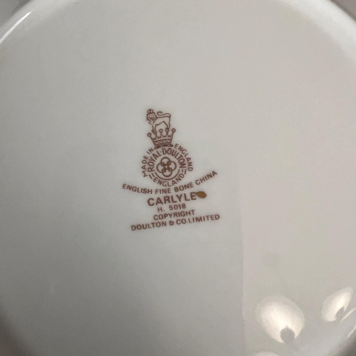 Large Lot of Royal Doulton Carlyle China Dish Set. Includes 8 Dinner Plates, 8 Salad Plates, 7 Soup Bowls, 6 Tea Cups and Plates, Serving Platter, Serving Dish, and 2 dessert or cheese or bread plates. In very good condition, as shown. An excellent set!!