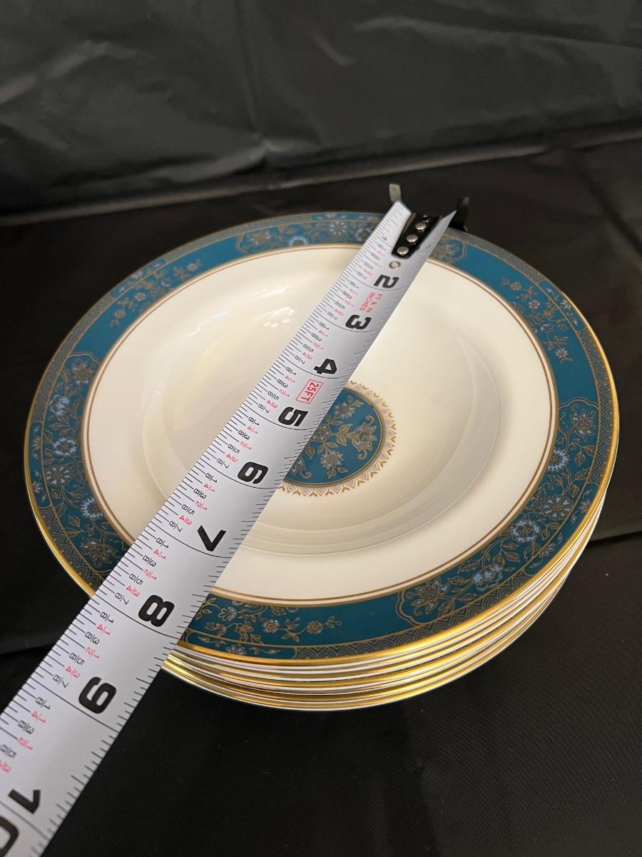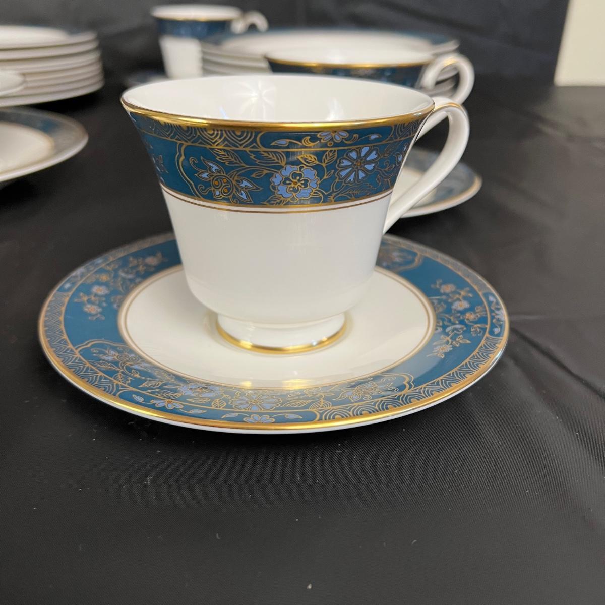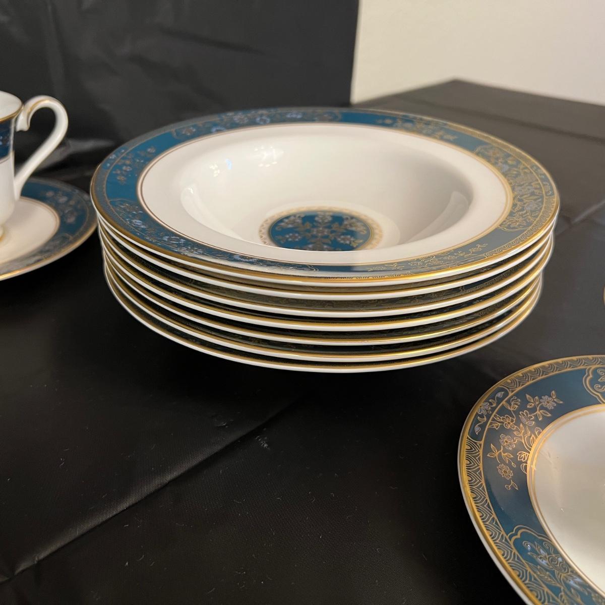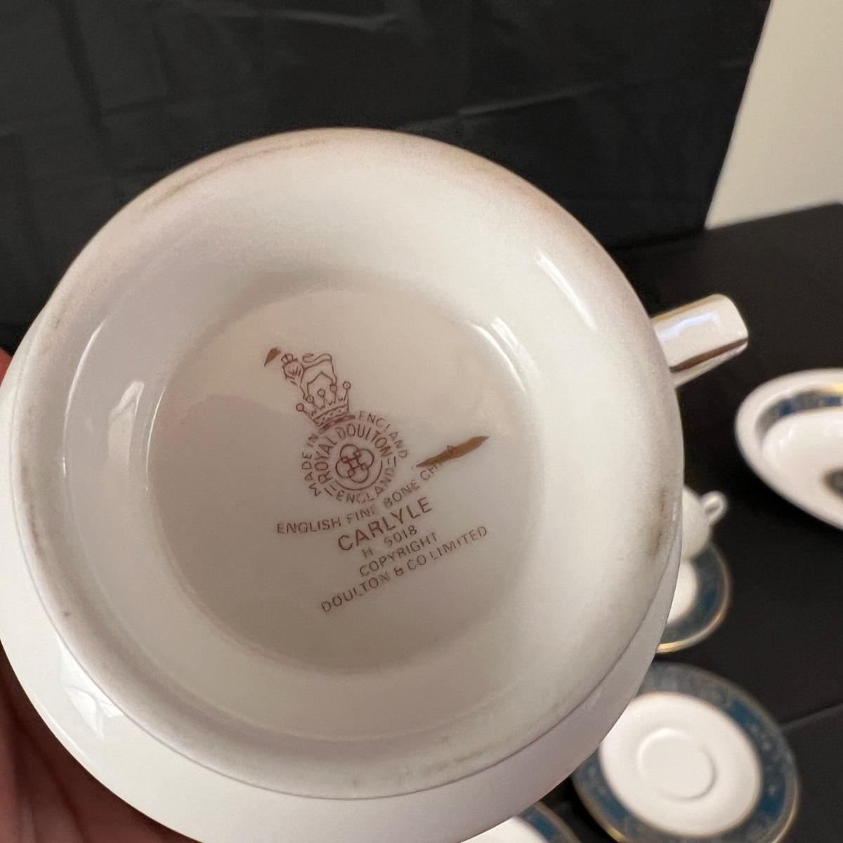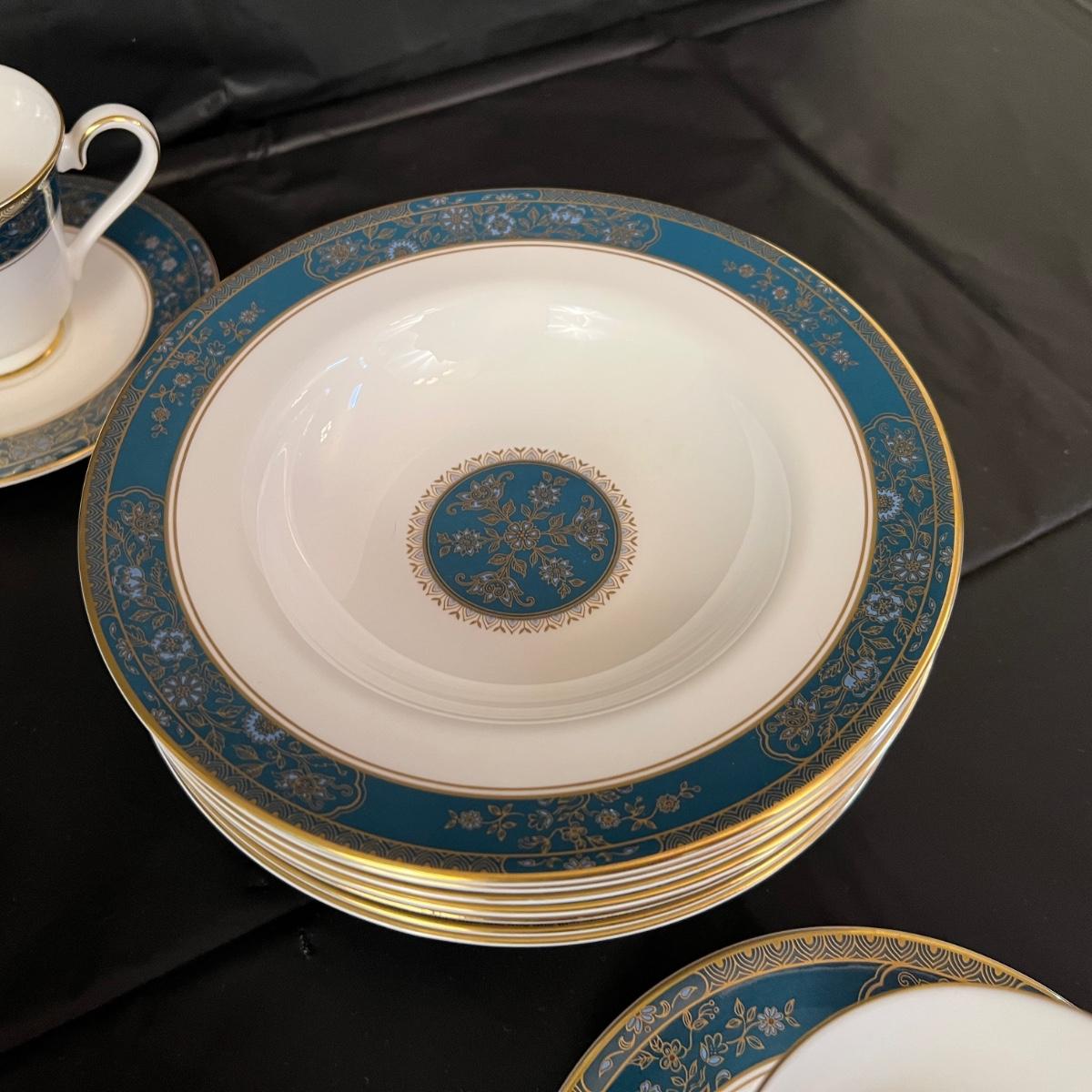 Large Lot of Royal Doulton Carlyle China Dish Set. Includes 8 Dinner Plates, 8 Salad Plates, 7 Soup Bowls, 6 Tea Cups and Plates, Serving Platter, Serving Dish, and 2 dessert or cheese or bread plates. In very good condition, as shown. An excellent set!!