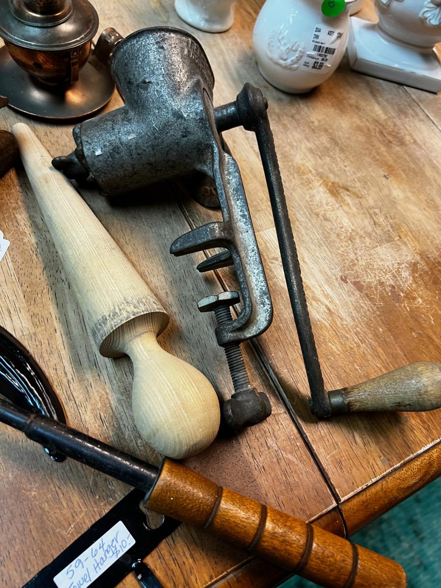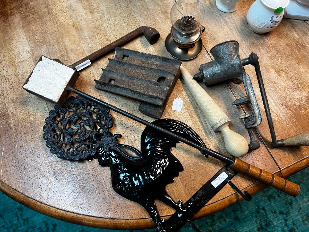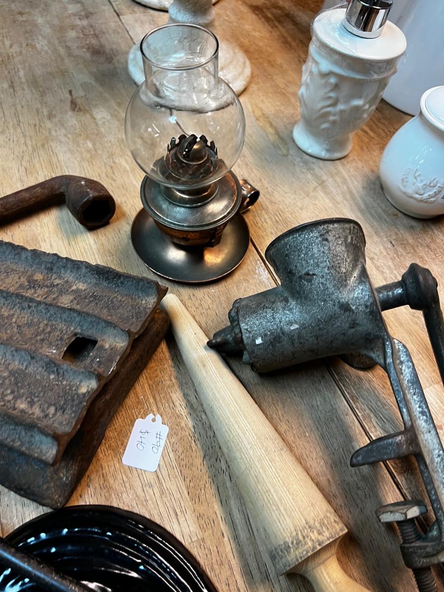 Large Lot of Rustic Items: Oil Lamp, Trivet, Wrench, Grinder