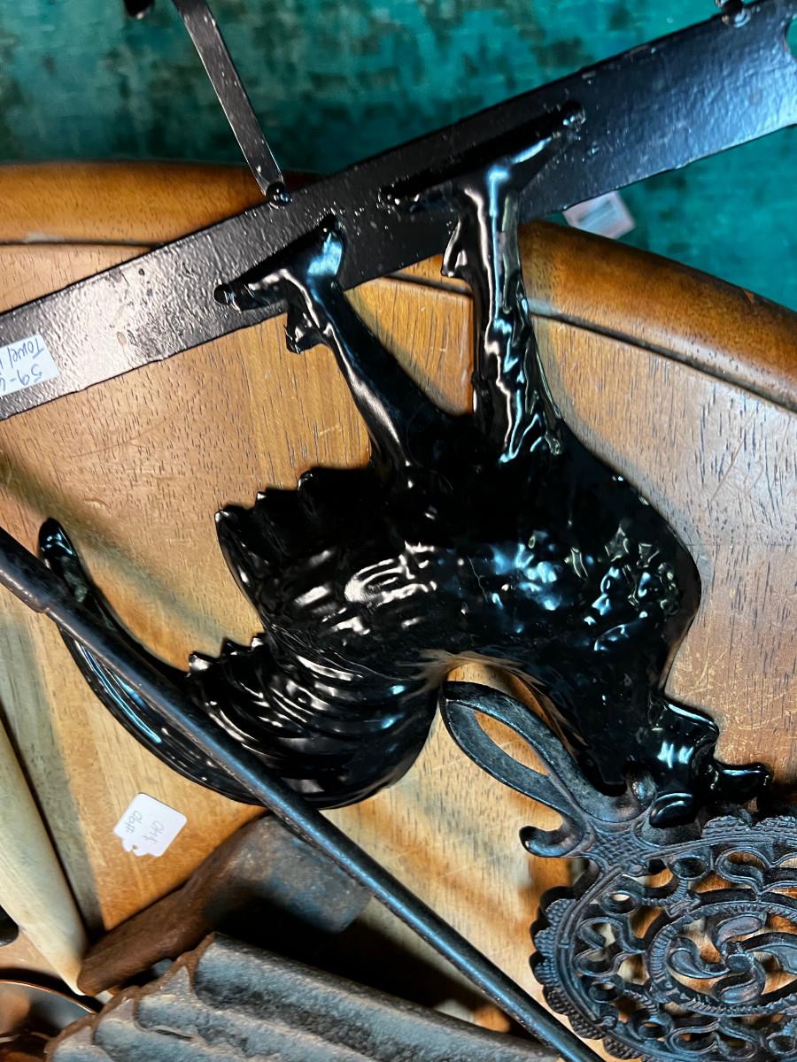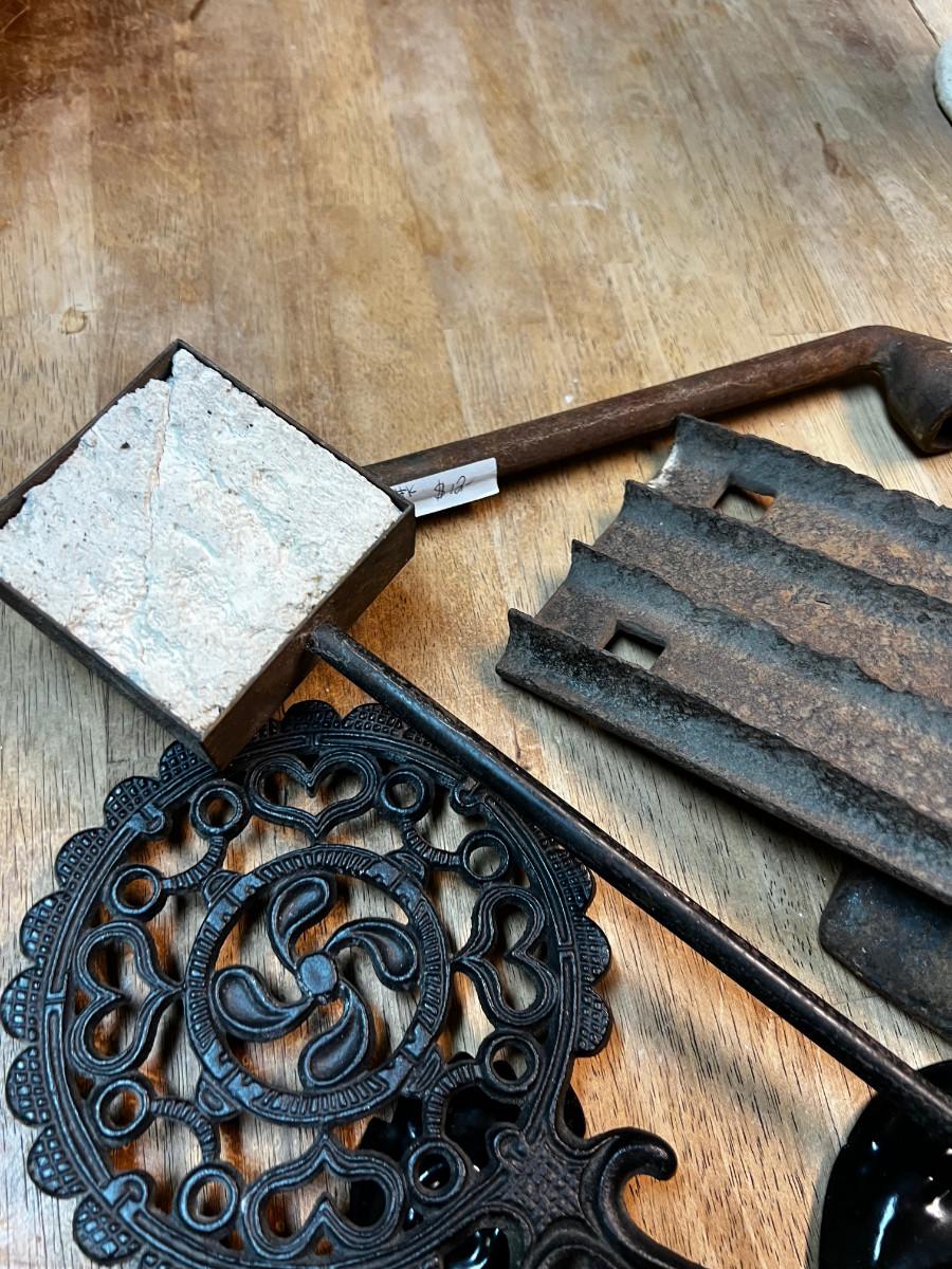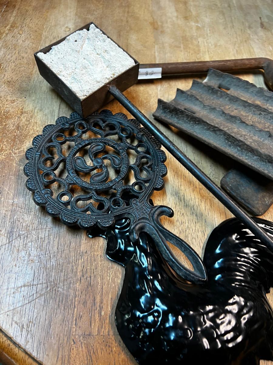 Large Lot of Rustic Items: Oil Lamp, Trivet, Wrench, Grinder