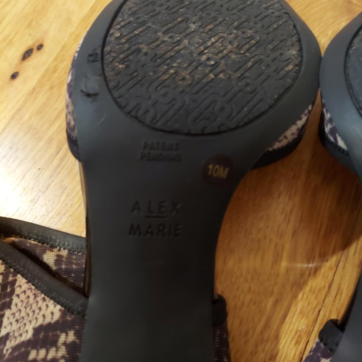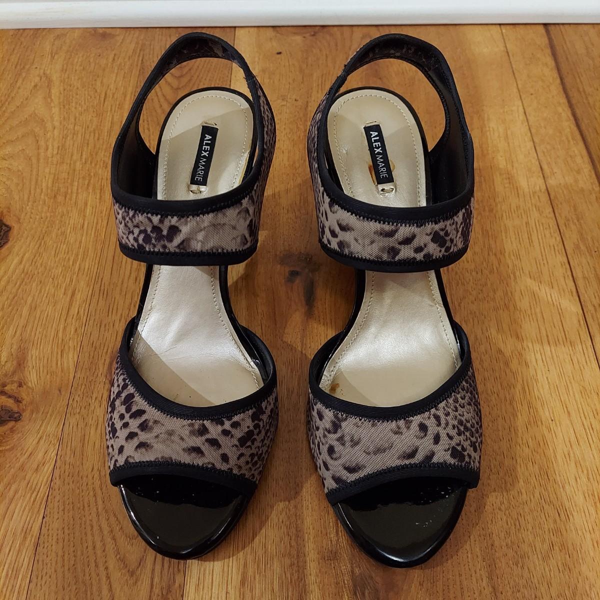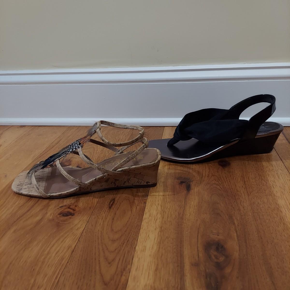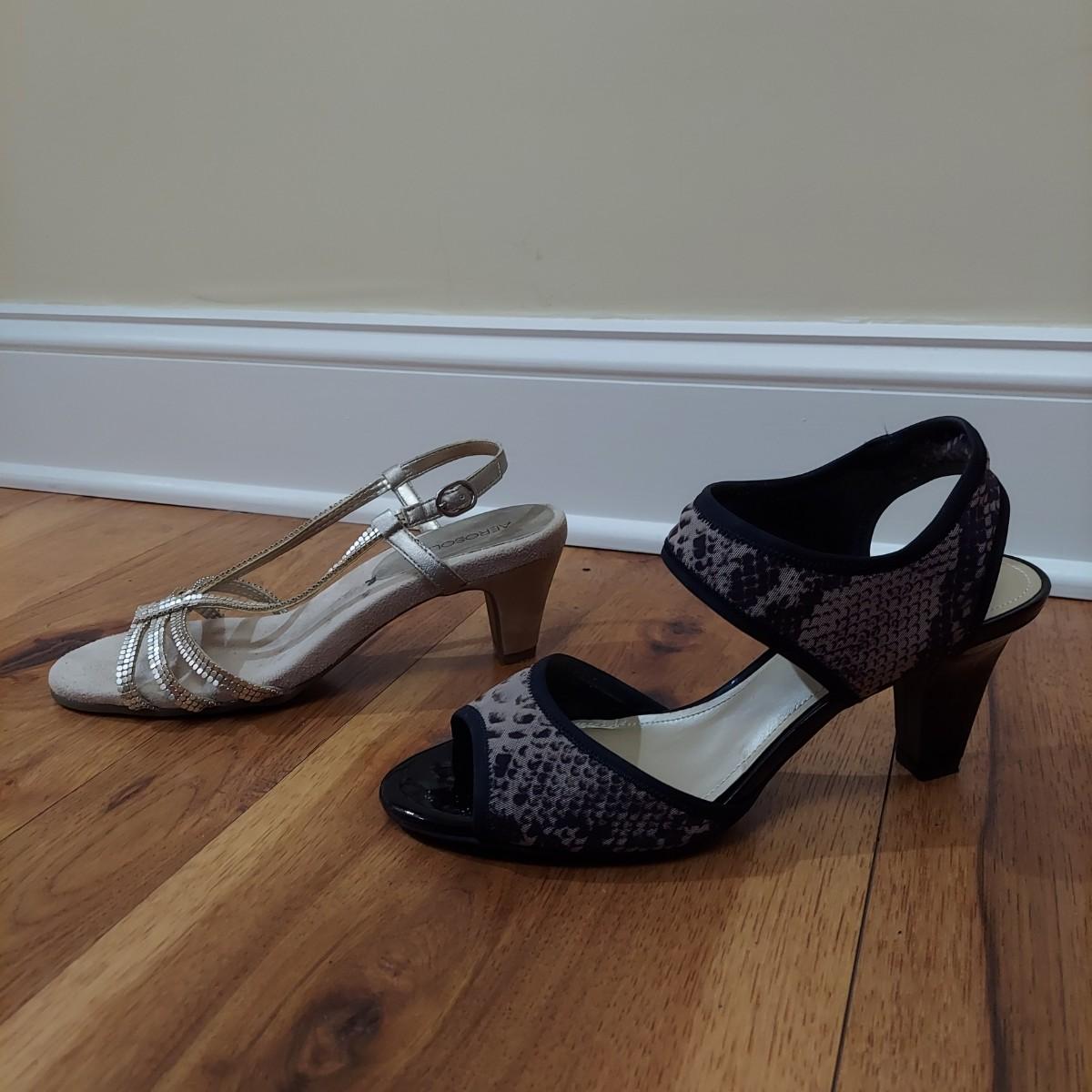 Many varying styles of heels and sandals. There are 12 pairs in this lot. Some brands include Michael Kors, Carlos Santana and Aerosoles. All shoes are marked between size 9-10. There are many flat styles, some with a 2" wedge or low heel. The Alex Marie leopard heels have a 3" heel. Shipping available.