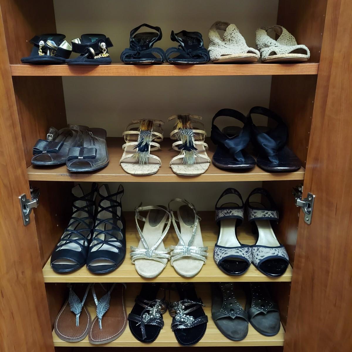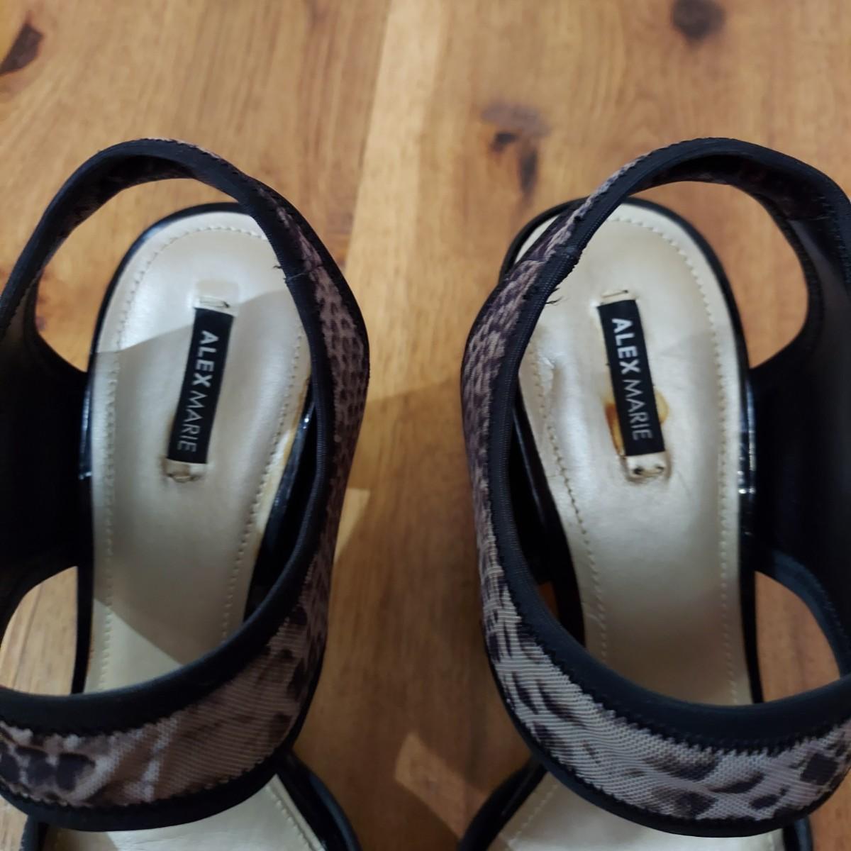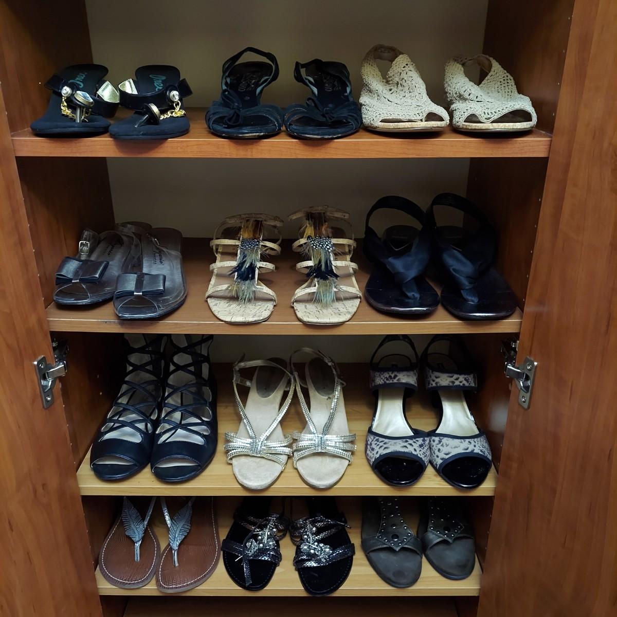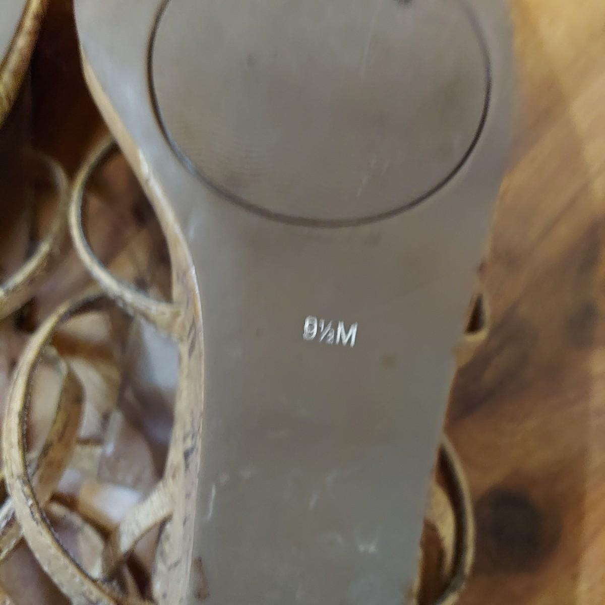 Many varying styles of heels and sandals. There are 12 pairs in this lot. Some brands include Michael Kors, Carlos Santana and Aerosoles. All shoes are marked between size 9-10. There are many flat styles, some with a 2" wedge or low heel. The Alex Marie leopard heels have a 3" heel. Shipping available.