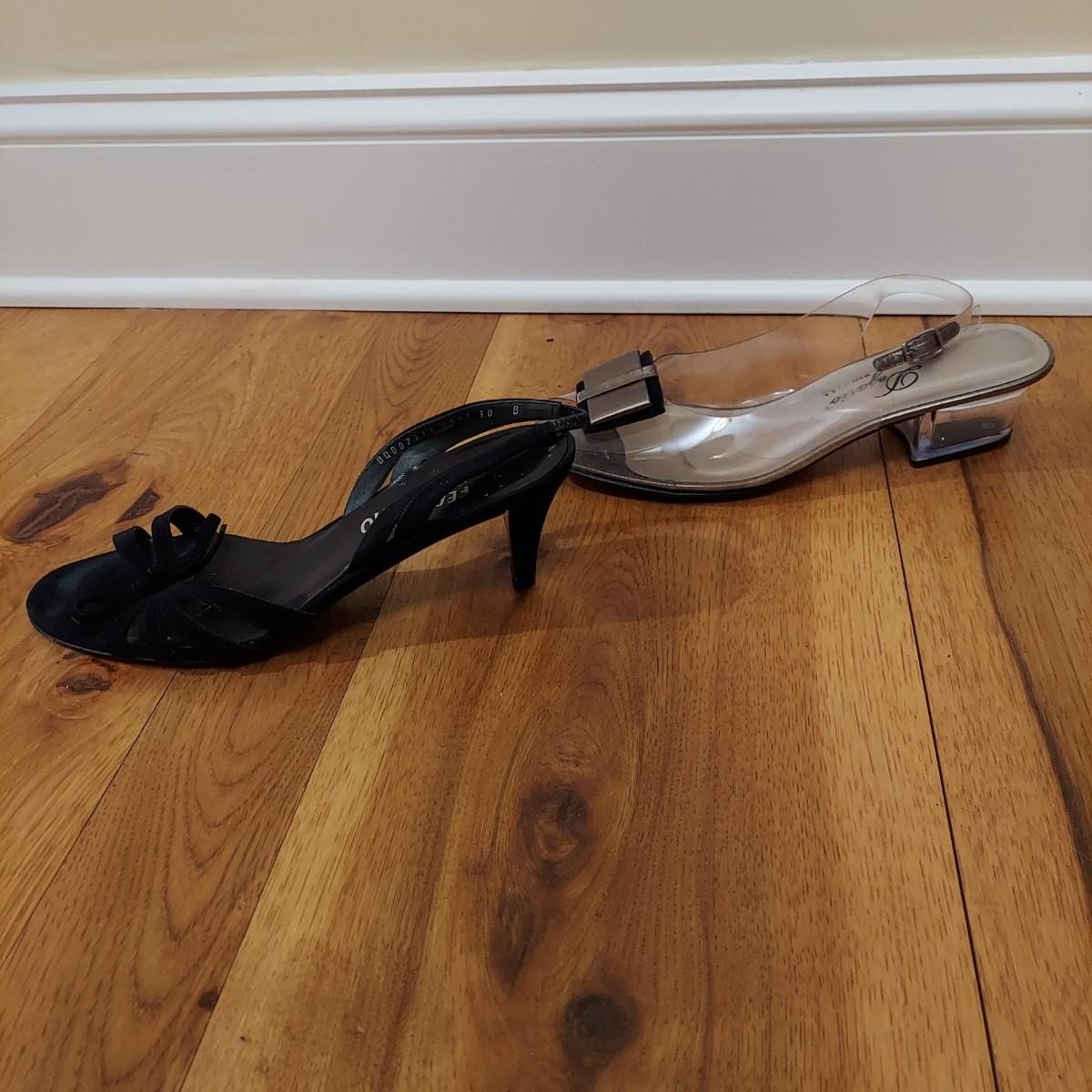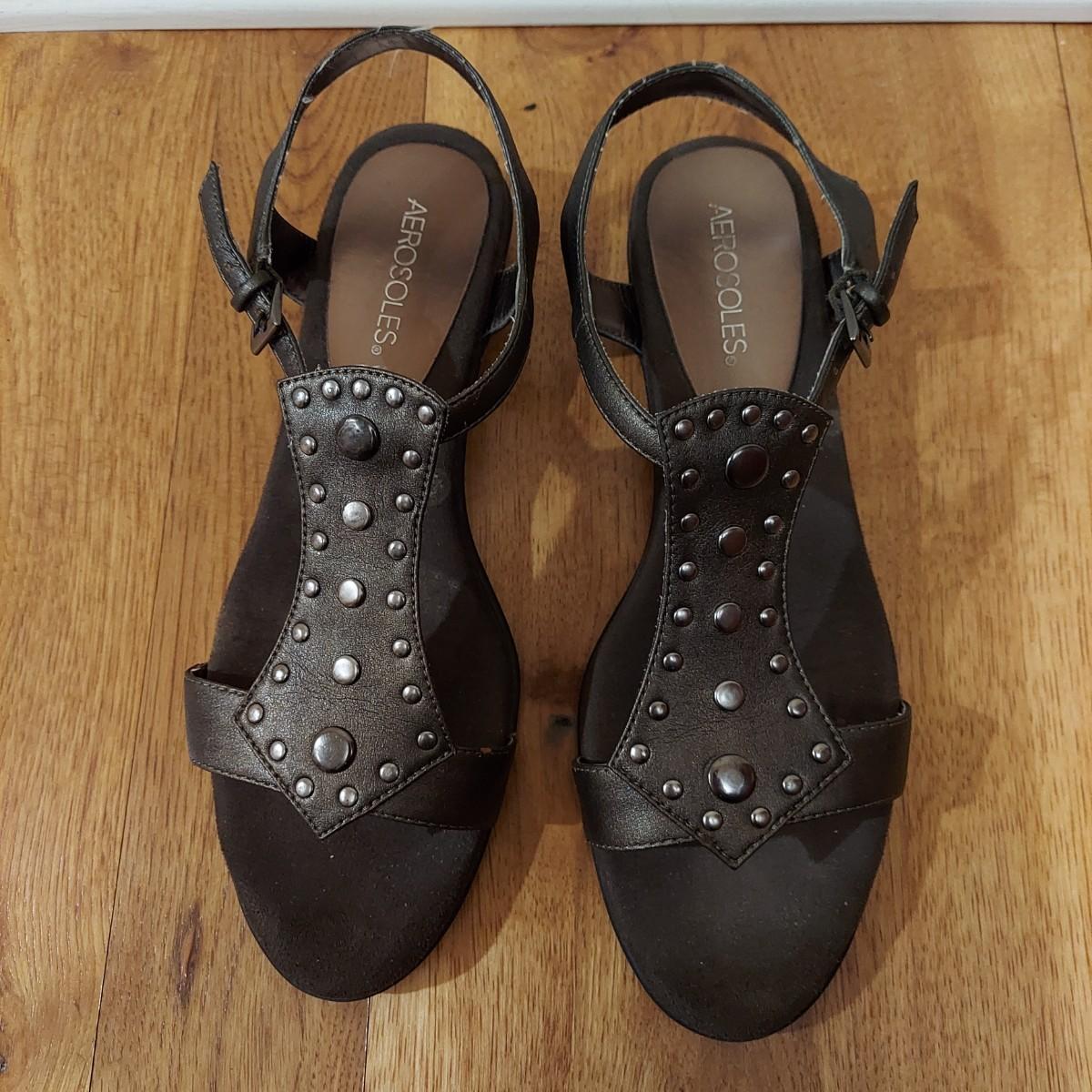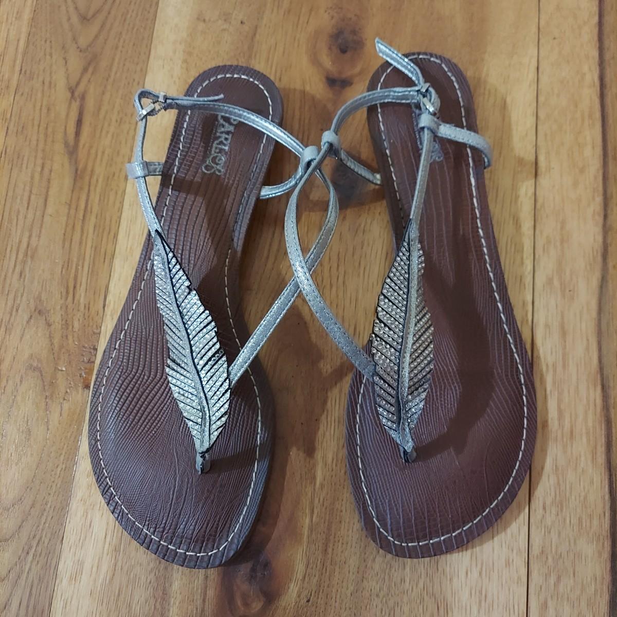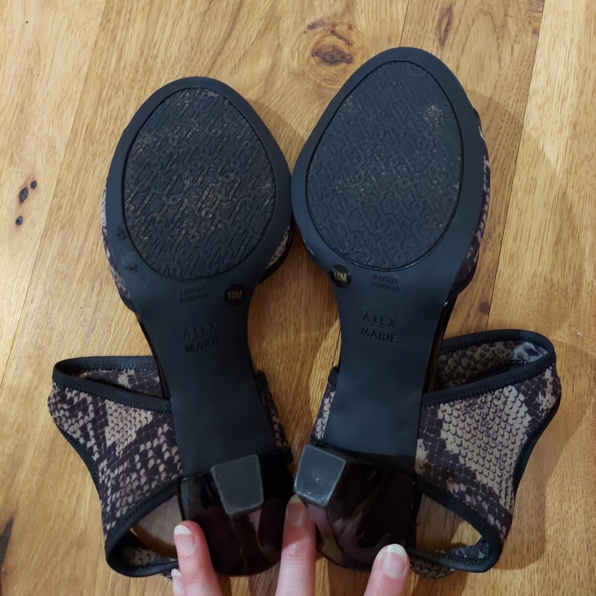 Many varying styles of heels and sandals. There are 12 pairs in this lot. Some brands include Michael Kors, Carlos Santana and Aerosoles. All shoes are marked between size 9-10. There are many flat styles, some with a 2" wedge or low heel. The Alex Marie leopard heels have a 3" heel. Shipping available.