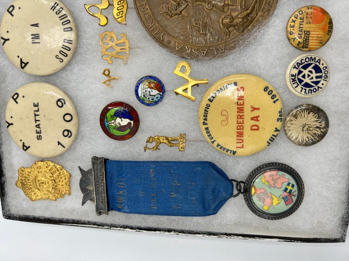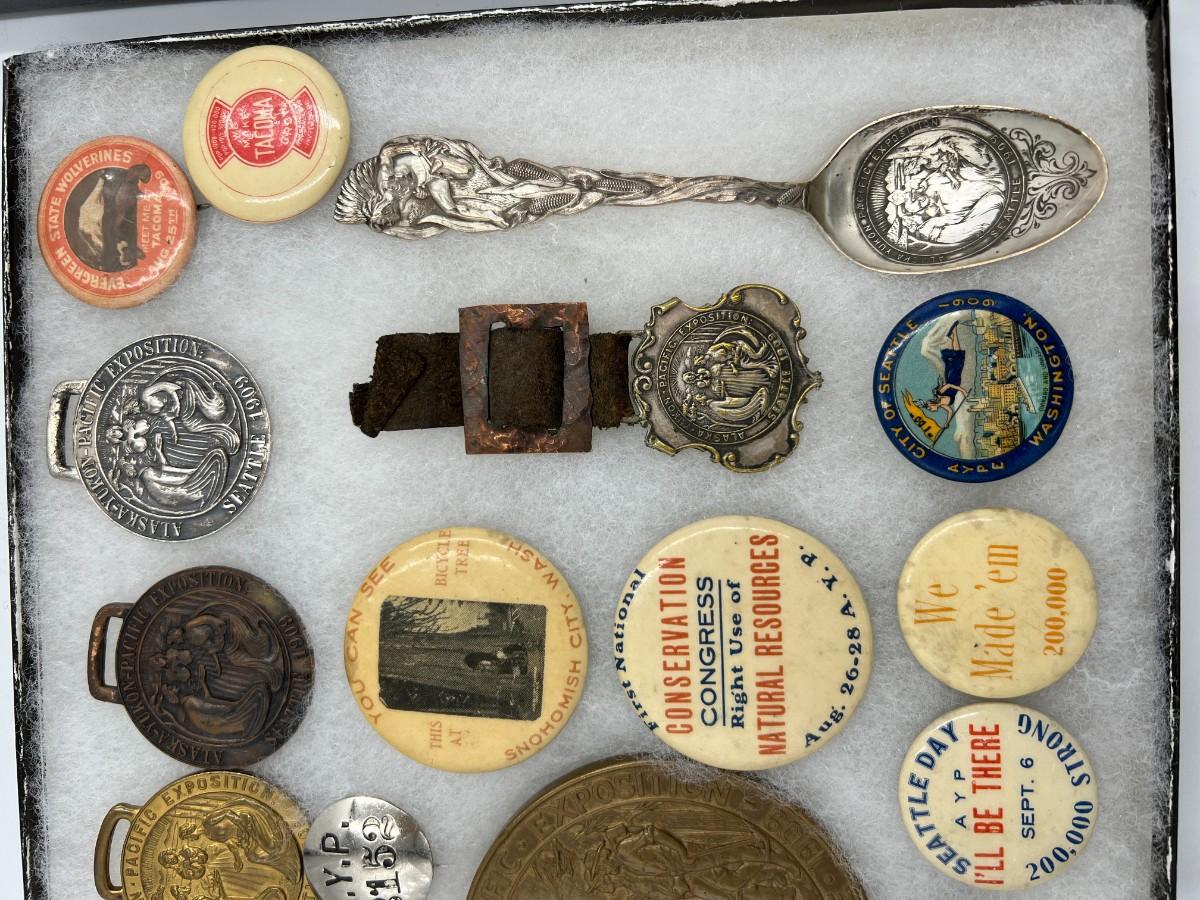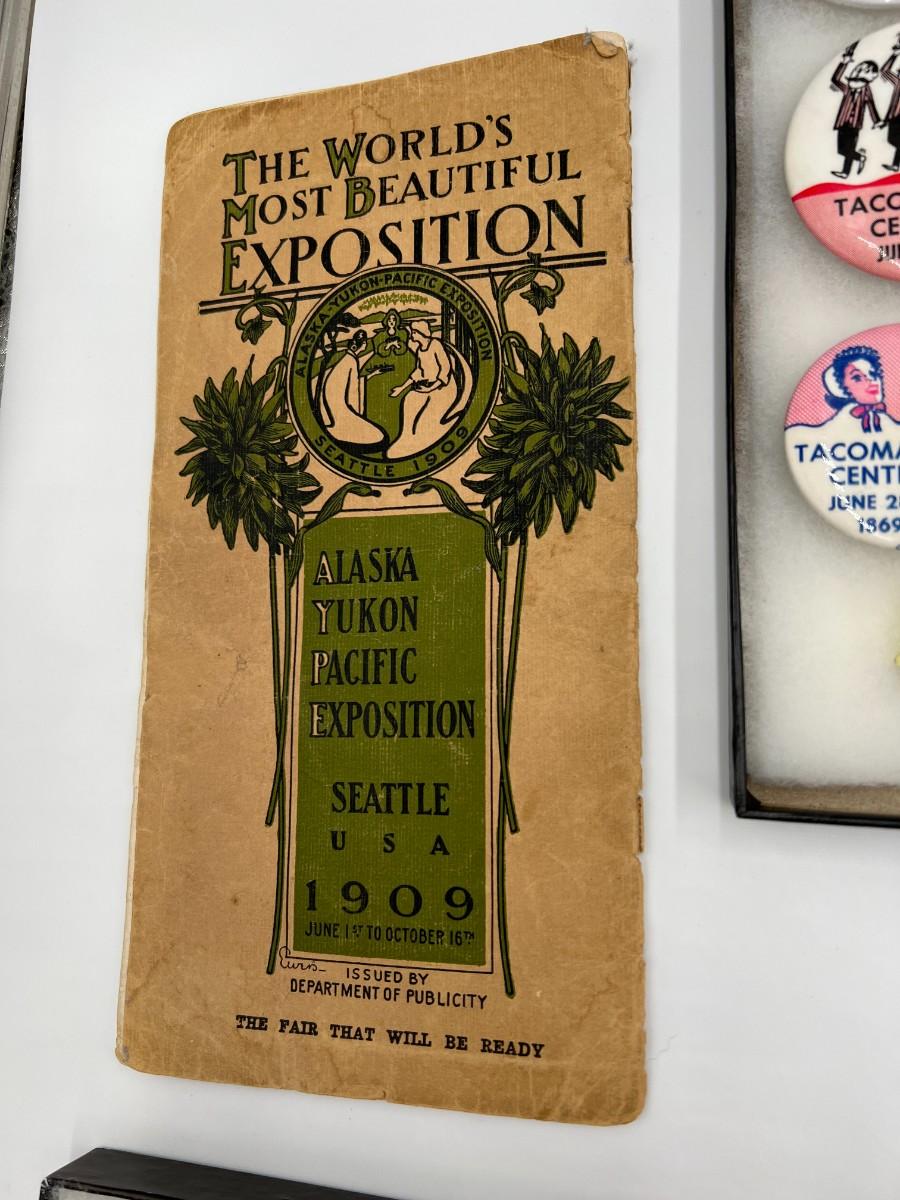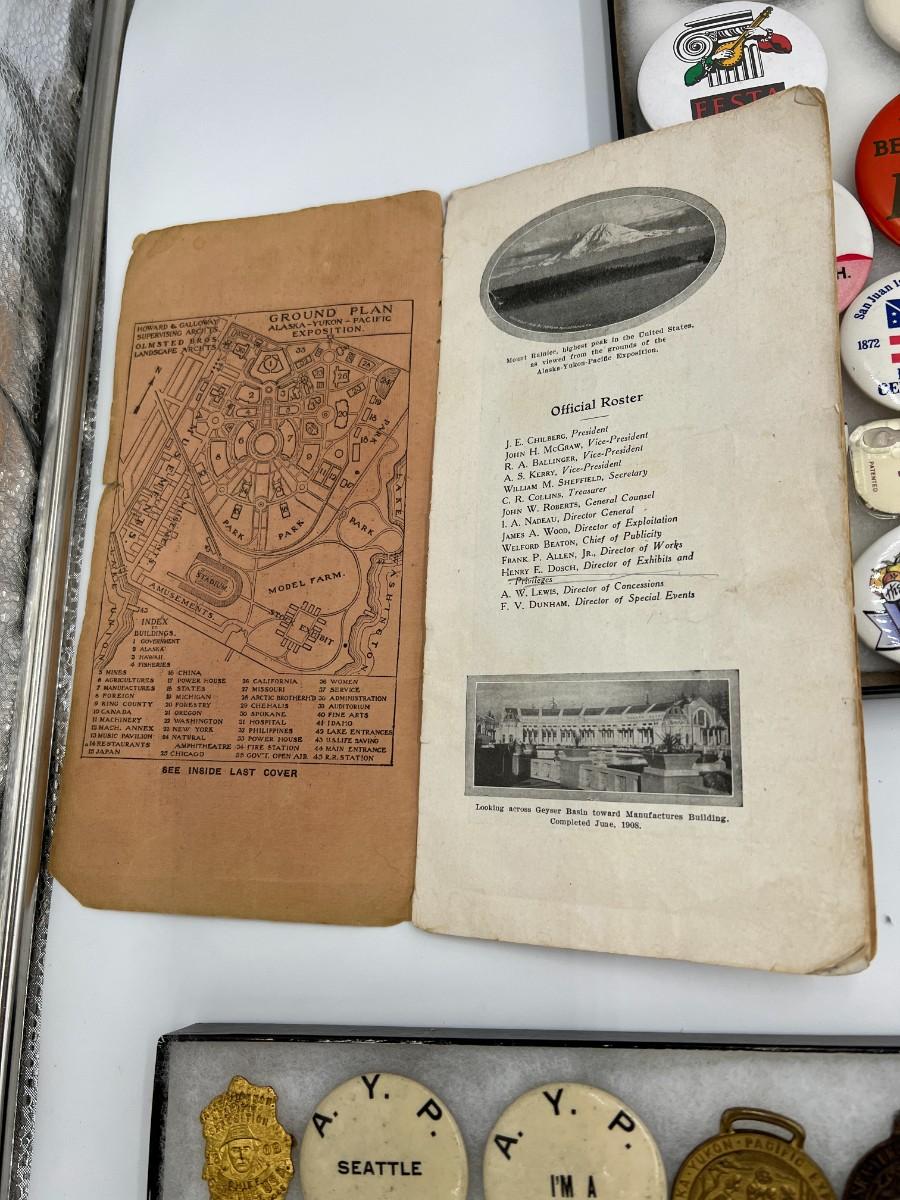 Large Lot of Seattle and Washington Related Buttons and Ephemera. Includes 1909 brochure for "The World's Most Beautiful Exposition" at the Alaska Yukon Pacific Exposition, and other collectibles related to the event.