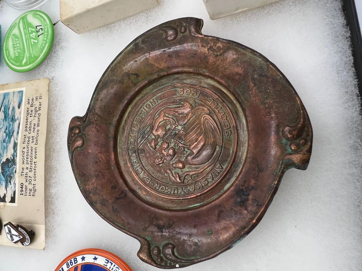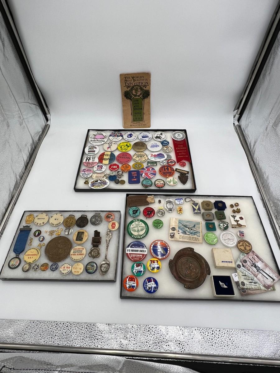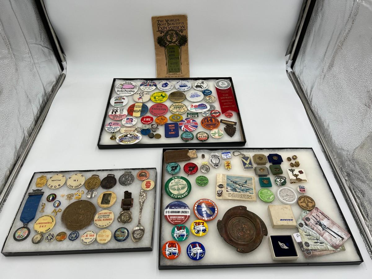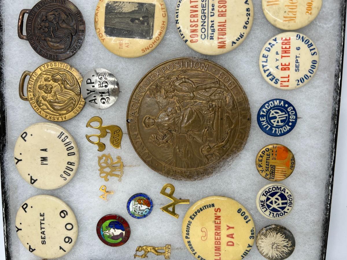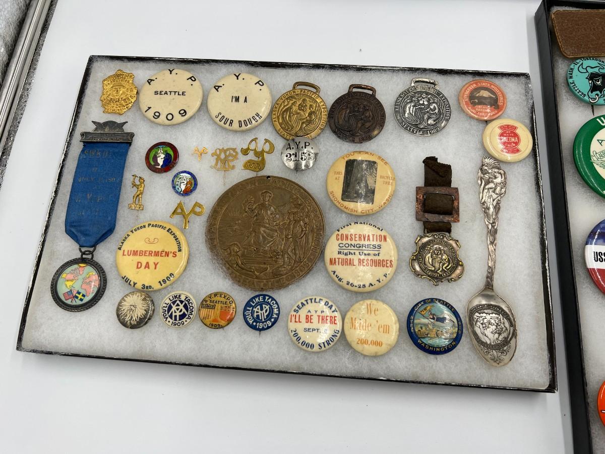 Large Lot of Seattle and Washington Related Buttons and Ephemera. Includes 1909 brochure for "The World's Most Beautiful Exposition" at the Alaska Yukon Pacific Exposition, and other collectibles related to the event.