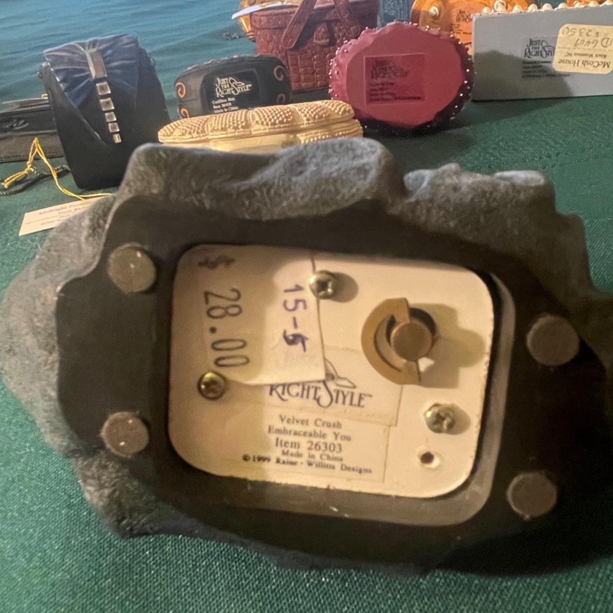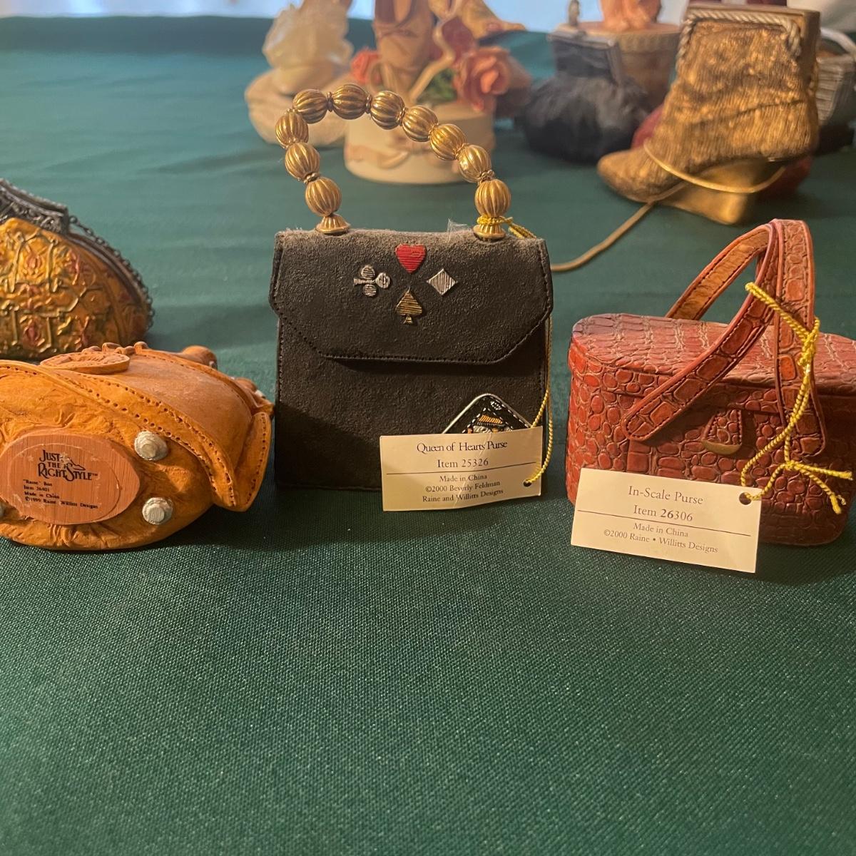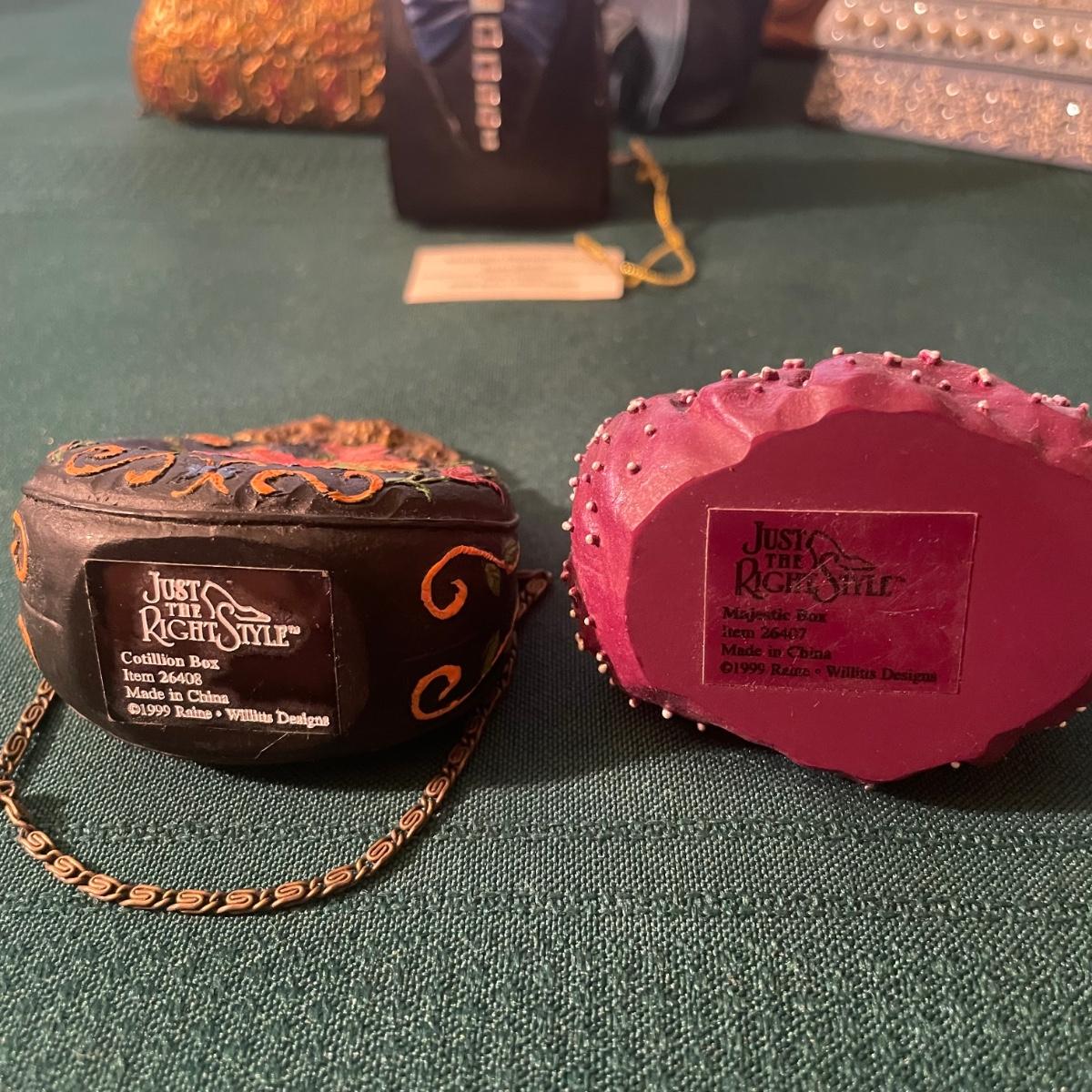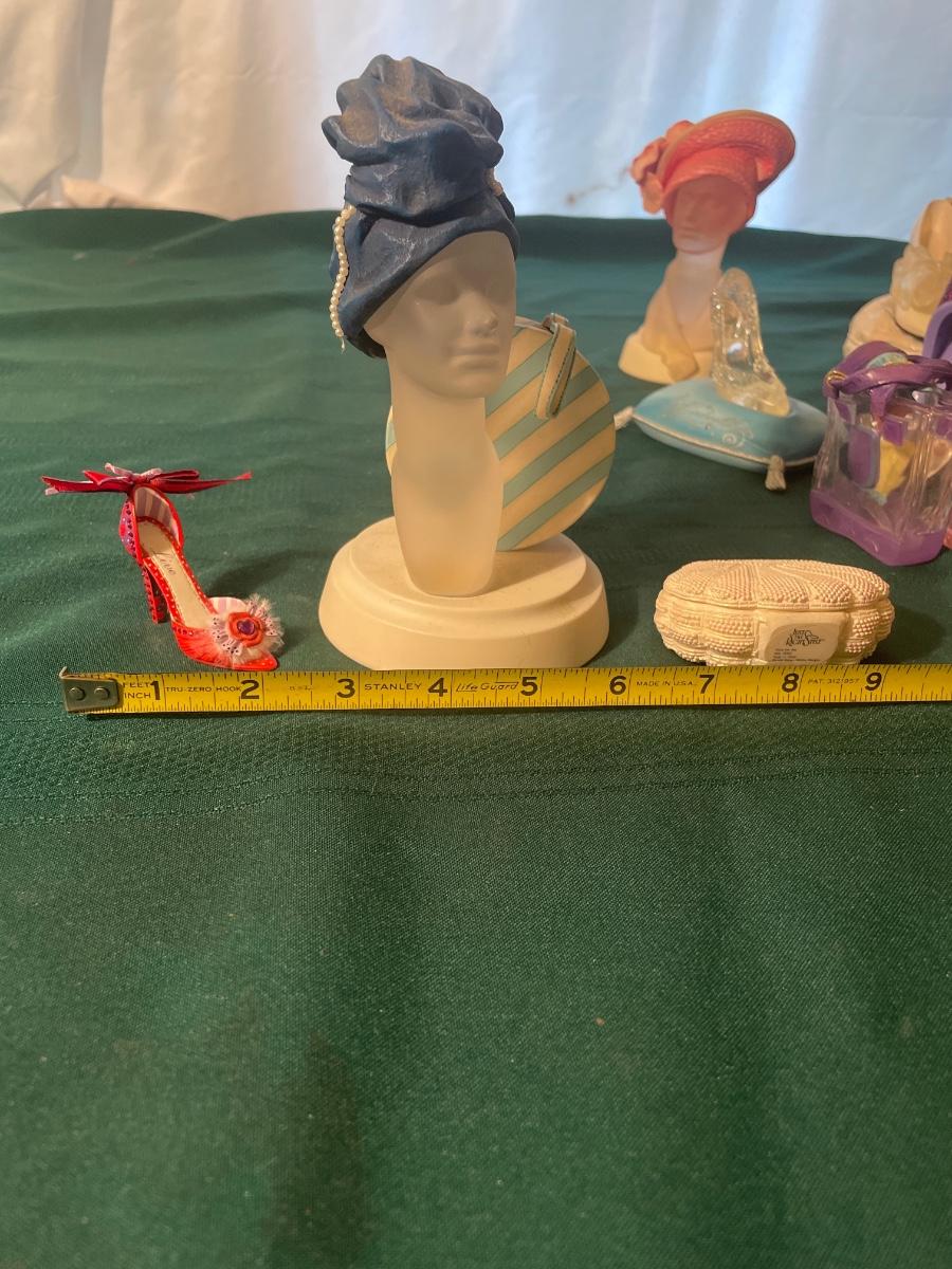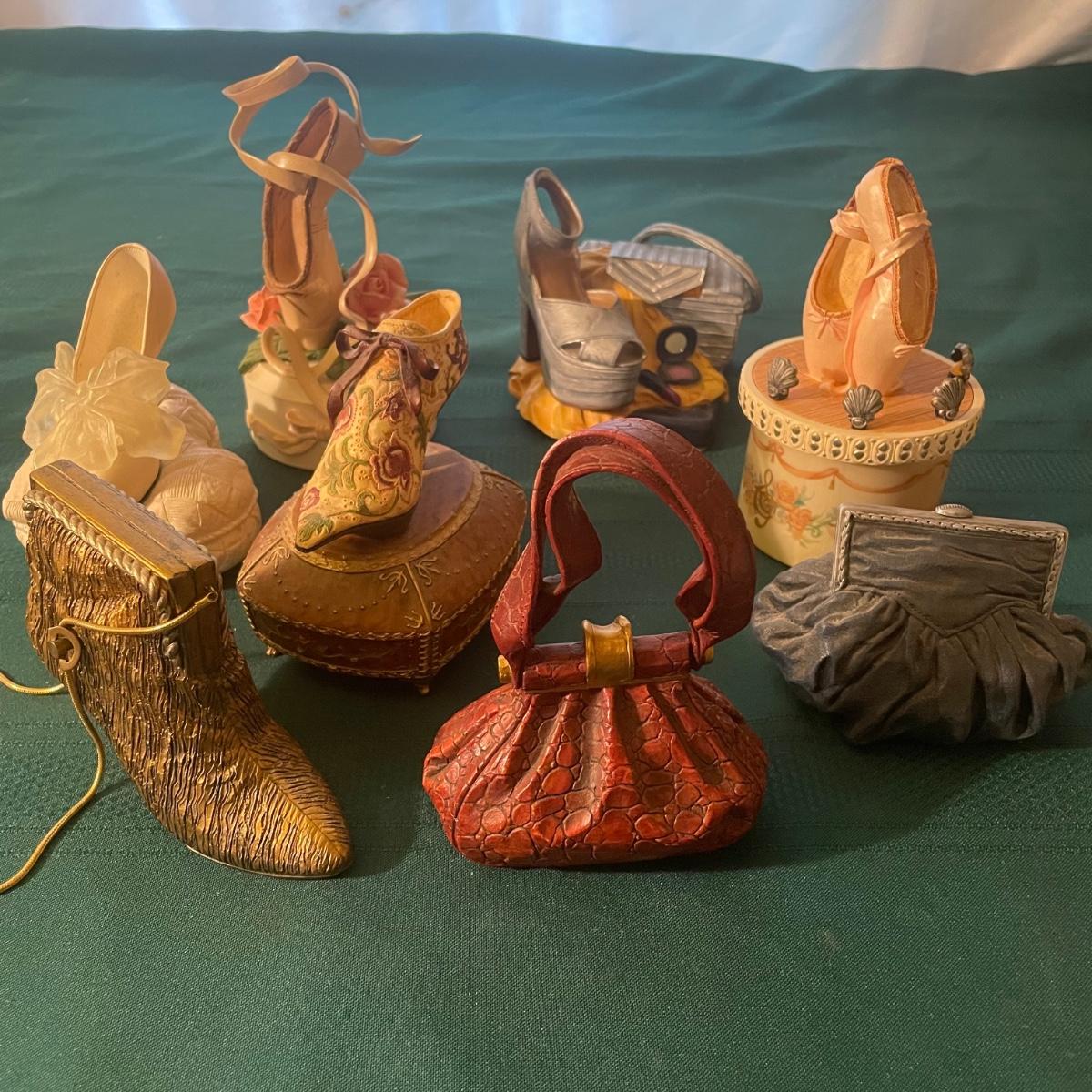 Note that two of the music boxes with black shoes have broken straps on the shoes and one bag’s chain handle is broken, all other items are in good condition; these prices are cold pressed porcelain whilst other items include metal, plastic and glass.