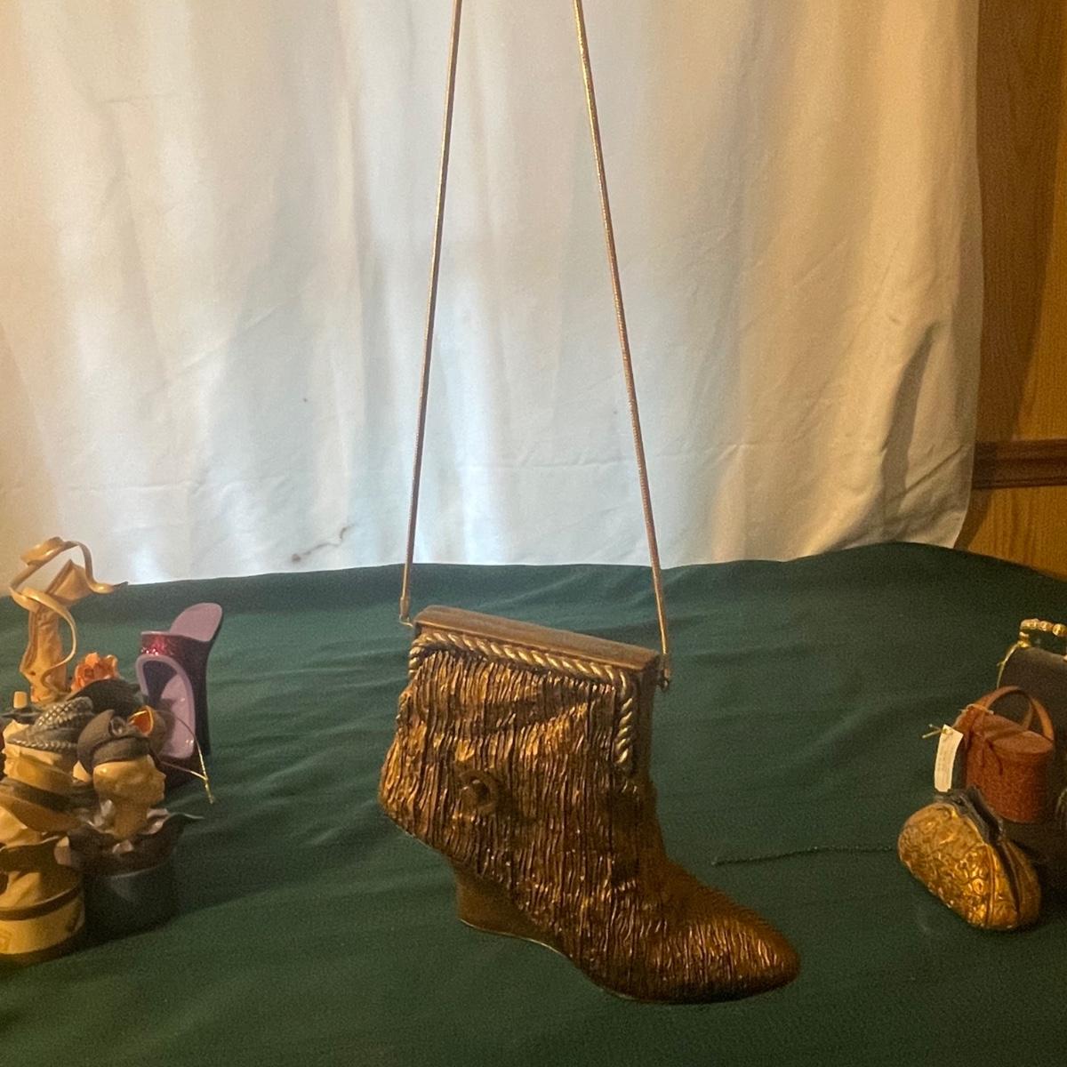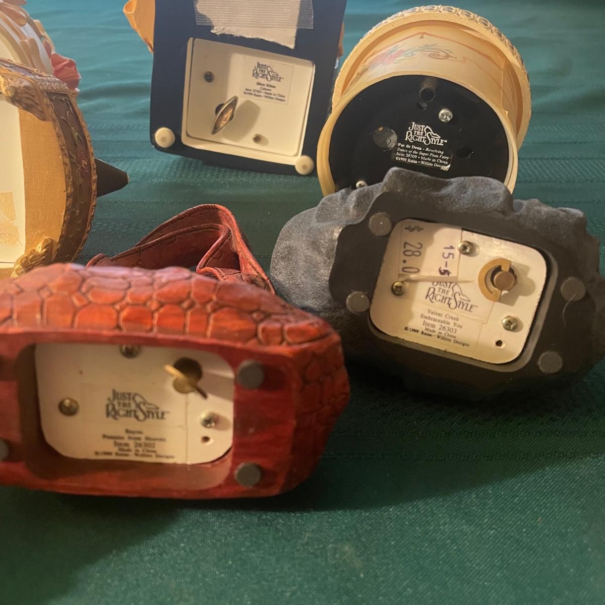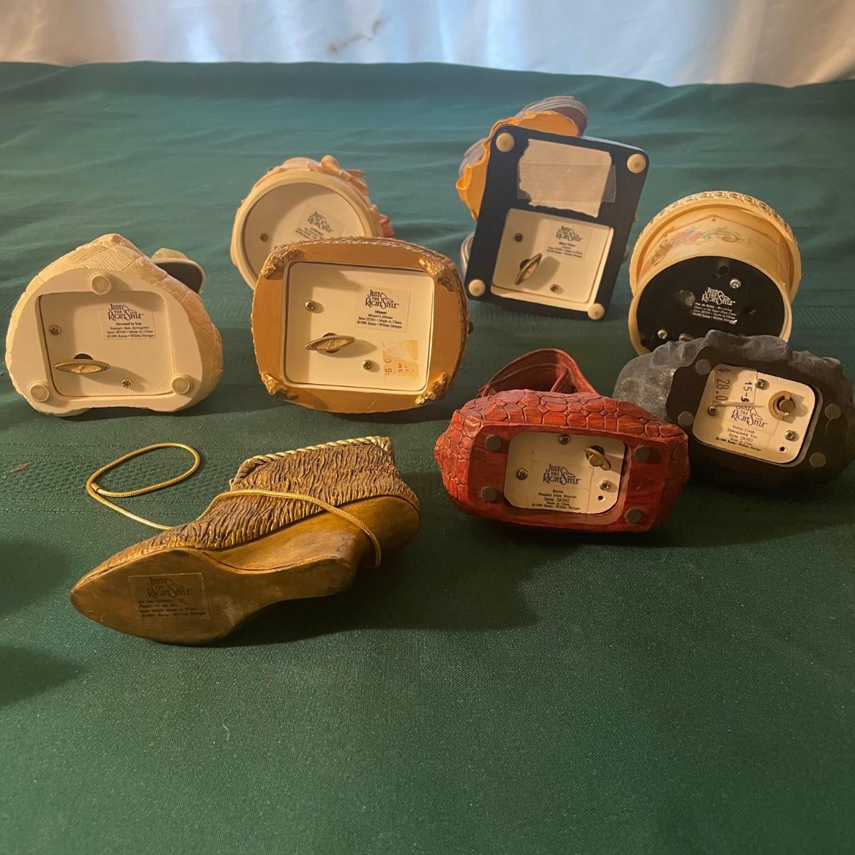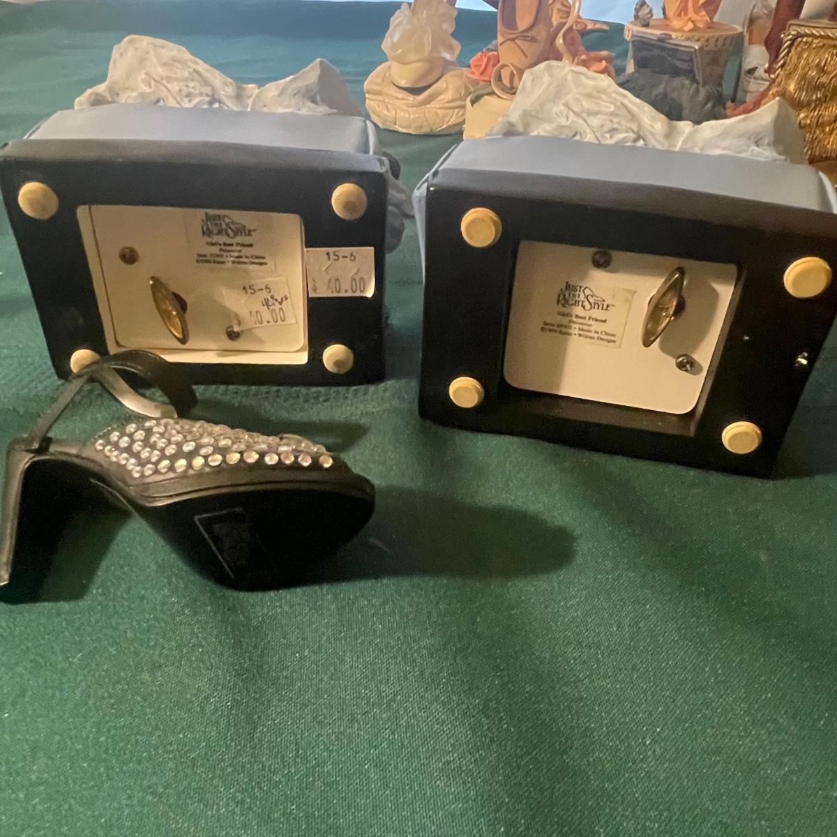 This large lot of keepsakes for shoe lovers includes lots of items from the “˜Just My Style’ collection with many being music boxes that all work and even 2 metal shoes that open up to be trinket boxes. Lots of other keepsakes, see images. The plinth like pink, purple and star shaped boxes appear to be designed for displaying a shoe.