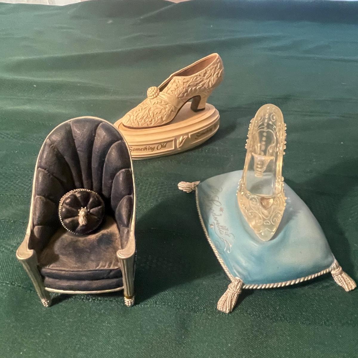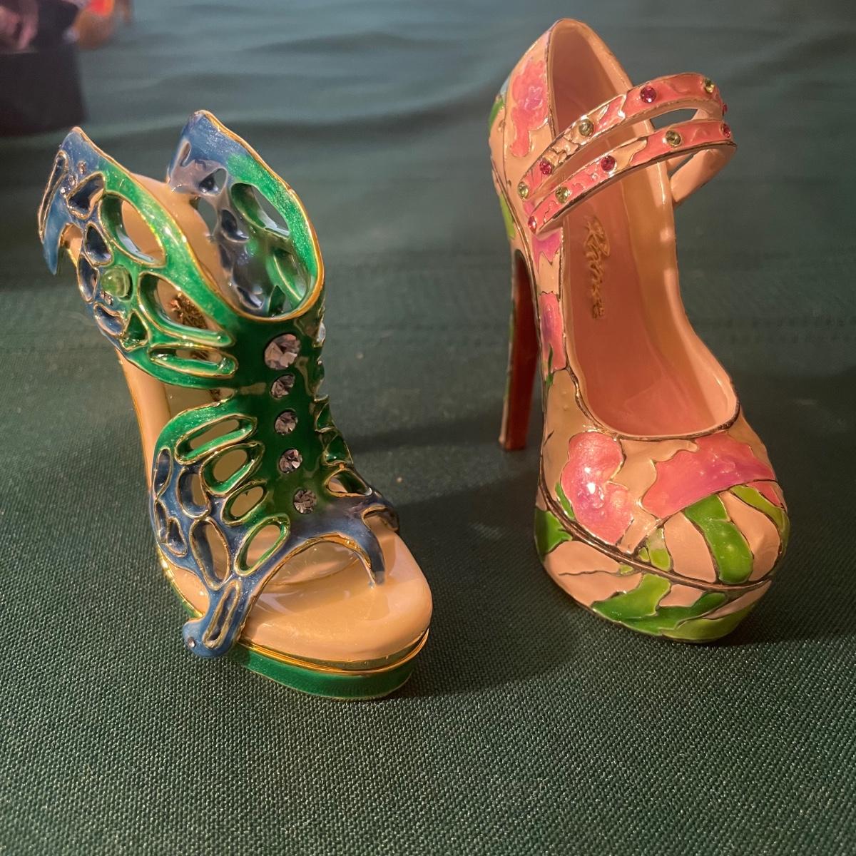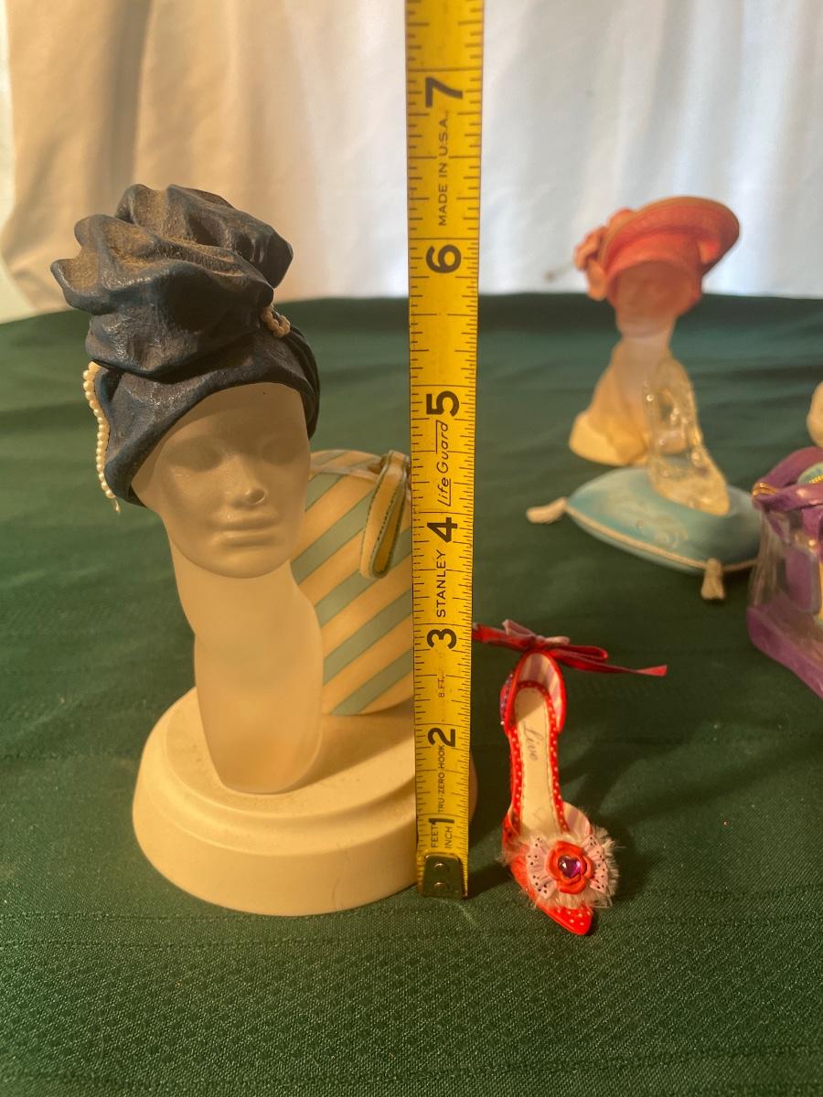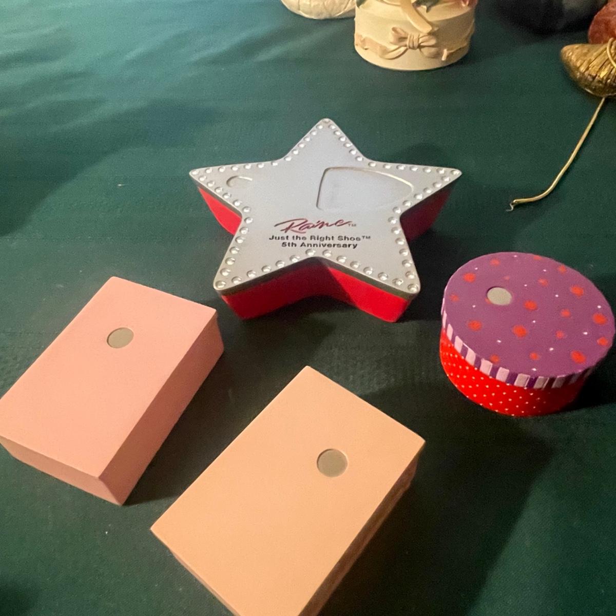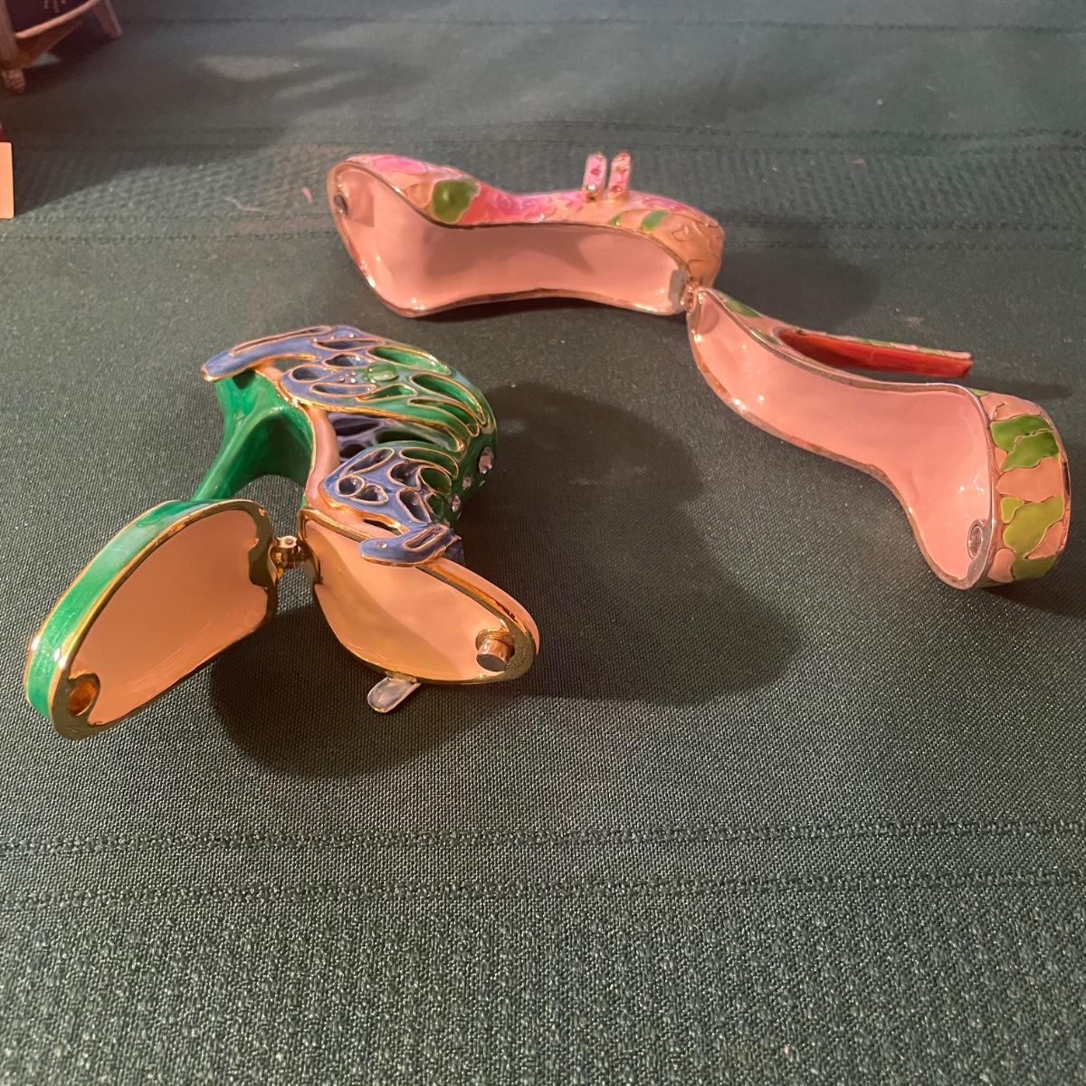 This large lot of keepsakes for shoe lovers includes lots of items from the “˜Just My Style’ collection with many being music boxes that all work and even 2 metal shoes that open up to be trinket boxes. Lots of other keepsakes, see images. The plinth like pink, purple and star shaped boxes appear to be designed for displaying a shoe.