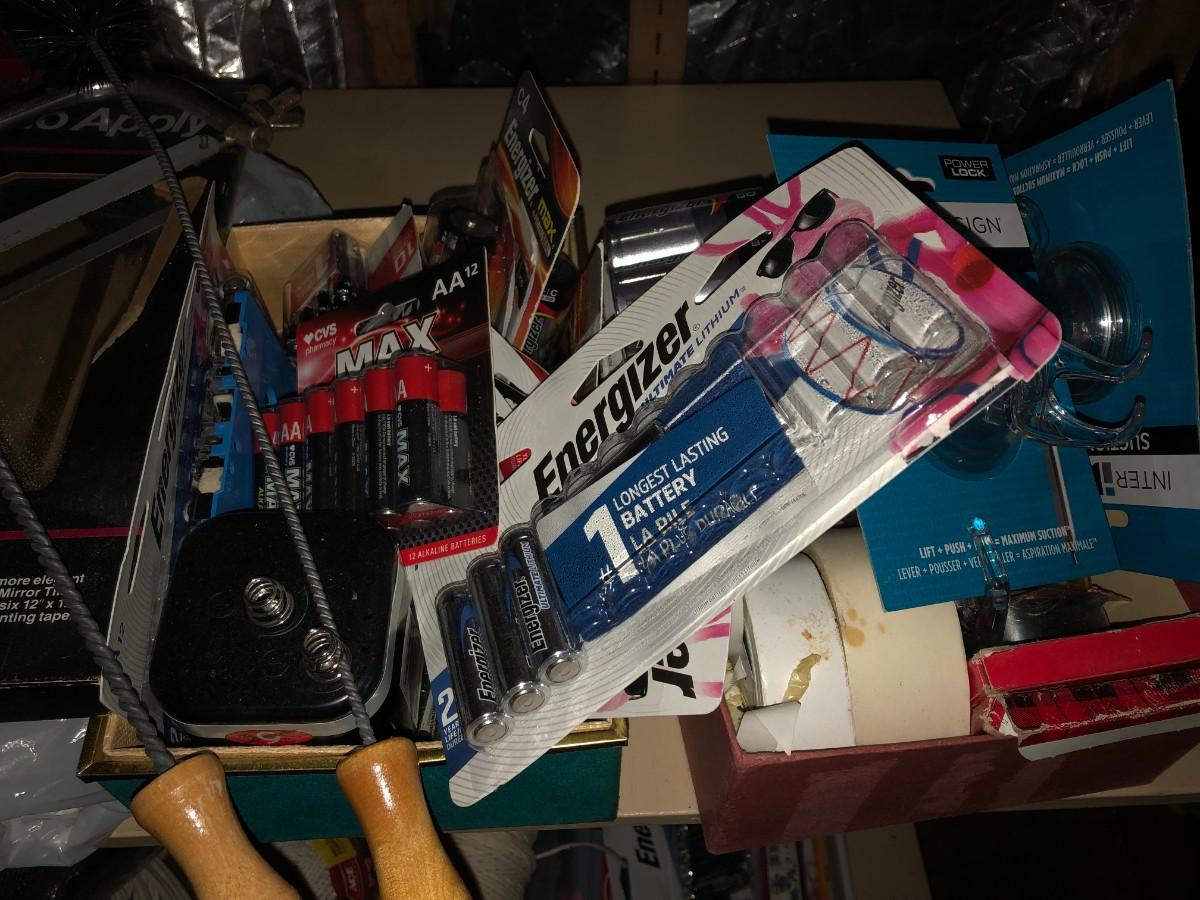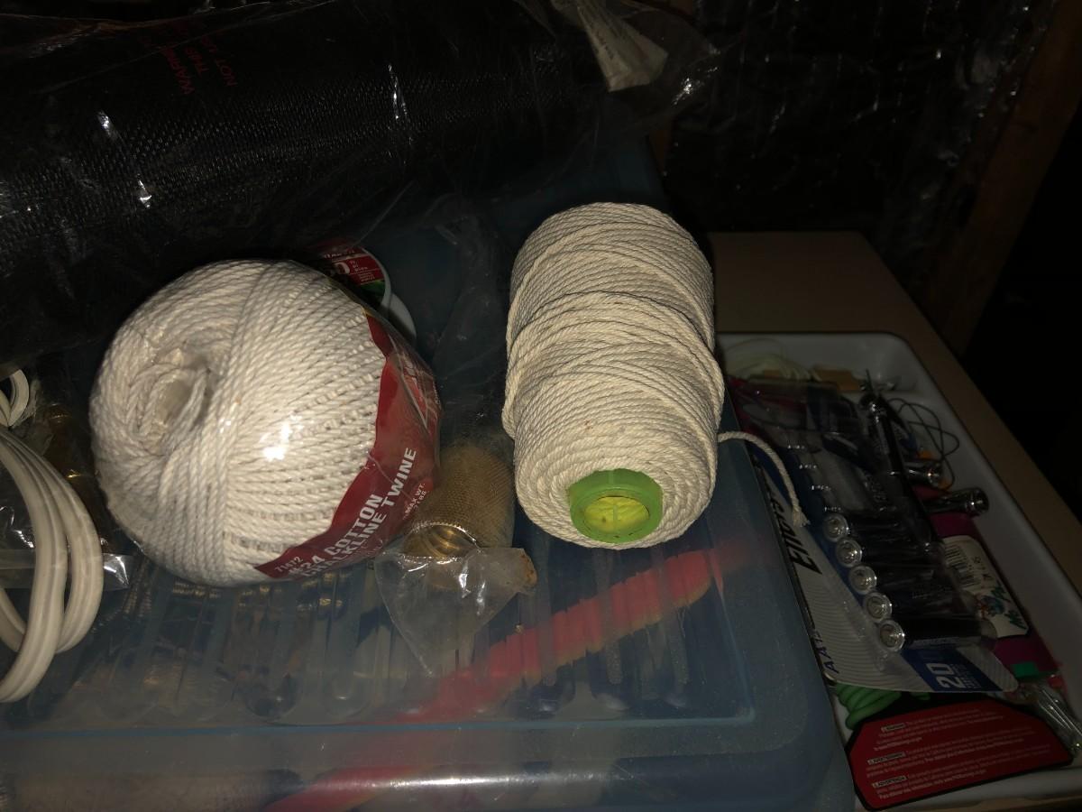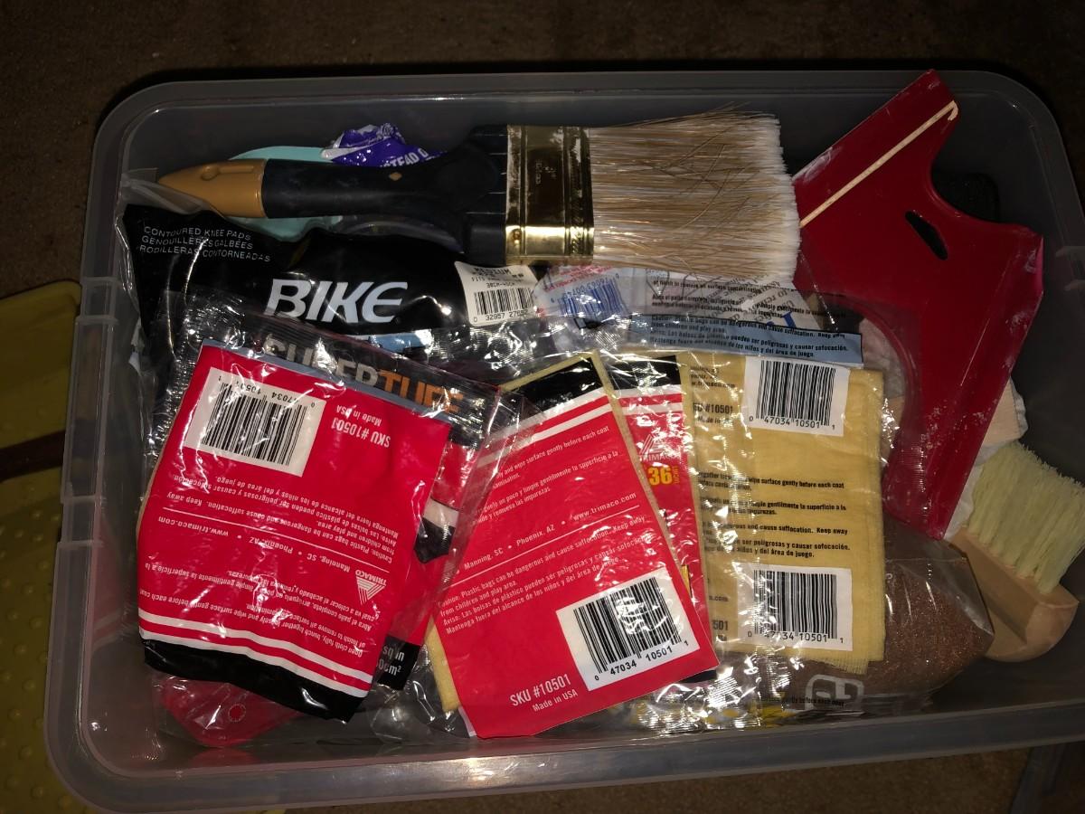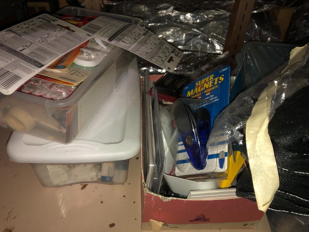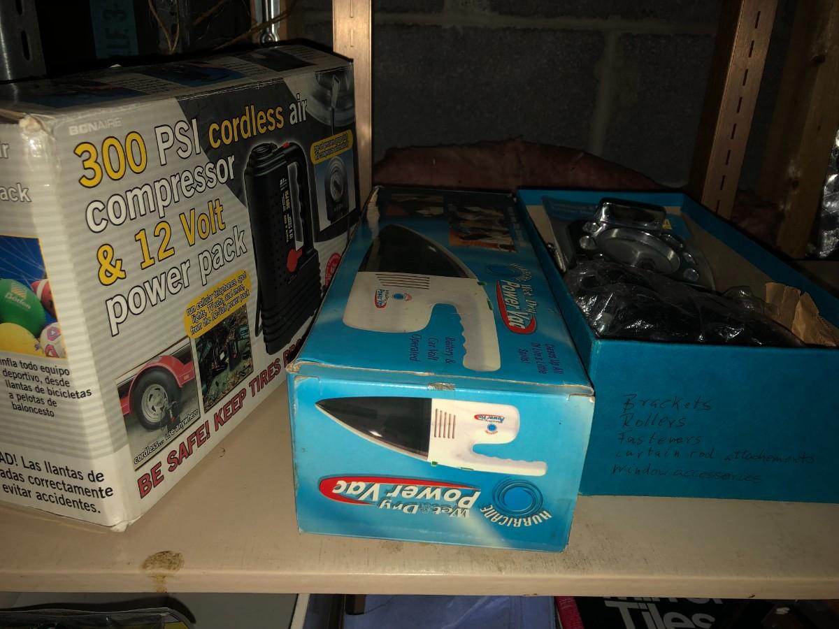 Buyer take ALL. Includes cordless compressor, batteries in package, hooks and clips, fasteners, twine, painting supplies (not paint) and much much more. Electronics and batteries untested.