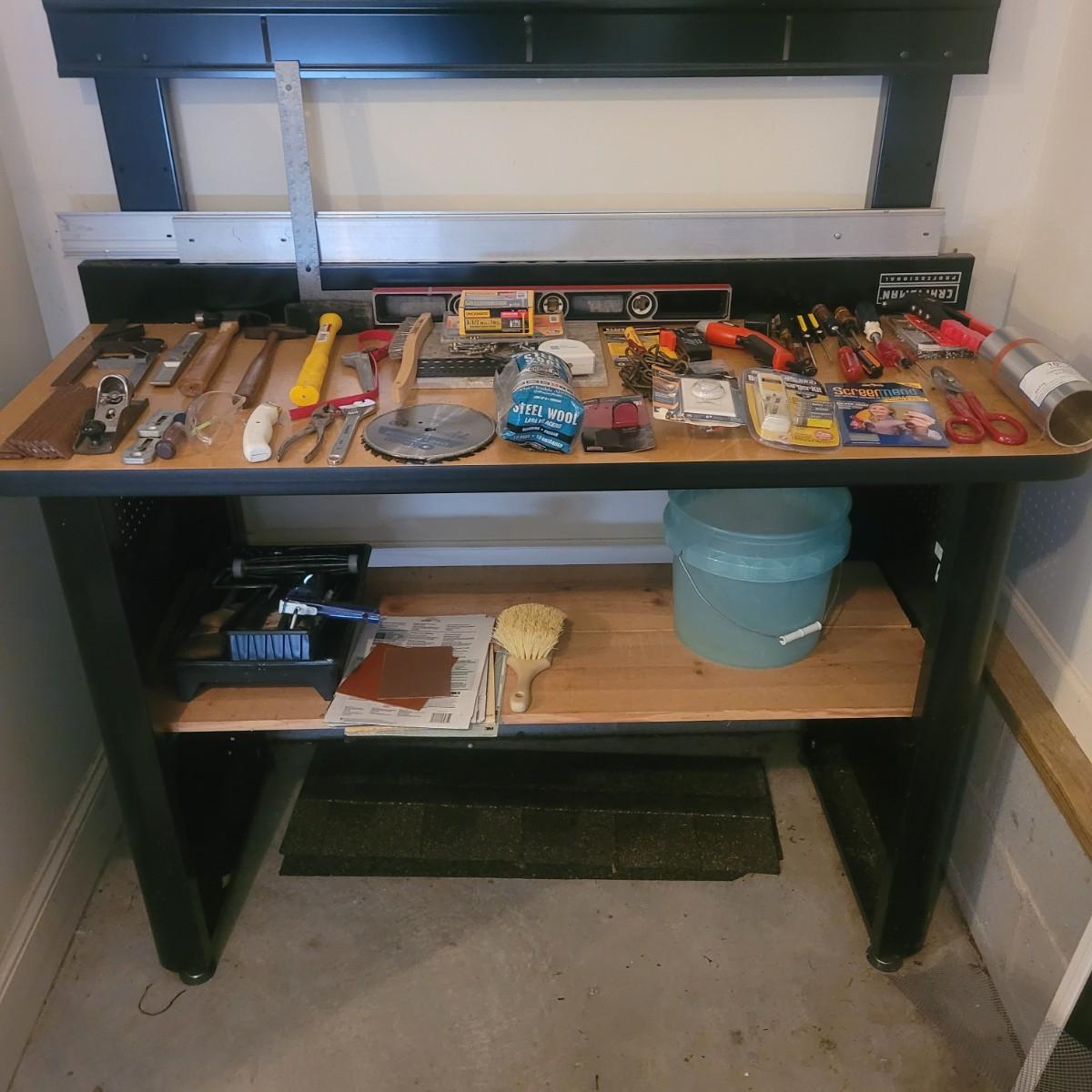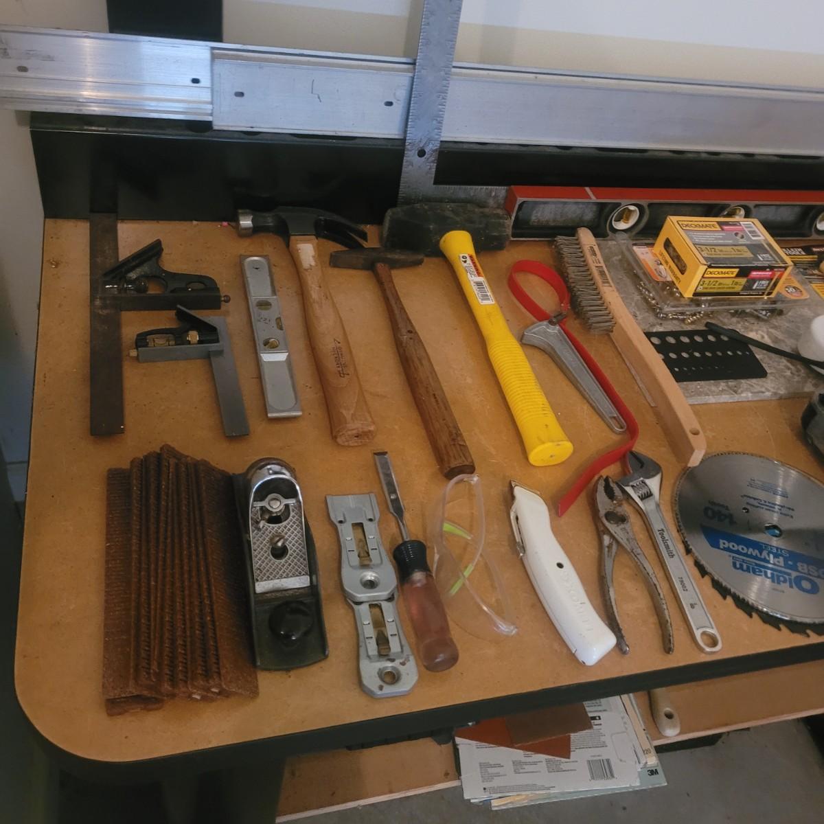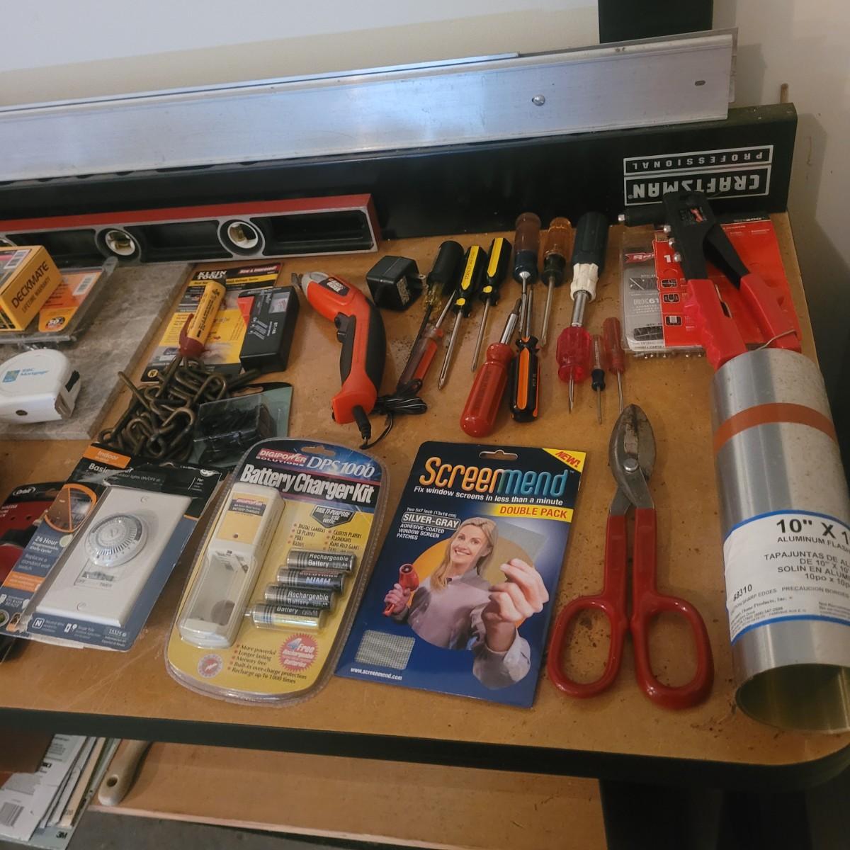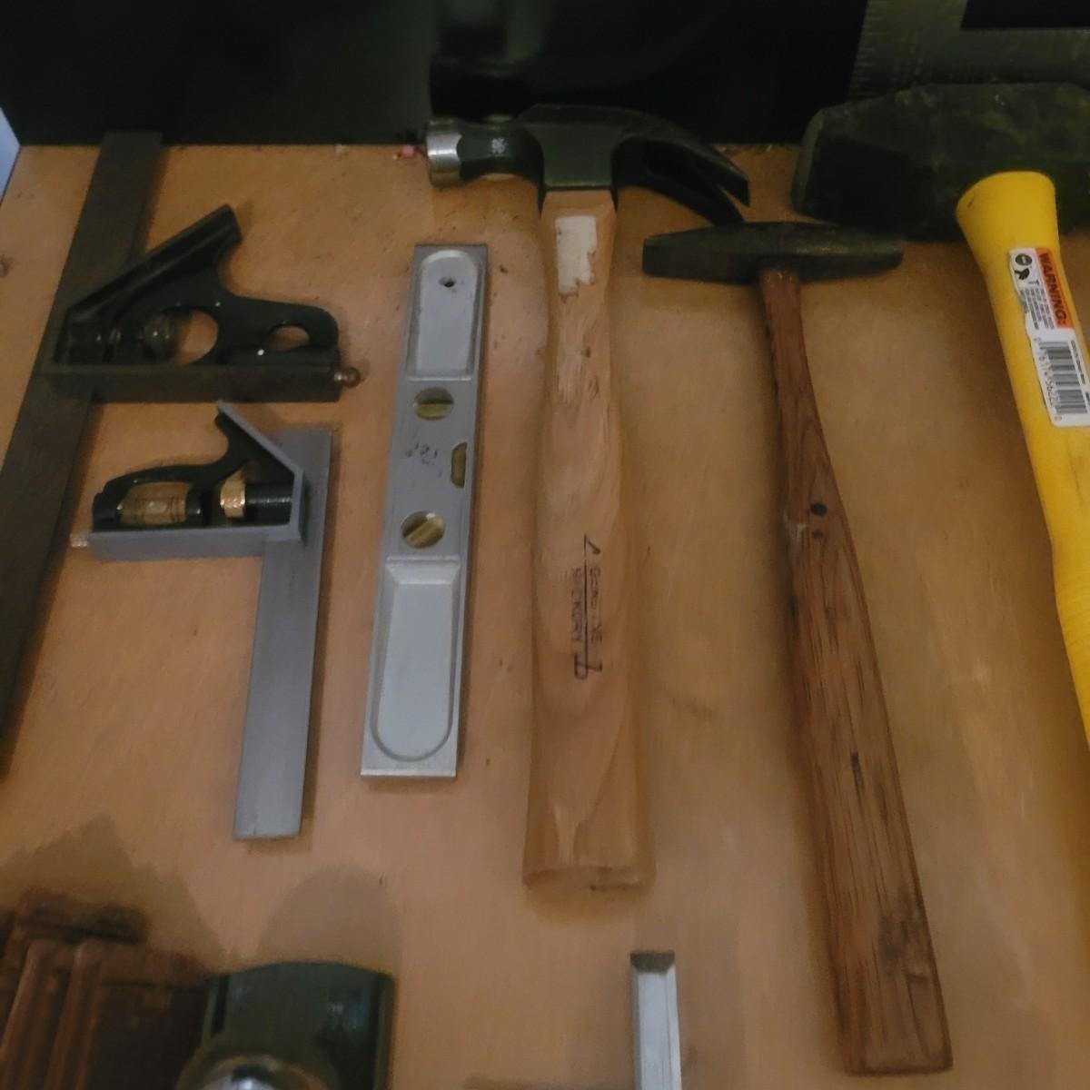 This lot is a variety of tools. Some of the main items include hammers, squares, level, chisels, knives, screwdrivers, snips, voltage testers, brushes, rivet tool, painting supplies, chains, tape measure, steel wool, and buckets. Tool shelf sold in a separate lot.