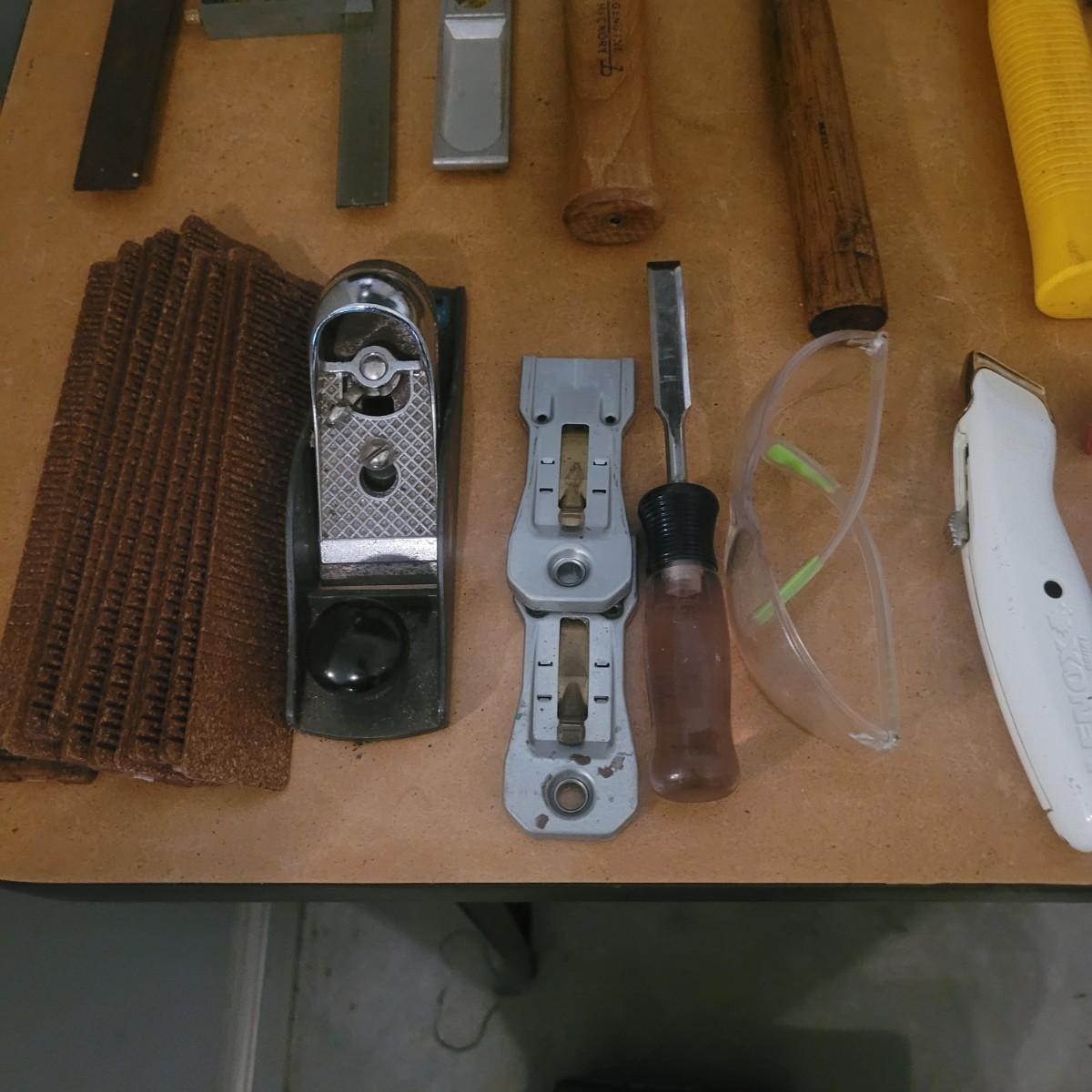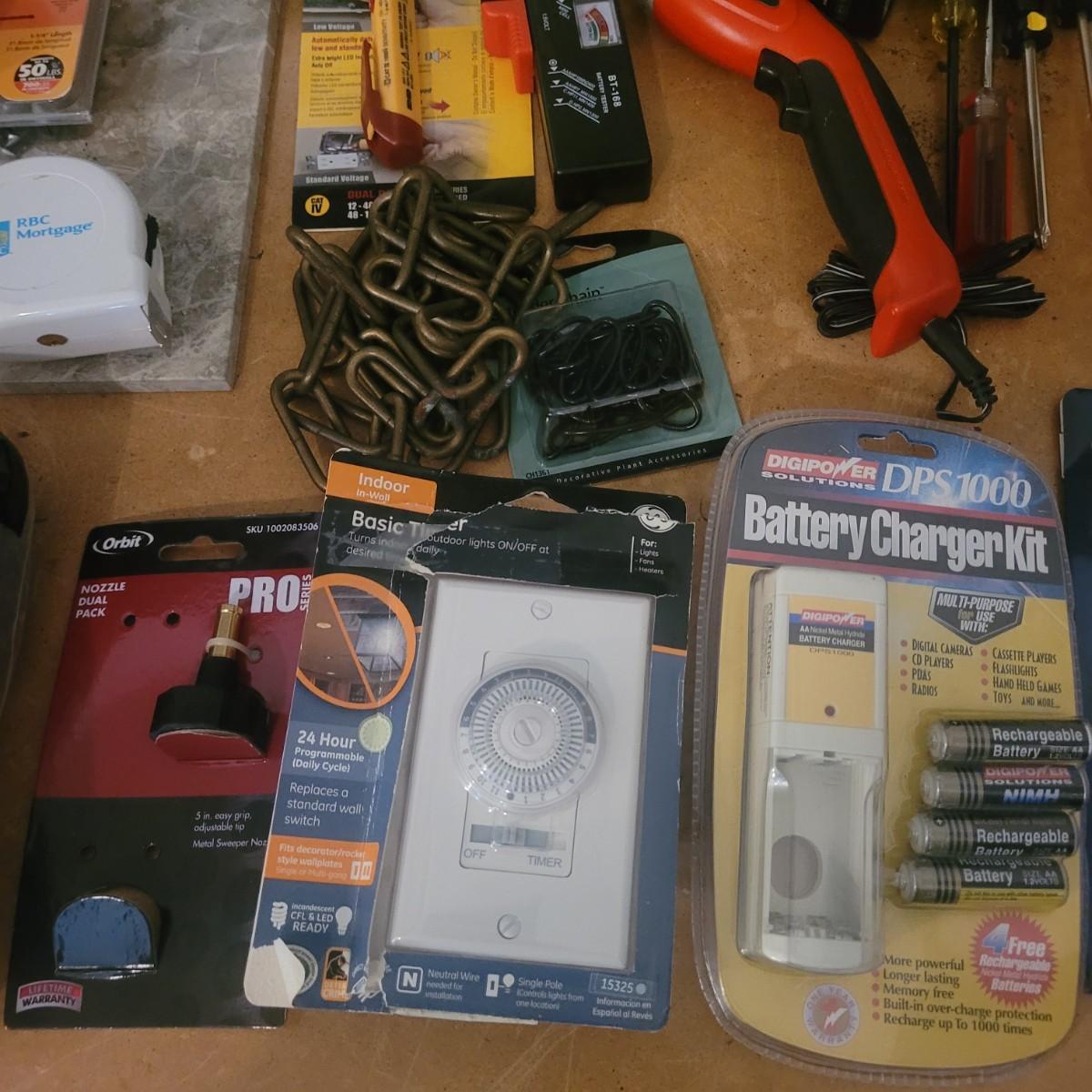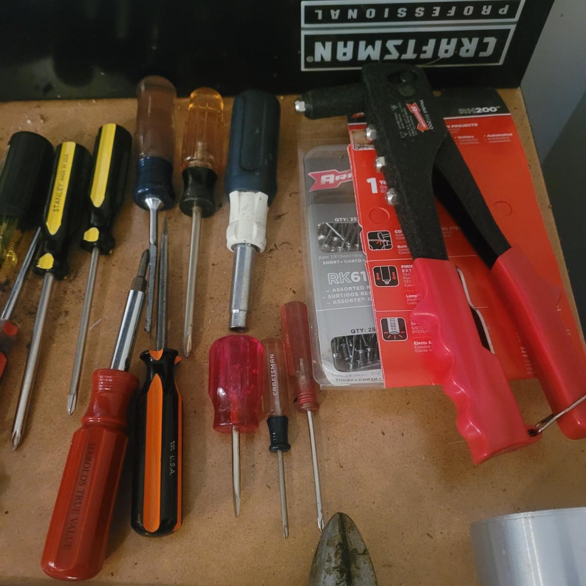 This lot is a variety of tools. Some of the main items include hammers, squares, level, chisels, knives, screwdrivers, snips, voltage testers, brushes, rivet tool, painting supplies, chains, tape measure, steel wool, and buckets. Tool shelf sold in a separate lot.