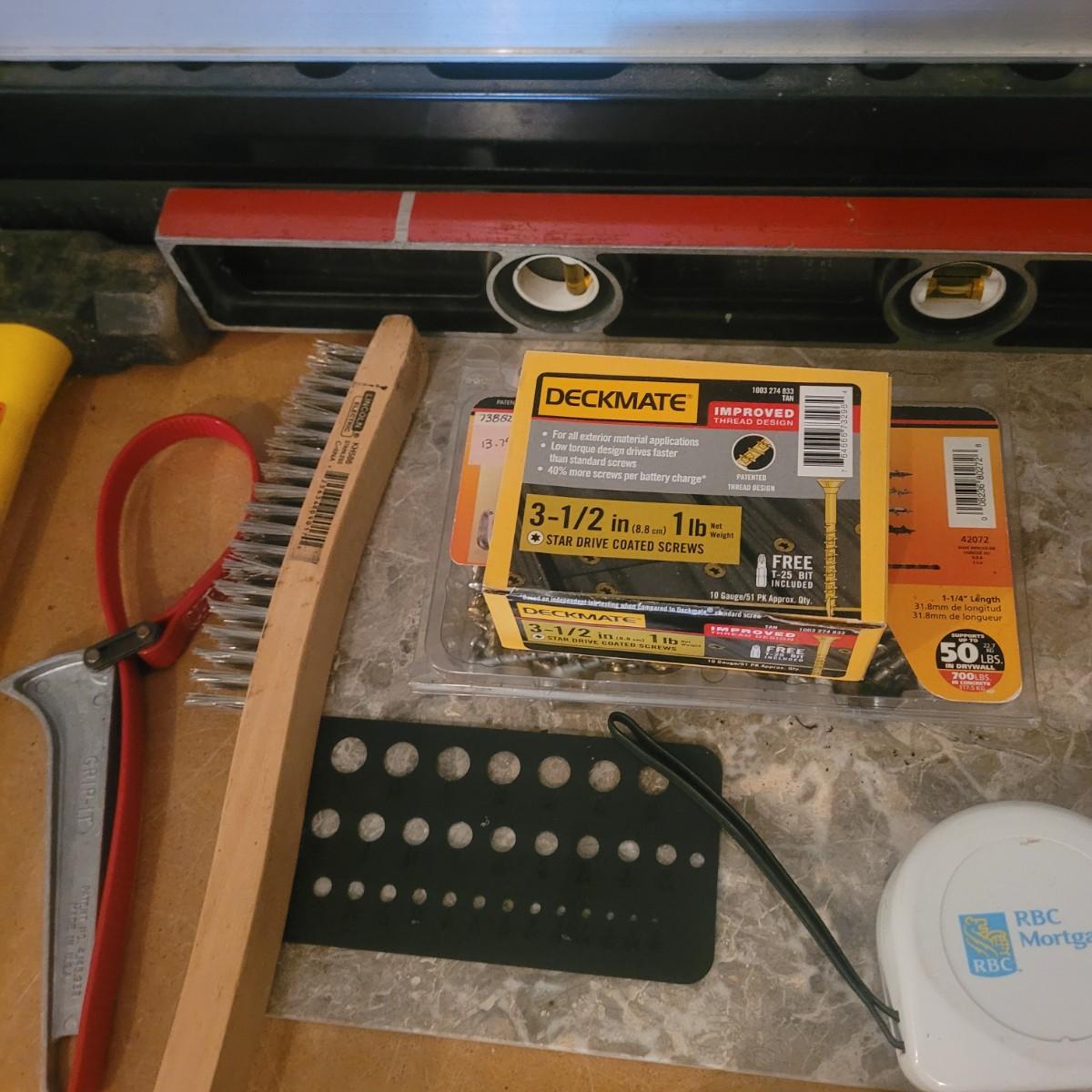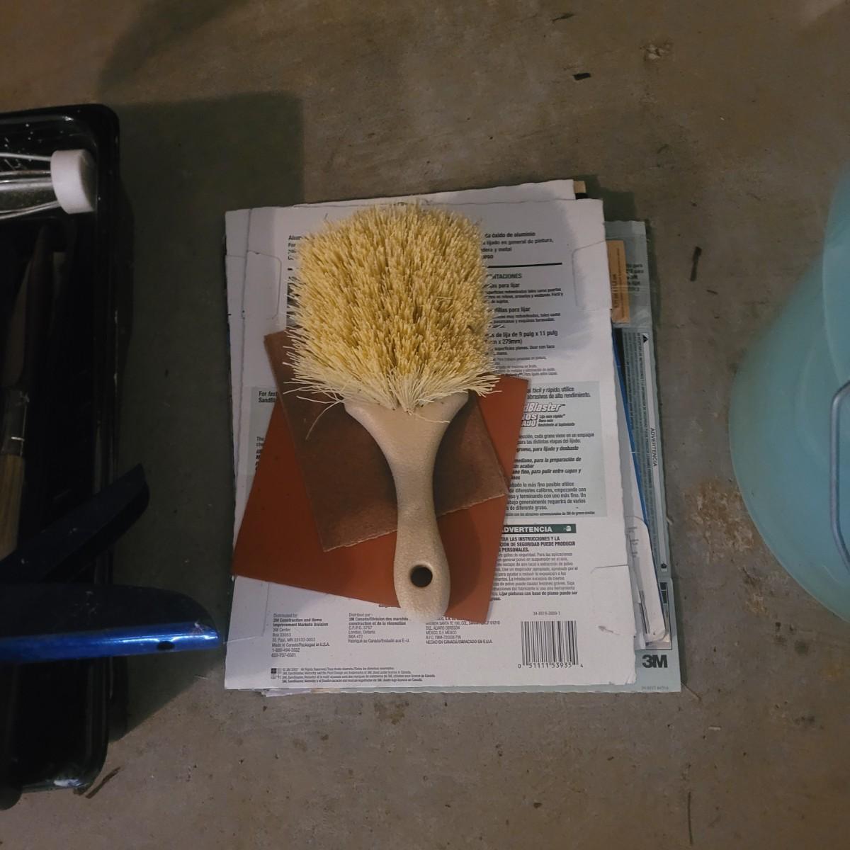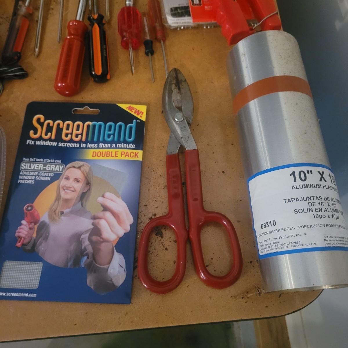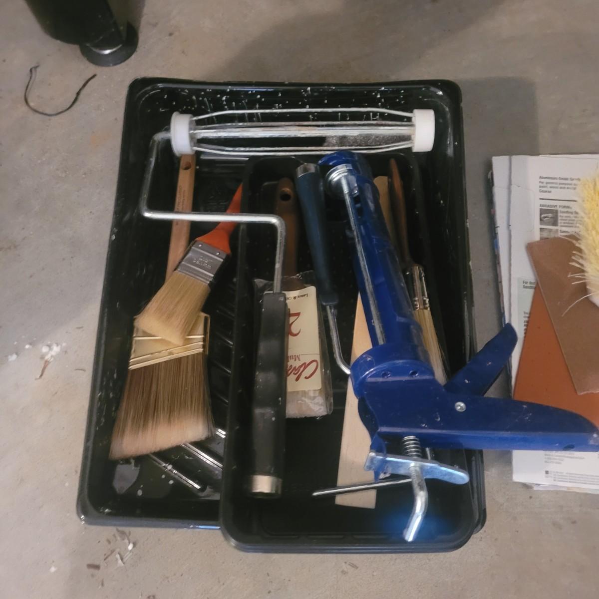 This lot is a variety of tools. Some of the main items include hammers, squares, level, chisels, knives, screwdrivers, snips, voltage testers, brushes, rivet tool, painting supplies, chains, tape measure, steel wool, and buckets. Tool shelf sold in a separate lot.
