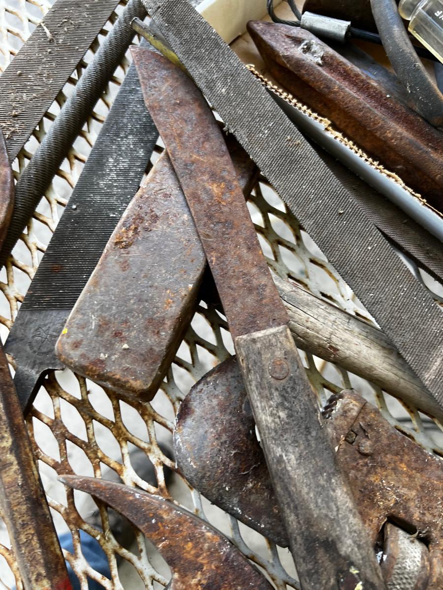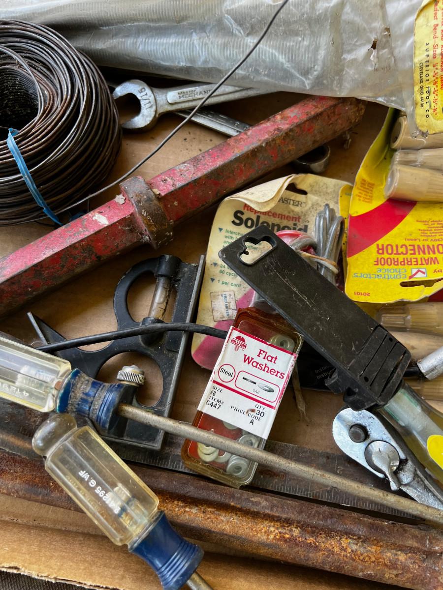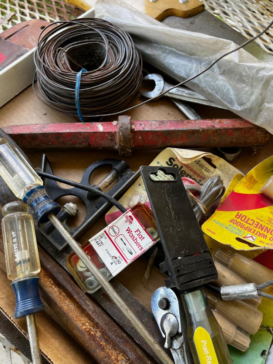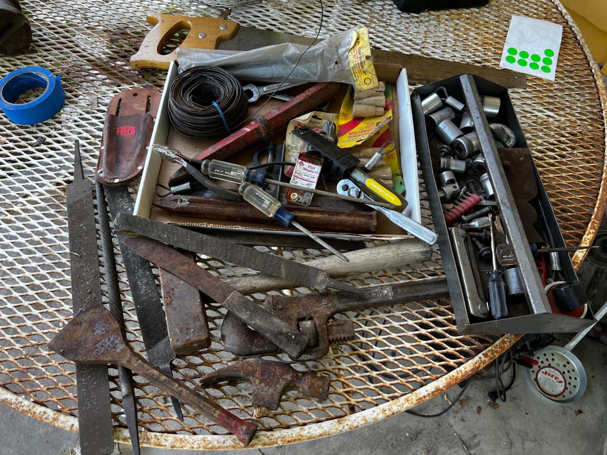 Large Lot of Tools; Sledge Hammer, Wrenches, Saw, Files, Wire.