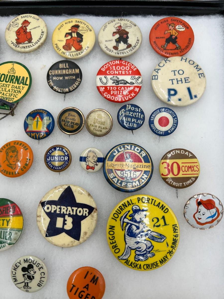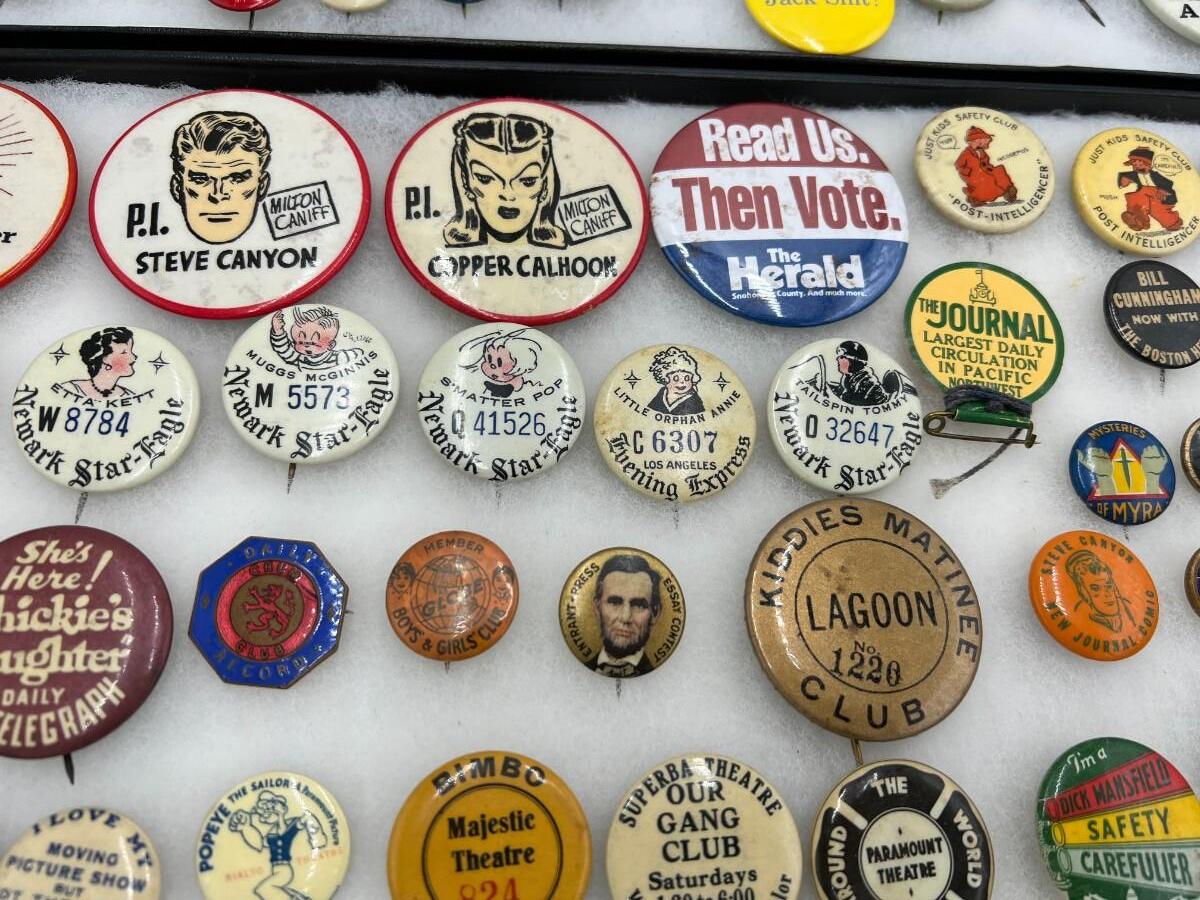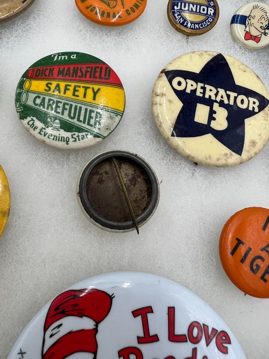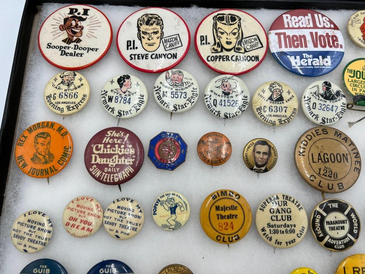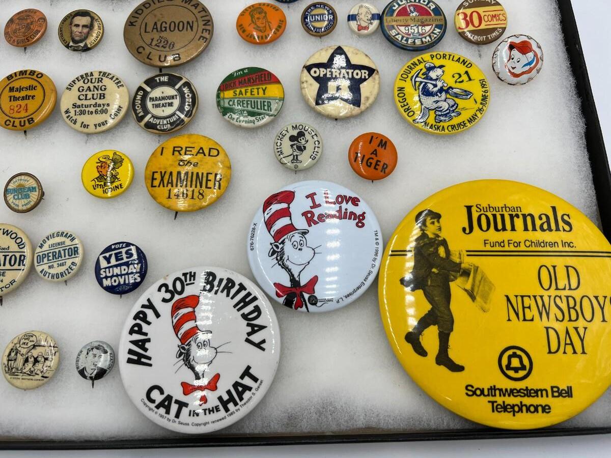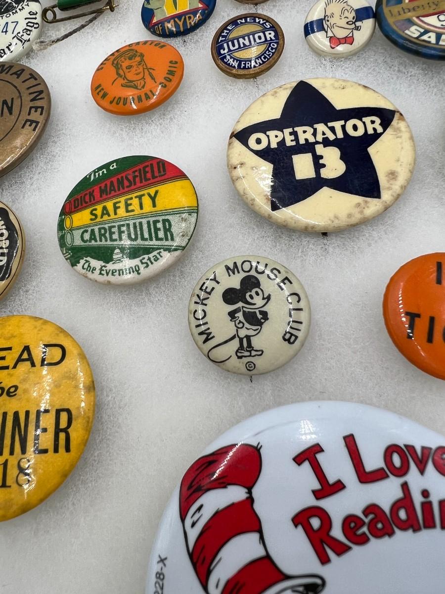 Large Lot of Vintage and Antique Buttons and Pins Related to Books, Comics, Cartoons, TV and Movies. Includes buttons and pin-backs related to Dr Suess, Casper the Friendly Ghost, Mickey Mouse Club, Hollywood Operator, Maryland Theatre Klub, Majestic Theatre, Newark Star Eagle, Evening Express, P.I. Steve Canyon, P.I. Copper Calhoon, P.I. Sooper Dooper Dealer, Liberty Magazine, a variety of "I'm The Guy", and Just Kids Safety Club.