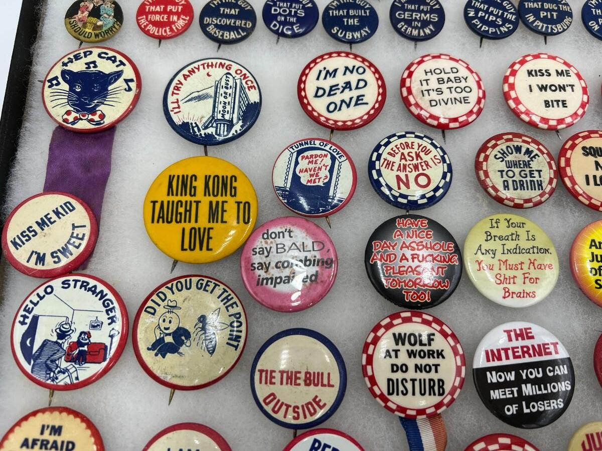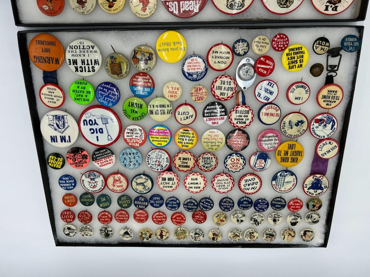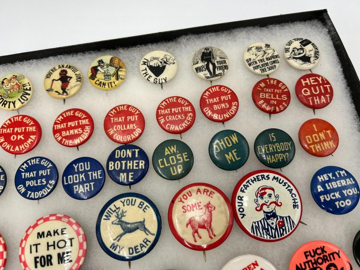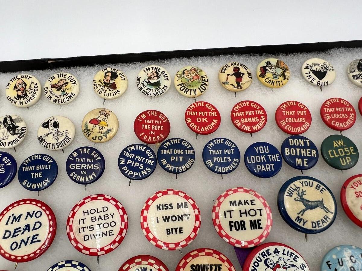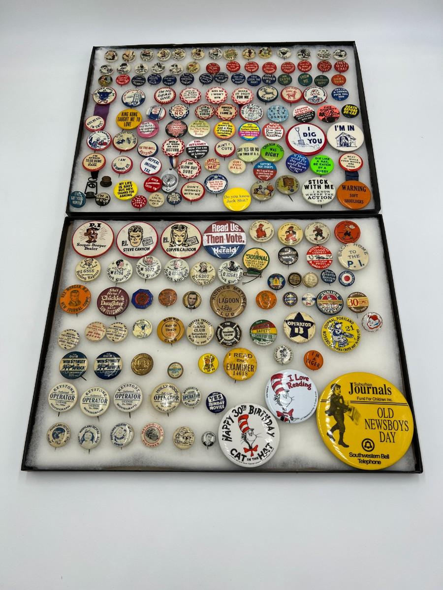 Large Lot of Vintage and Antique Buttons and Pins Related to Books, Comics, Cartoons, TV and Movies. Includes buttons and pin-backs related to Dr Suess, Casper the Friendly Ghost, Mickey Mouse Club, Hollywood Operator, Maryland Theatre Klub, Majestic Theatre, Newark Star Eagle, Evening Express, P.I. Steve Canyon, P.I. Copper Calhoon, P.I. Sooper Dooper Dealer, Liberty Magazine, a variety of "I'm The Guy", and Just Kids Safety Club.