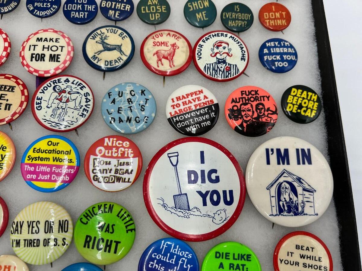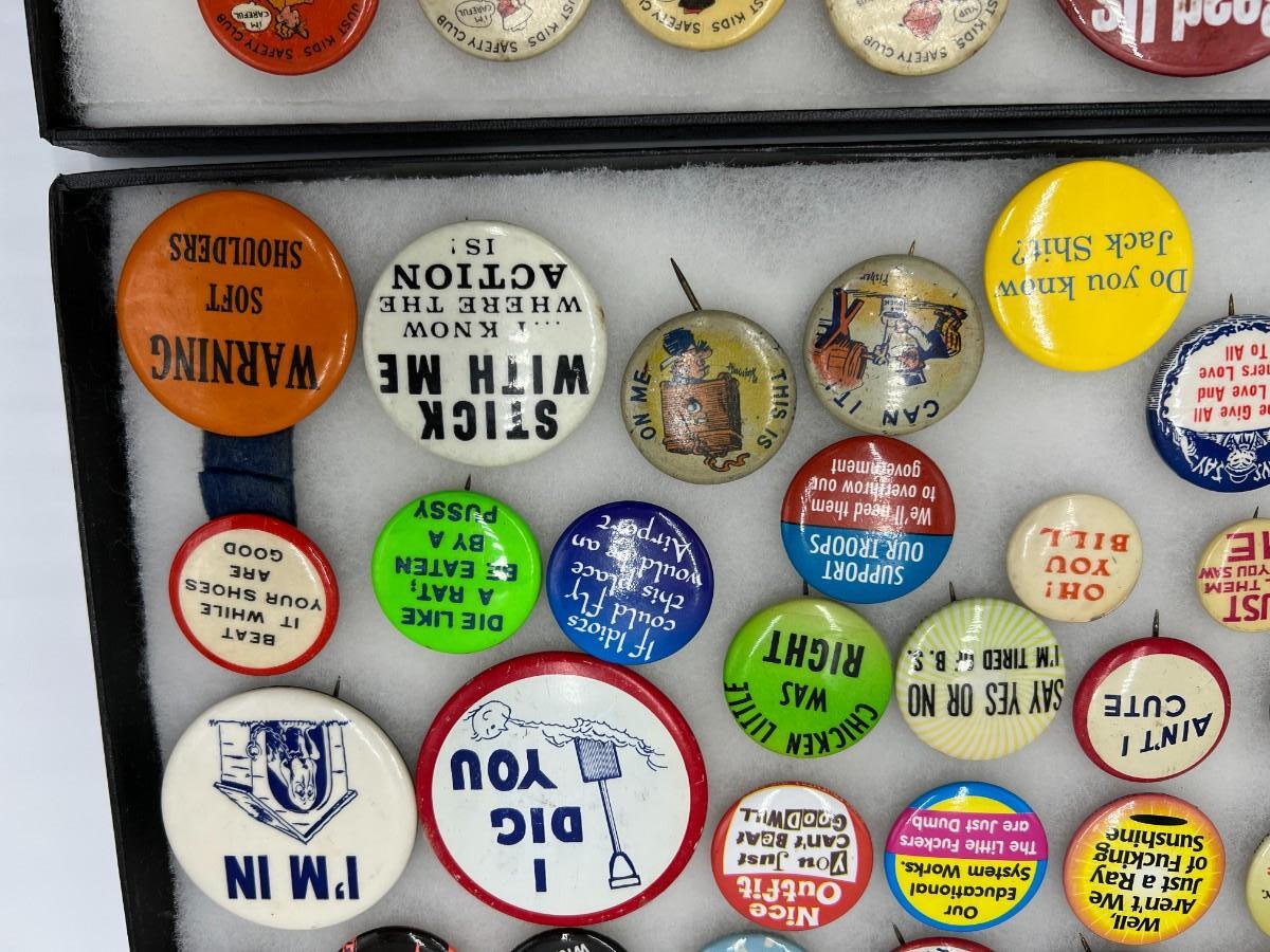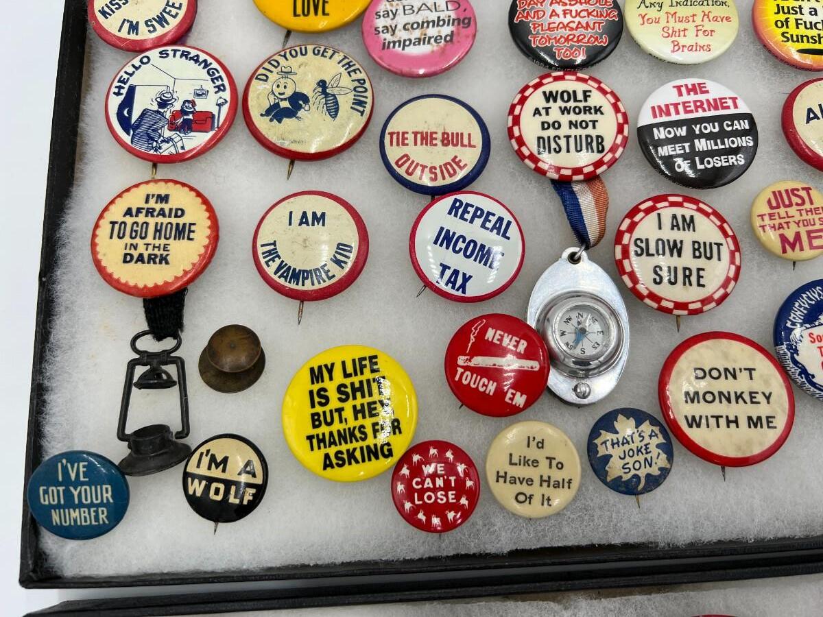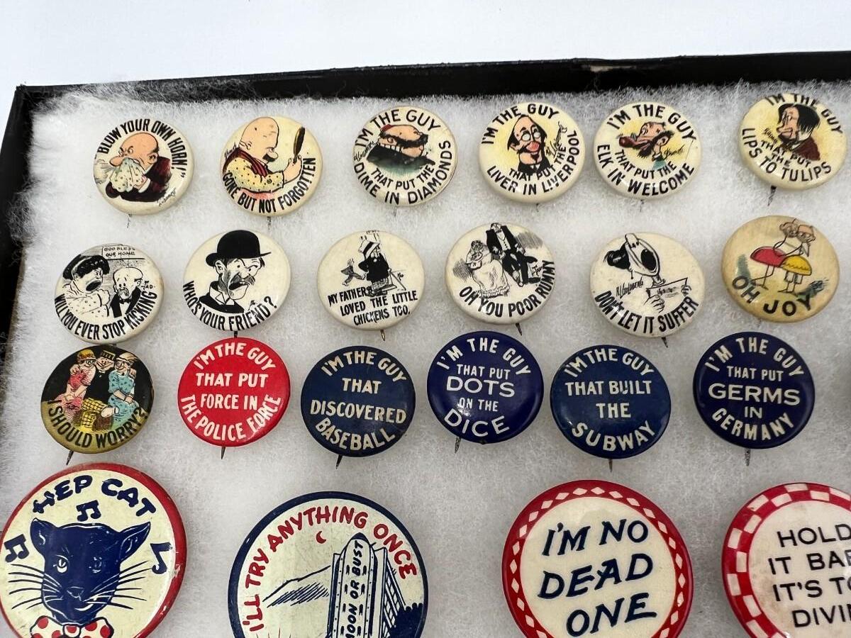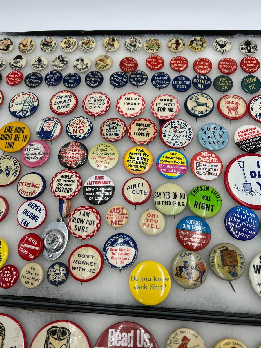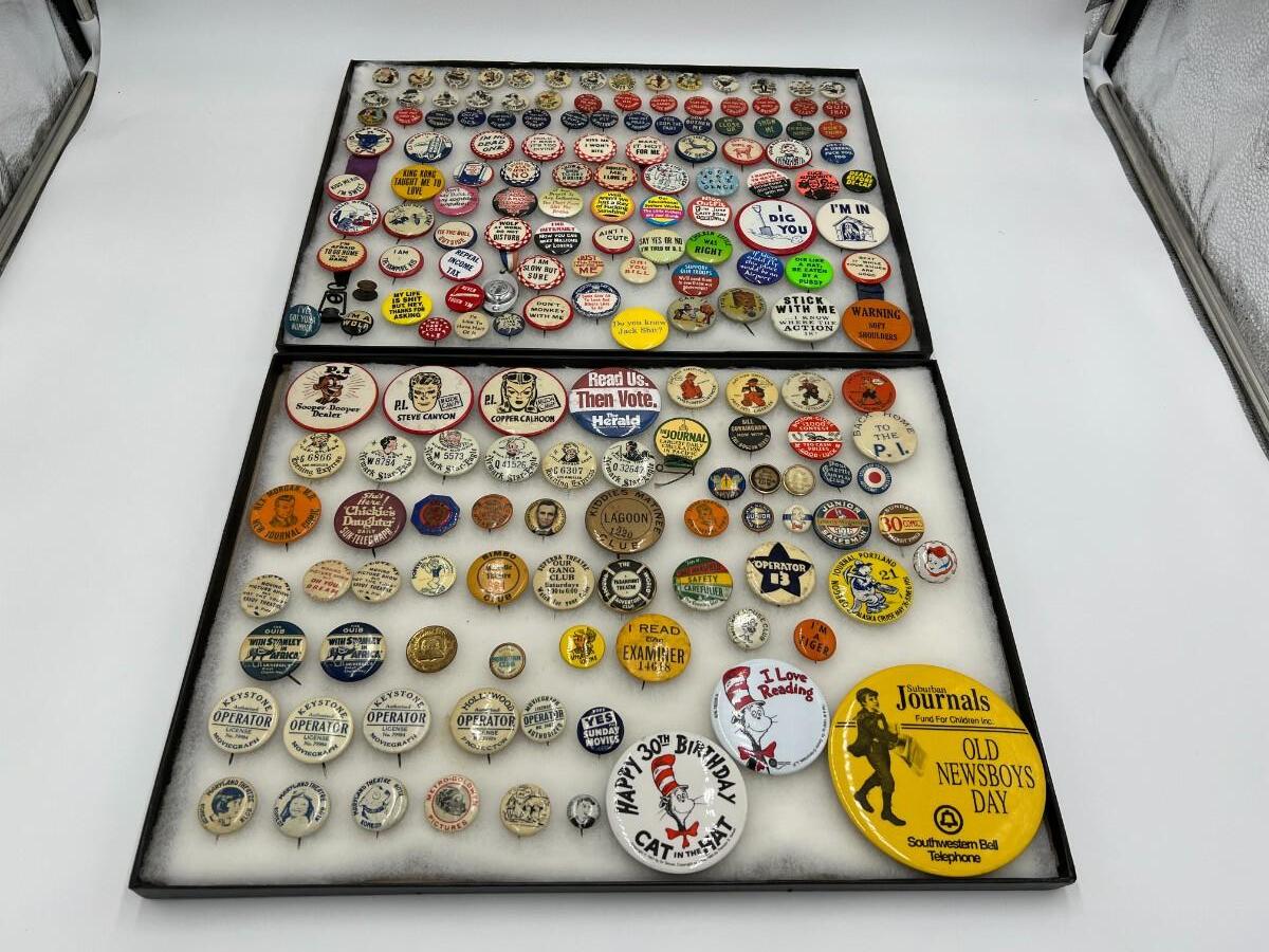 Large Lot of Vintage and Antique Buttons and Pins Related to Books, Comics, Cartoons, TV and Movies. Includes buttons and pin-backs related to Dr Suess, Casper the Friendly Ghost, Mickey Mouse Club, Hollywood Operator, Maryland Theatre Klub, Majestic Theatre, Newark Star Eagle, Evening Express, P.I. Steve Canyon, P.I. Copper Calhoon, P.I. Sooper Dooper Dealer, Liberty Magazine, a variety of "I'm The Guy", and Just Kids Safety Club.
