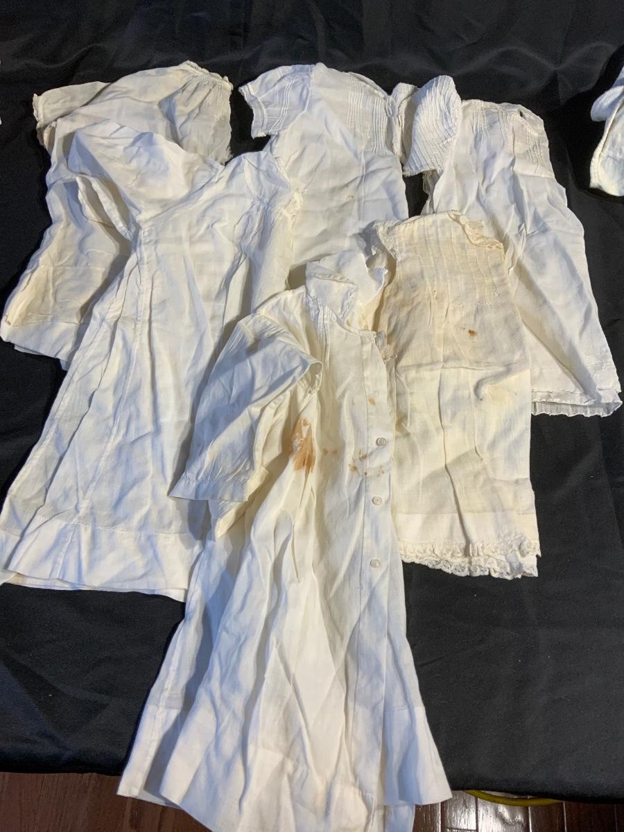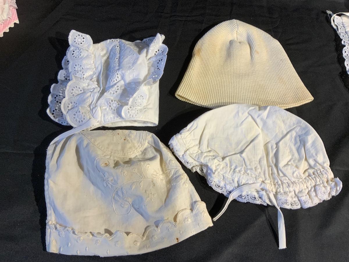 Large lot of vintage baby clothes. Very delicate, Much staining and tears in fabric as fabric if very thin. Includes Bonnets, Bibs, Diaper covers and gowns. And more