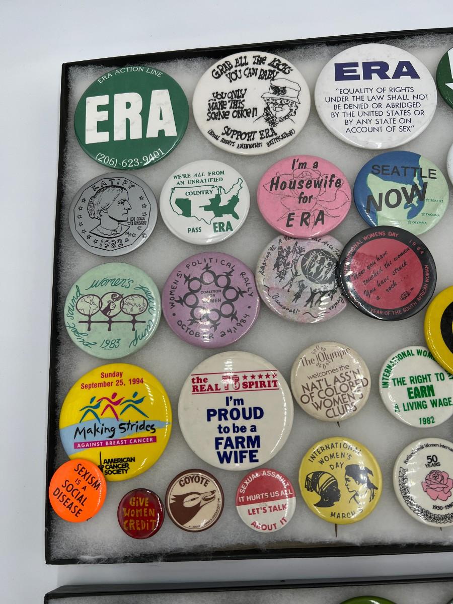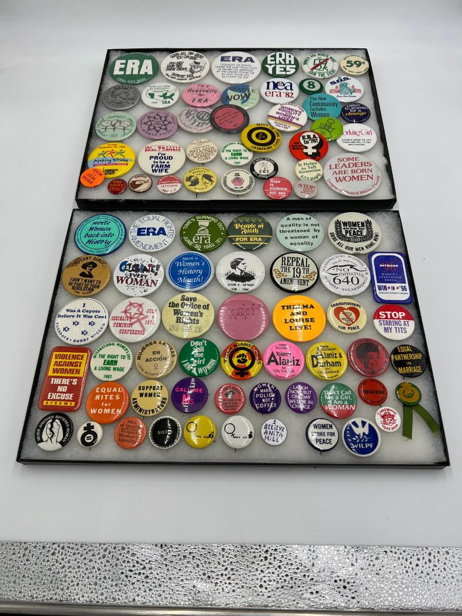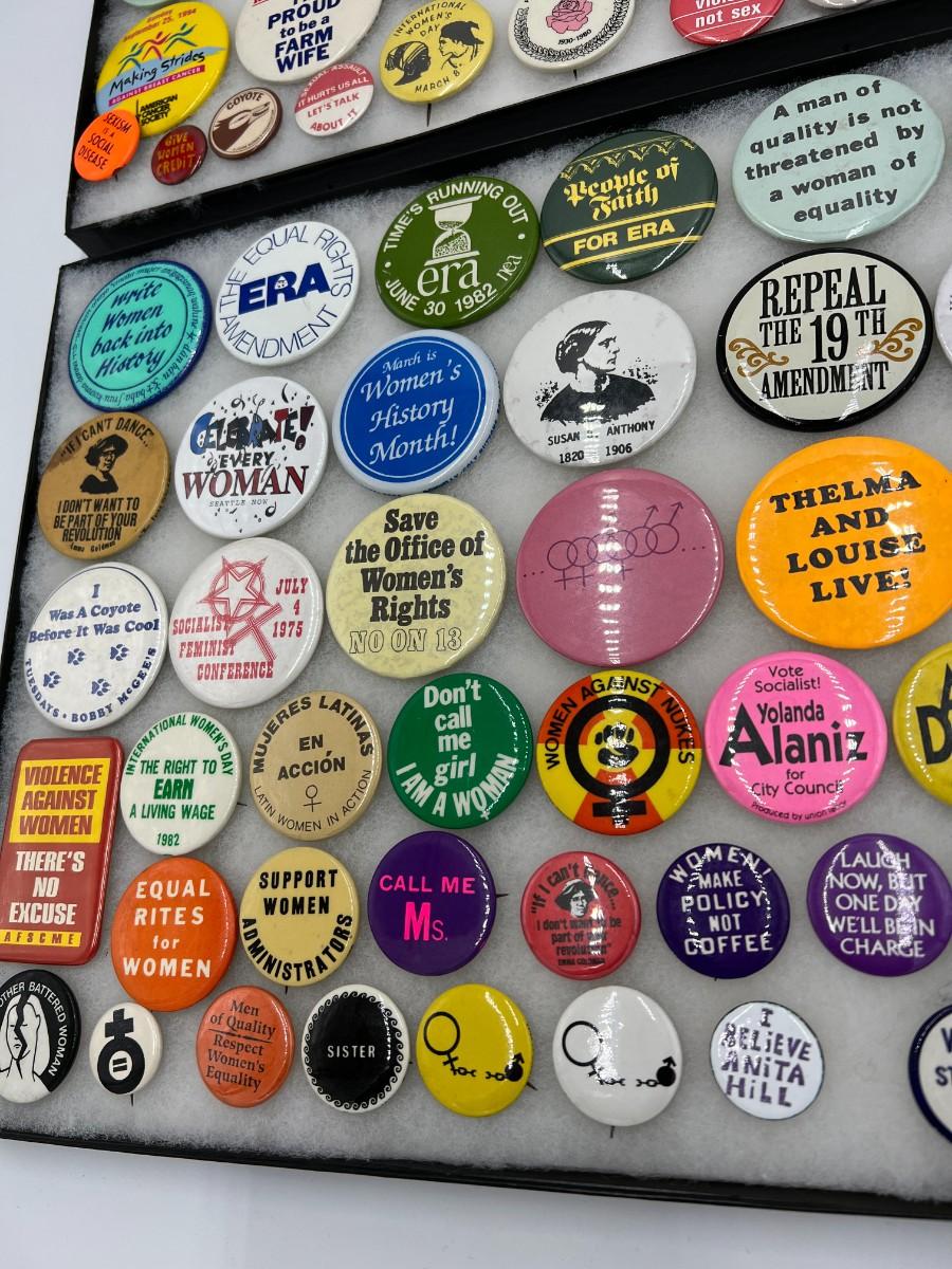 Large Lot of Vintage Buttons Pins Related to Womens Rights and Events. Includes buttons for Susan B. Anthony, "Repeal the 19th Amendment", Women Strike for Peace, "Equal Rites for Women", "I Believe Anita Hill", "I'm a Housewife for ERA", ERA Action Line, "Sexism is a Social Disease", "Women are worth more than 59 cents", and "Some Leaders Are Born Women". Condition as shown. (If shipping is required, the trays are not included)