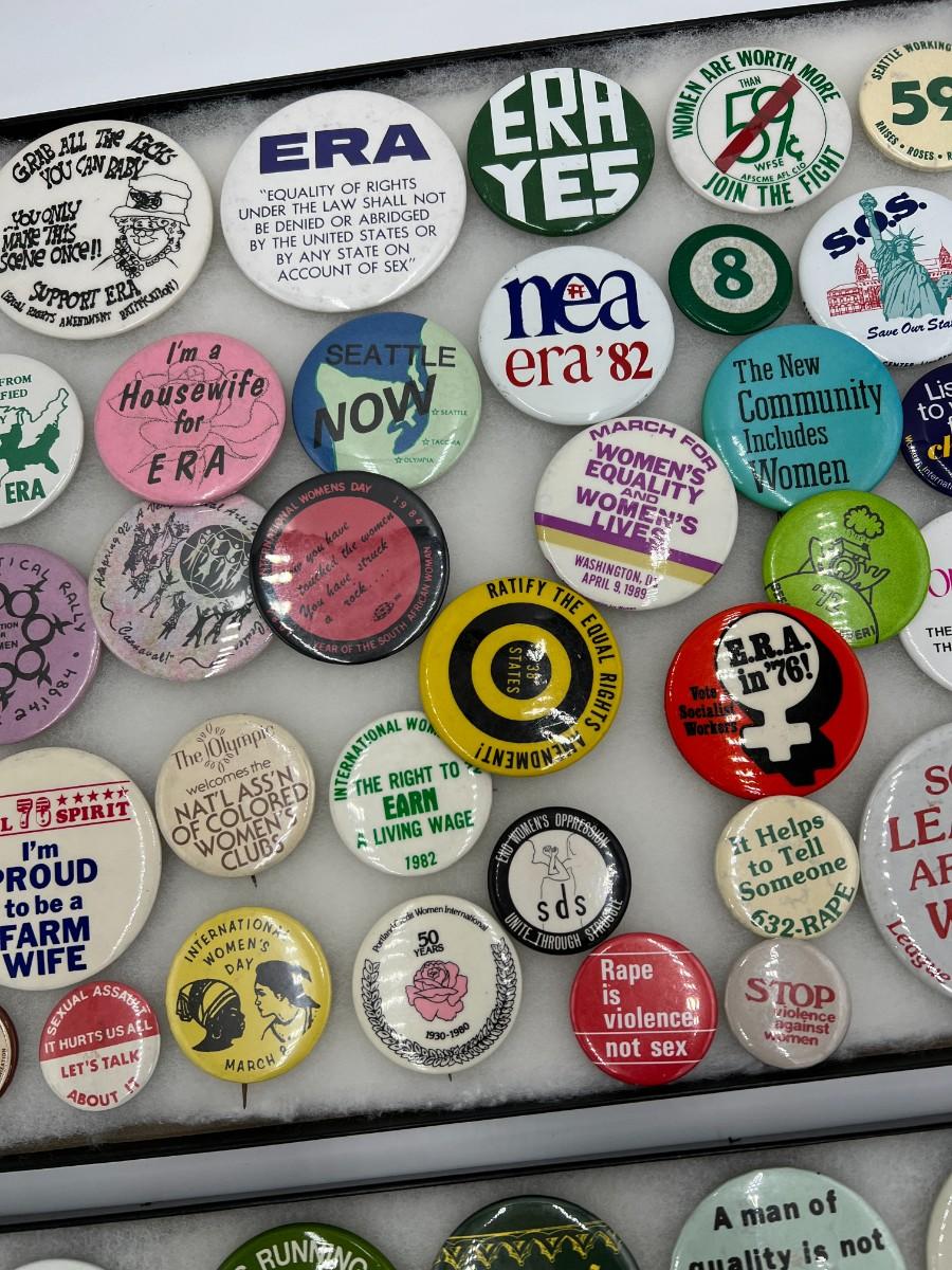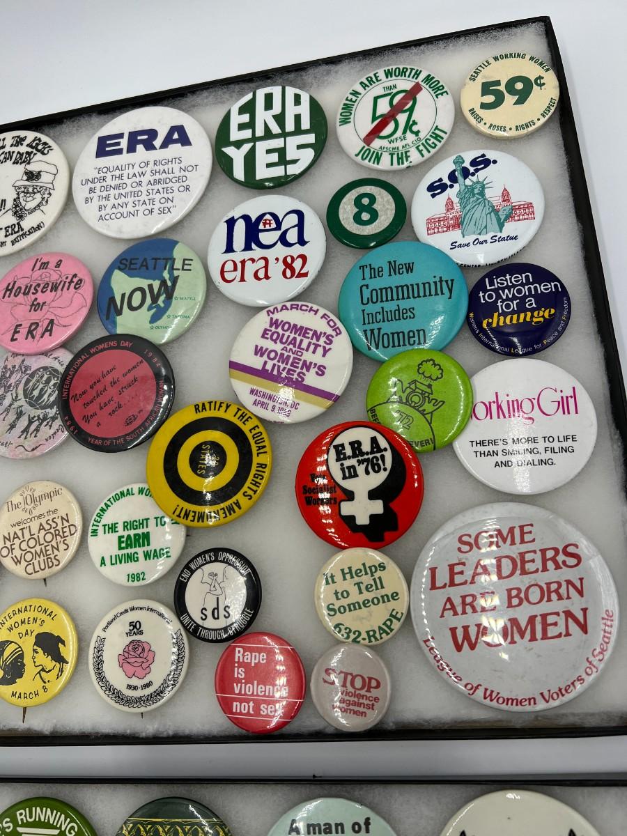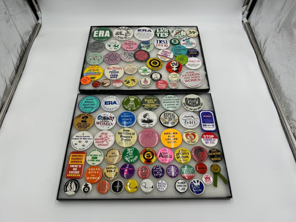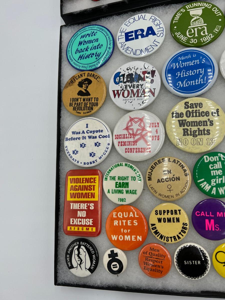 Large Lot of Vintage Buttons Pins Related to Womens Rights and Events. Includes buttons for Susan B. Anthony, "Repeal the 19th Amendment", Women Strike for Peace, "Equal Rites for Women", "I Believe Anita Hill", "I'm a Housewife for ERA", ERA Action Line, "Sexism is a Social Disease", "Women are worth more than 59 cents", and "Some Leaders Are Born Women". Condition as shown. (If shipping is required, the trays are not included)