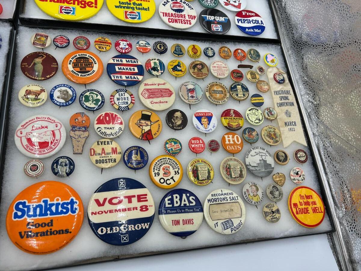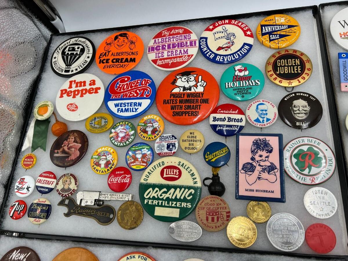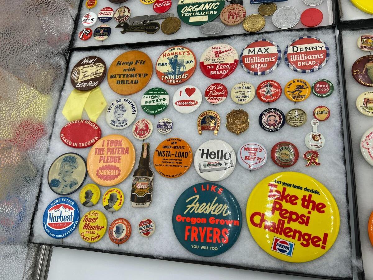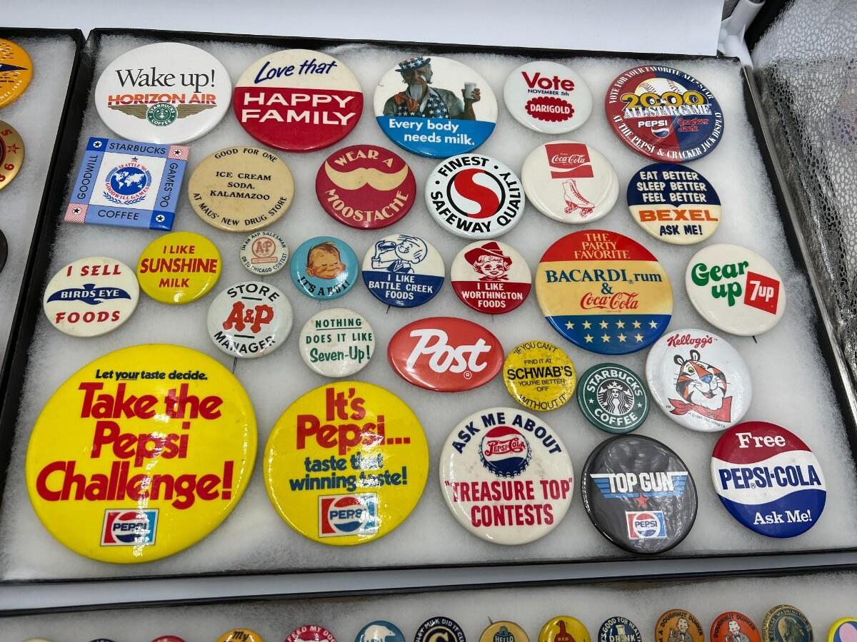 Large Lot of Vintage and Antique Commercial Brand and Advertising Related Buttons Pin Backs. Includes buttons or pins related to Coca Cola, Pepsi Cola, Wonder Bread, Sunkist, Post, Frigidaire, Milk, 7 Up, Popeye, Miller, Zig Zag, Acme Quality Products, Cadet, Ben & Jerry's, Darigold, Starbucks, Mayflower Doughnuts, Boots and Buddies Sweater, Rainier Beer, Bond Bread, Guernsey's. Conditions as shown. (If shipping is required, trays are not included)
