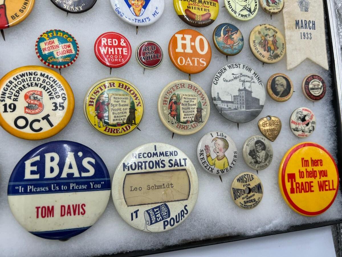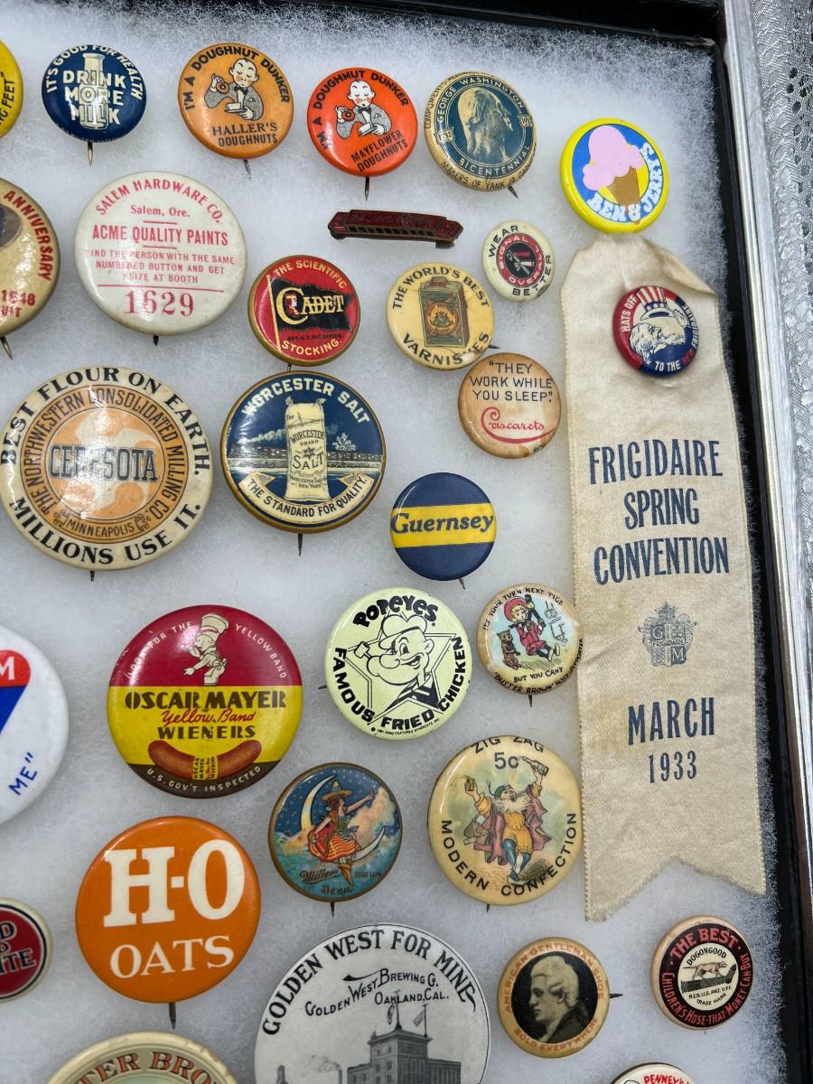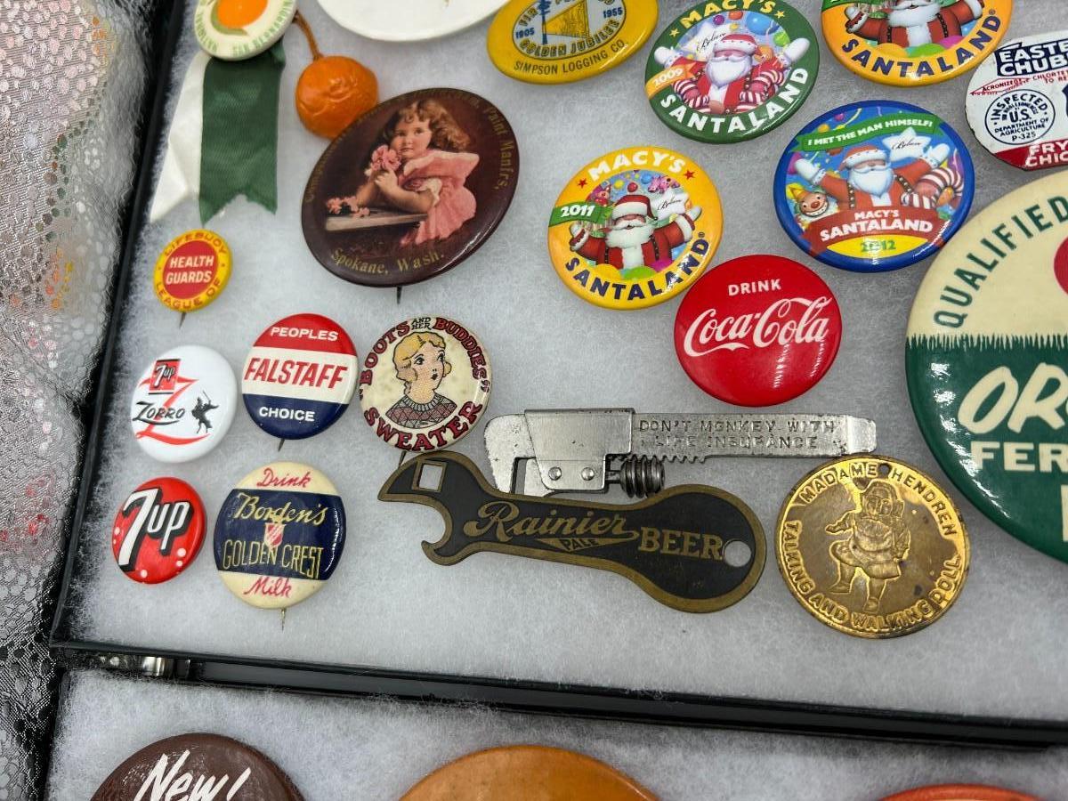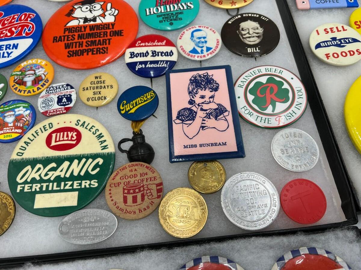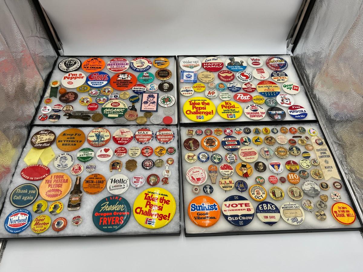 Large Lot of Vintage and Antique Commercial Brand and Advertising Related Buttons Pin Backs. Includes buttons or pins related to Coca Cola, Pepsi Cola, Wonder Bread, Sunkist, Post, Frigidaire, Milk, 7 Up, Popeye, Miller, Zig Zag, Acme Quality Products, Cadet, Ben & Jerry's, Darigold, Starbucks, Mayflower Doughnuts, Boots and Buddies Sweater, Rainier Beer, Bond Bread, Guernsey's. Conditions as shown. (If shipping is required, trays are not included)