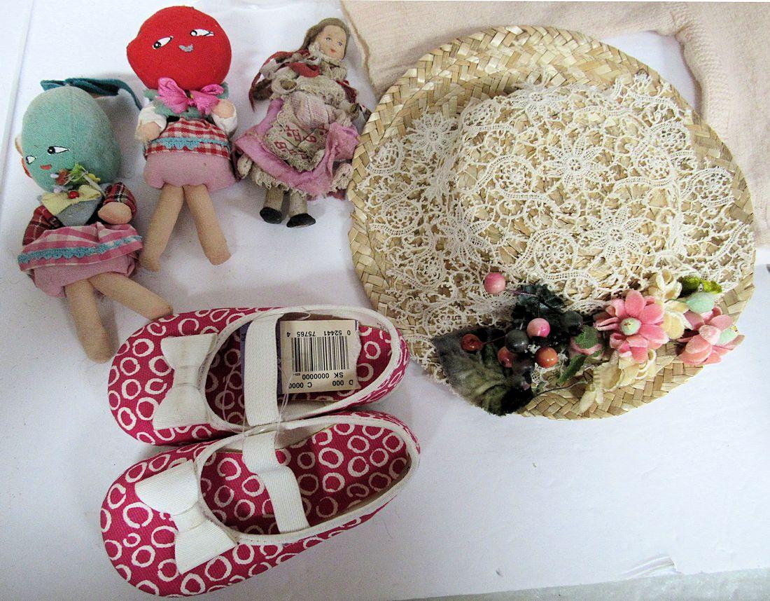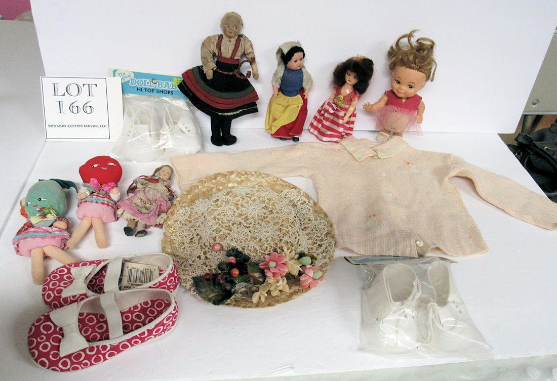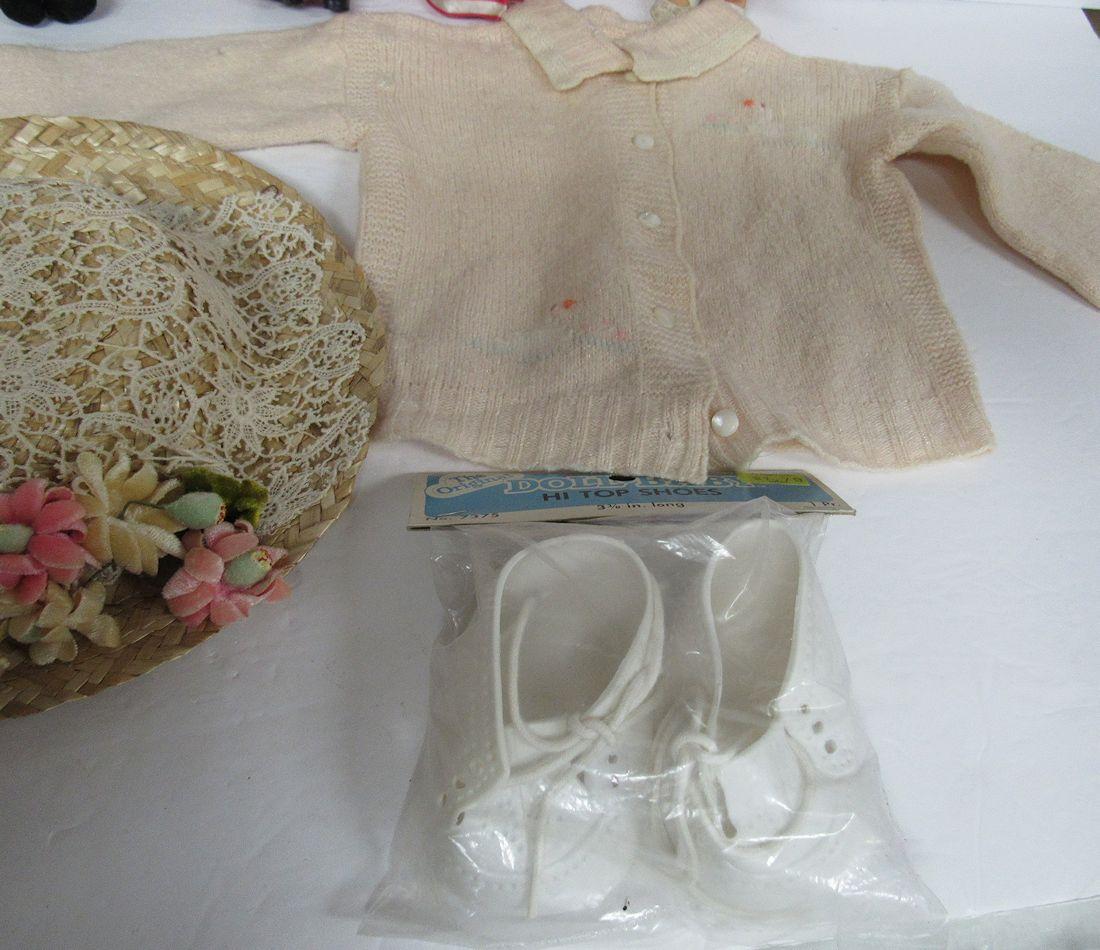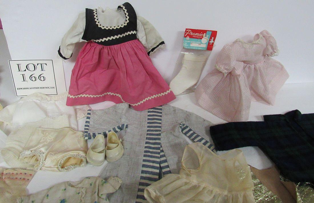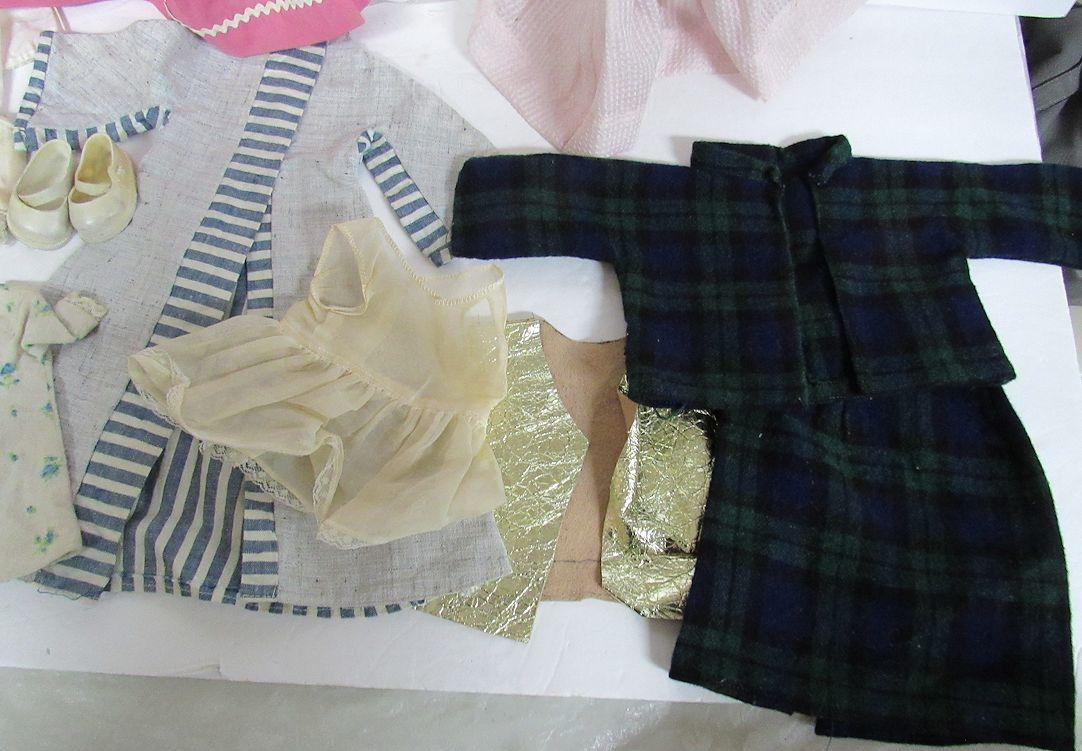 Some unused in original package. Range from poor to very good. The green plaid set needs snaps. The wedding dress has wear but is usable. The little shoes are young girls shoes. The dolls are in a different photo, and range from well used to ok. Shipping is available at shipping cost plus $5.00 handling fee on up to 6 lots, $10.00 handling fee on 7 or more lots or two boxes. $15.00 handling fee on 3 boxes. Helps cover shipping materials and labor cost.