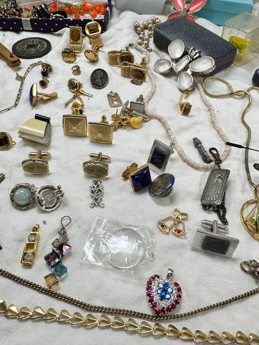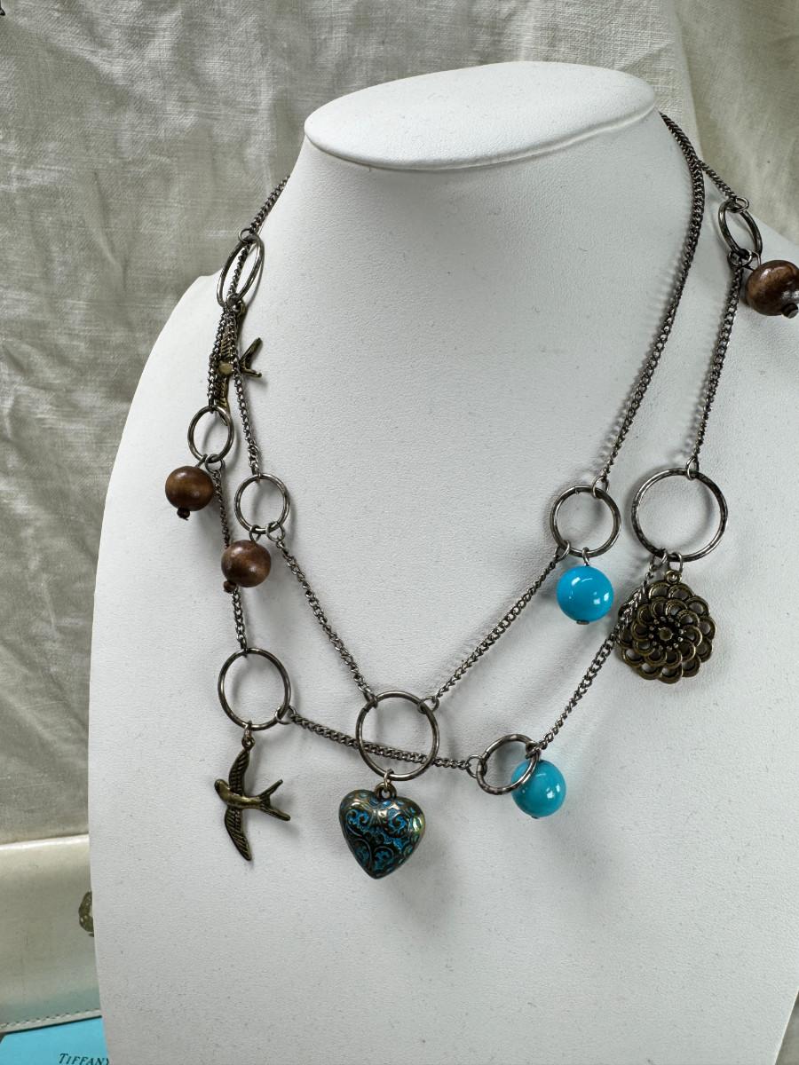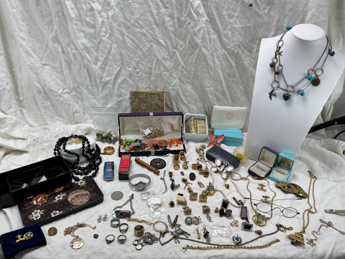 Necklace display not included. Empty Tiffany box. Costume jewelry huge variety, vintage . Necklaces, Bracelets, rings,