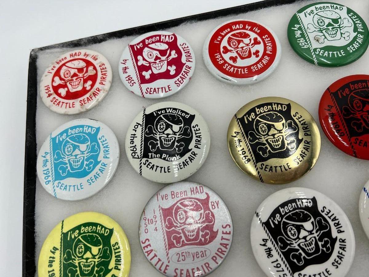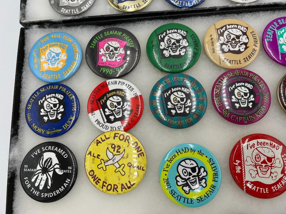 Large Lot of Vintage Seattle Seafair Pirates Buttons. Great collection of Pirates buttons from the 1950s, 1960s, 1970s, 1980s, and 1990s. Buttons say, "I've Been Had" "Seattle Seafair Pirates". Conditions as shown.