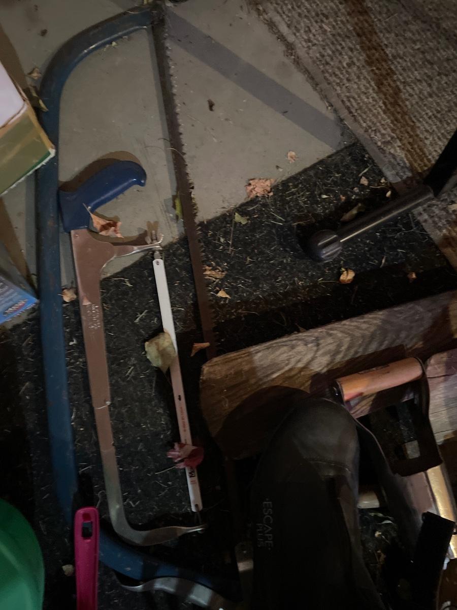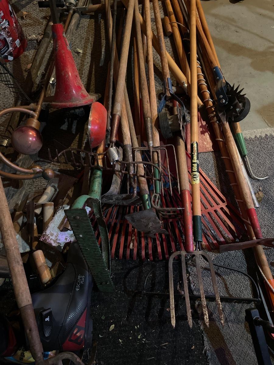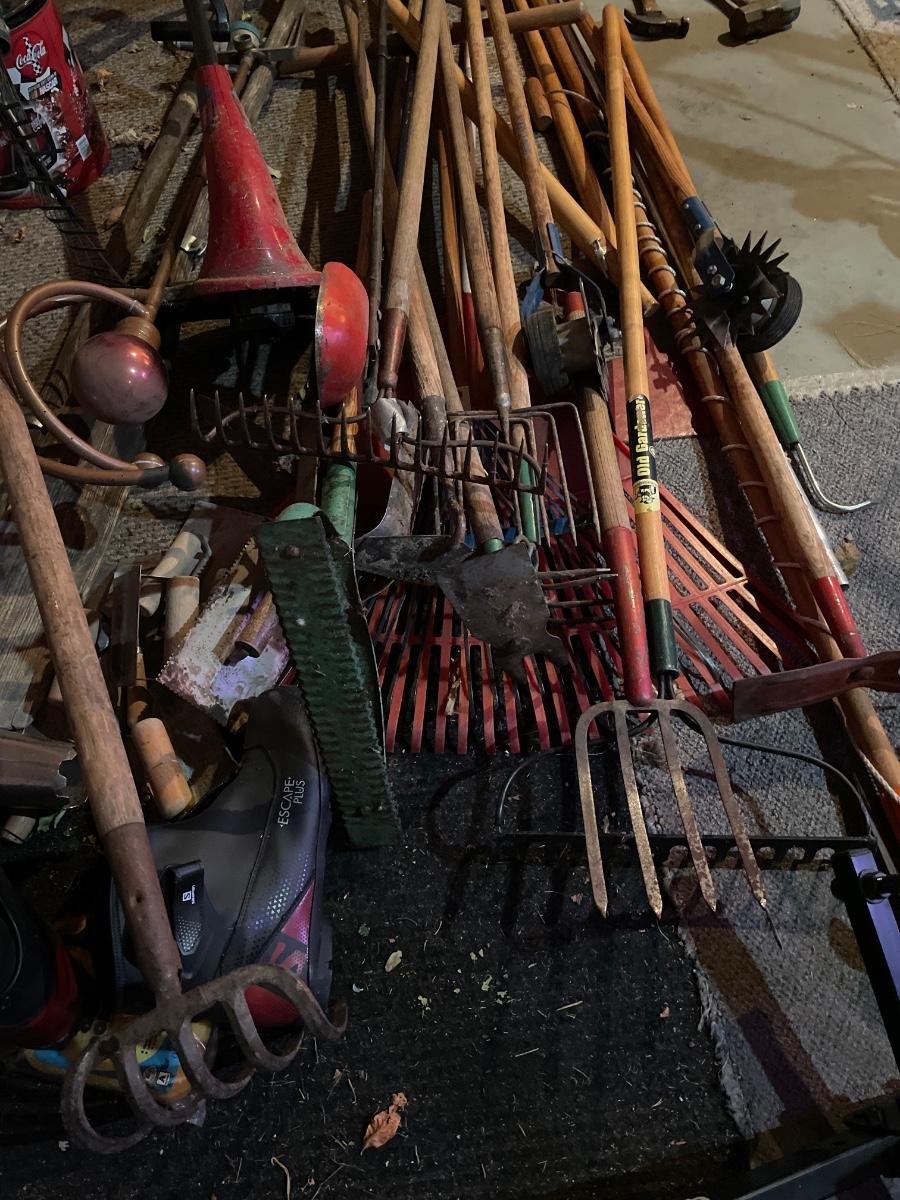 Includes rakes, pitchforks, edger, branch cutter, Saw