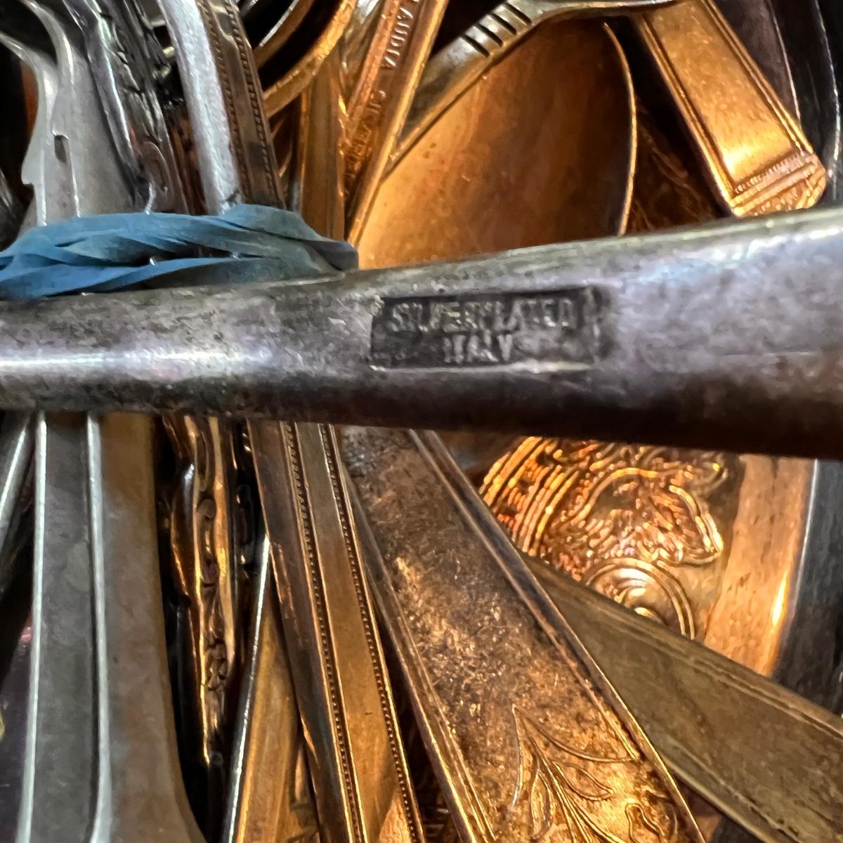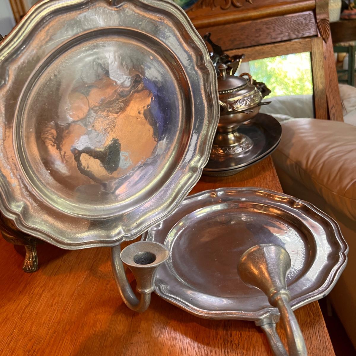 Some are stamped Italy and Belgium. Utensils, platters, bowls, plates, pewter candle wall sconce set. See pics for conditions.