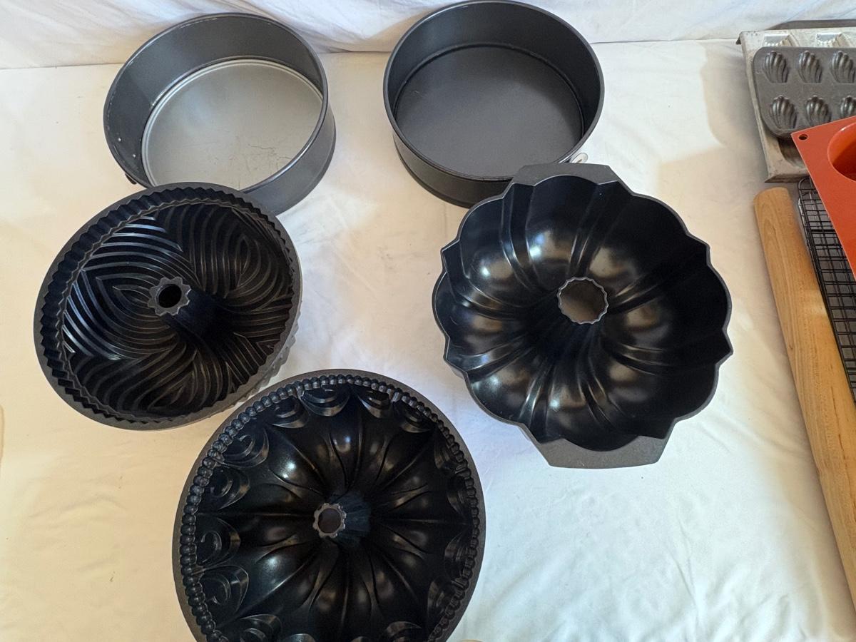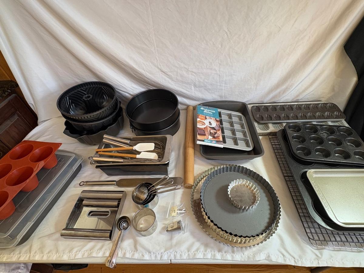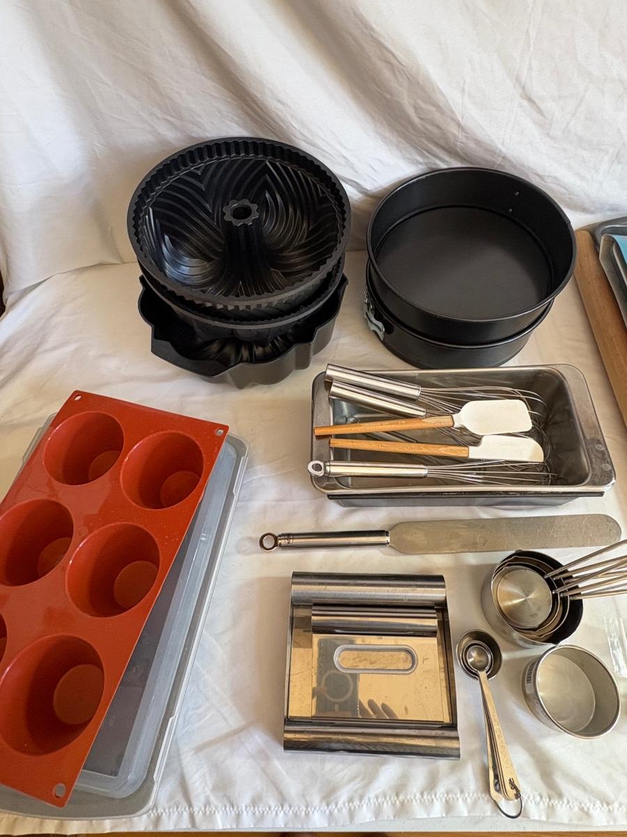 9” Bundt & springform pans, mini & regular Madeline pans and muffin tins, cooling trays, tart pans (seven 4”, two 9”, one 10.5”), and many miscellaneous tools.