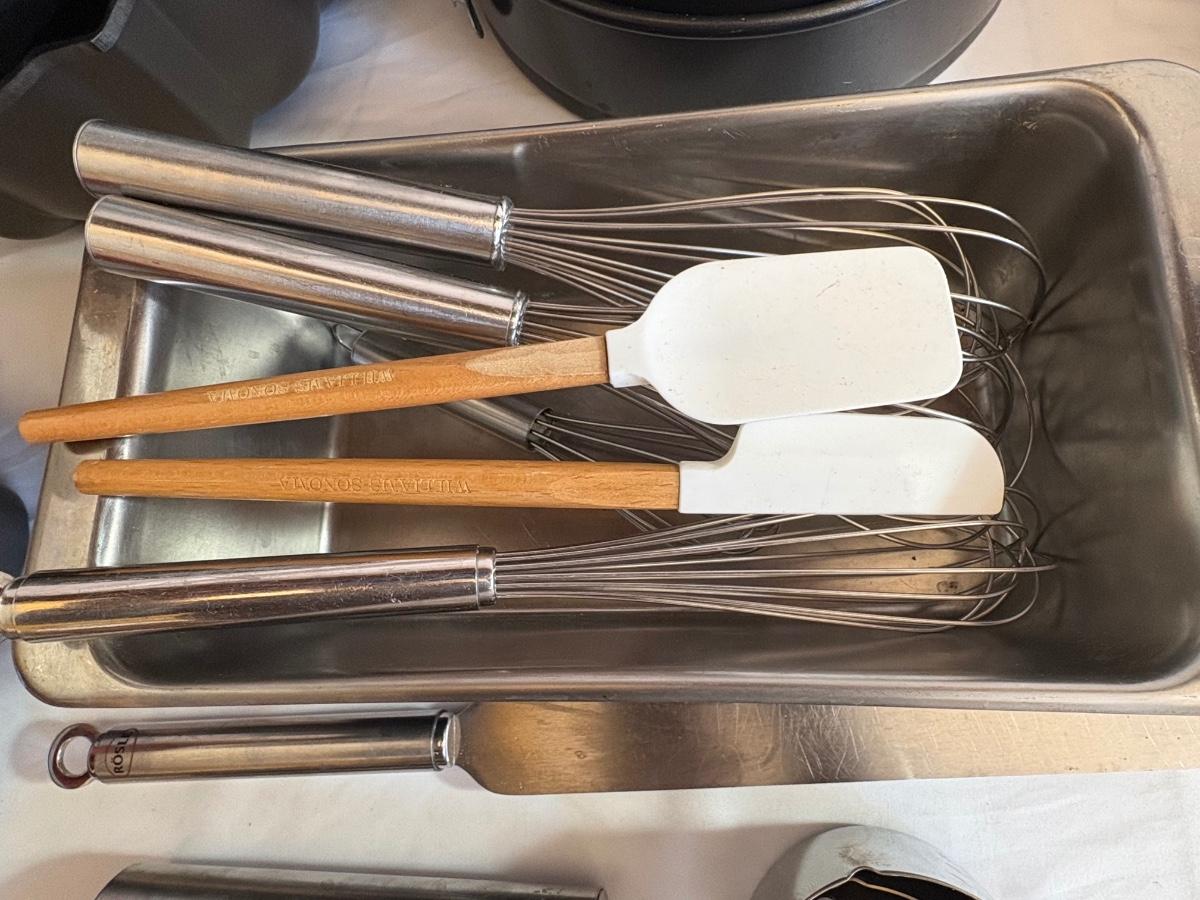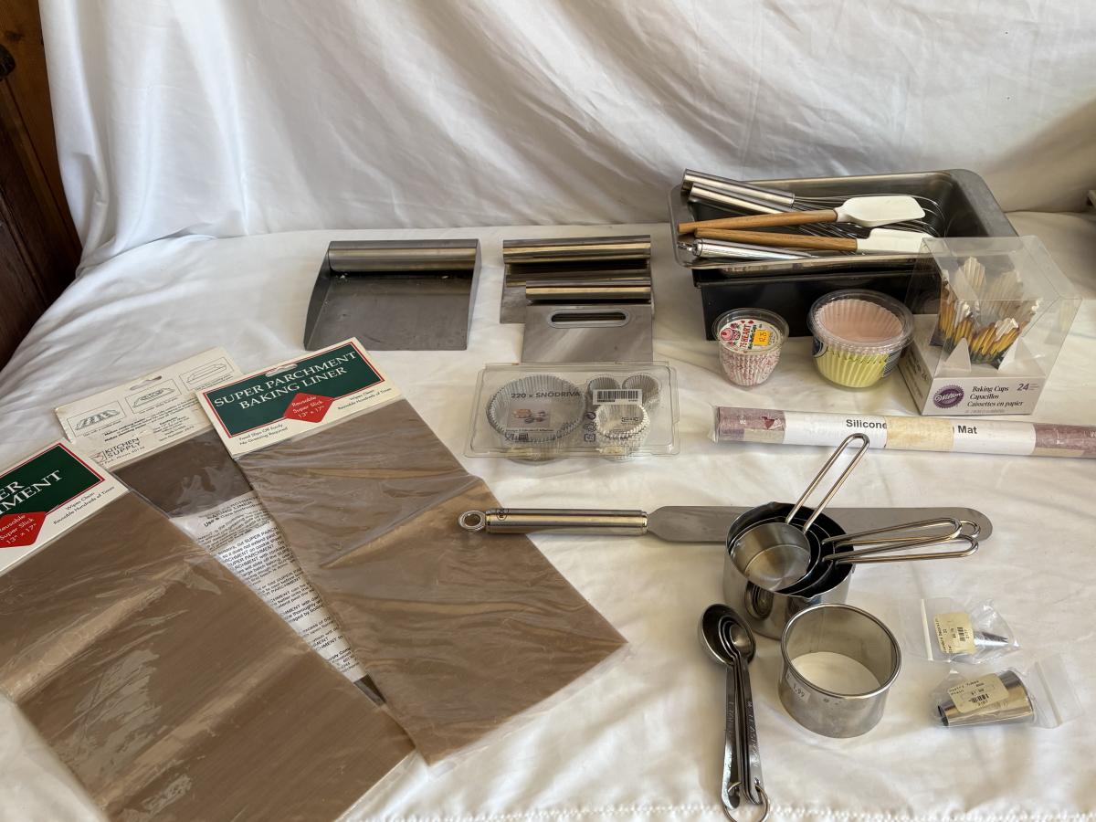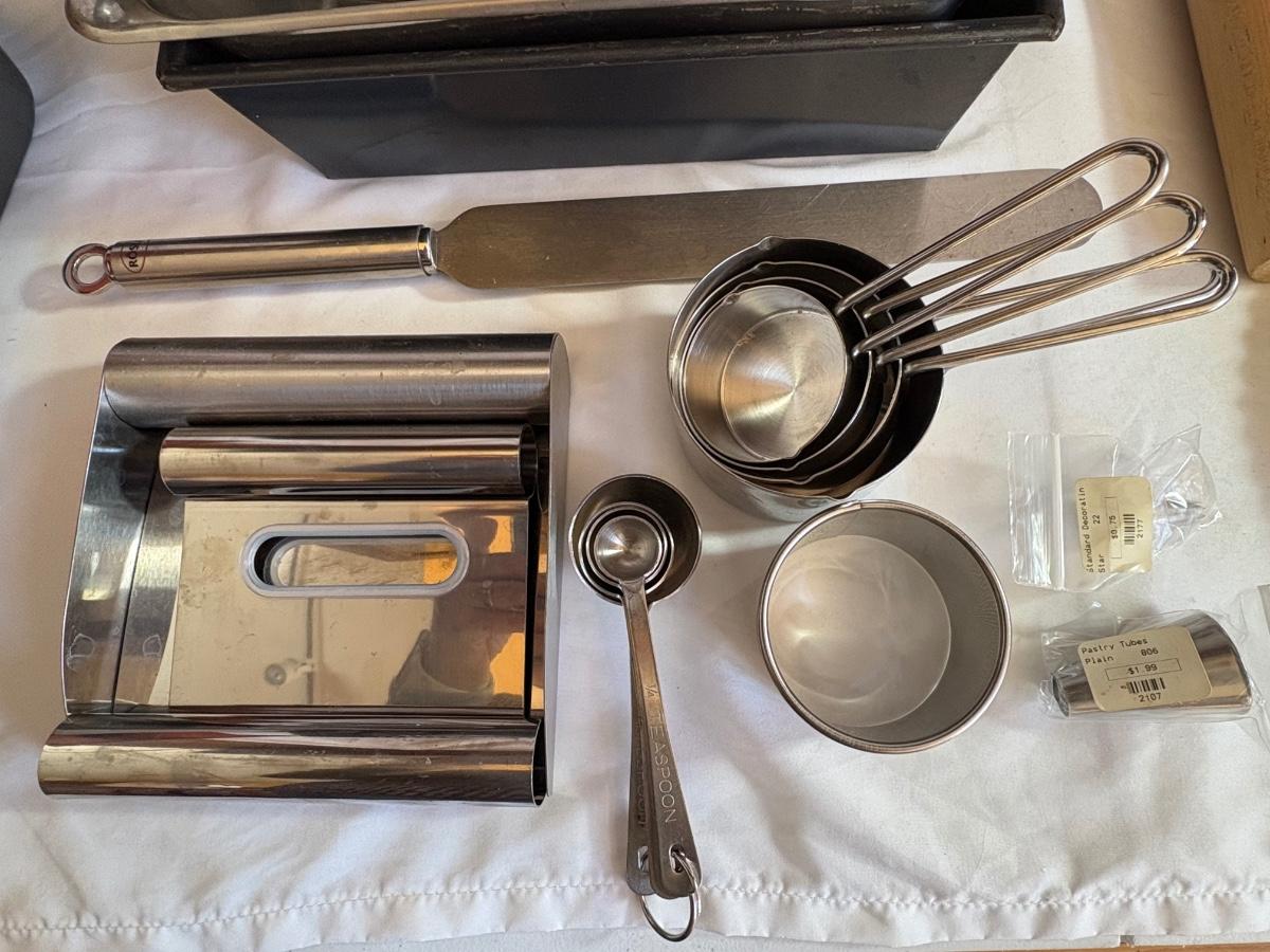 9” Bundt & springform pans, mini & regular Madeline pans and muffin tins, cooling trays, tart pans (seven 4”, two 9”, one 10.5”), and many miscellaneous tools.