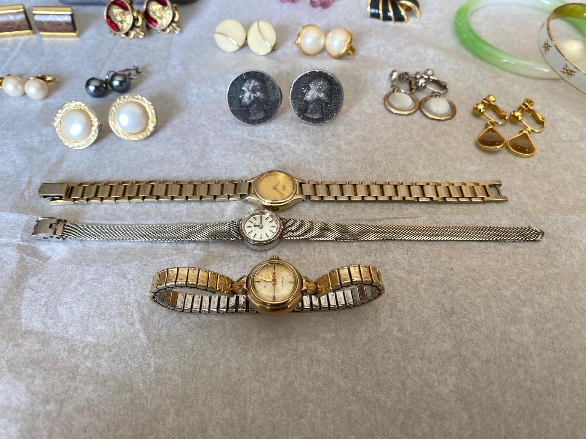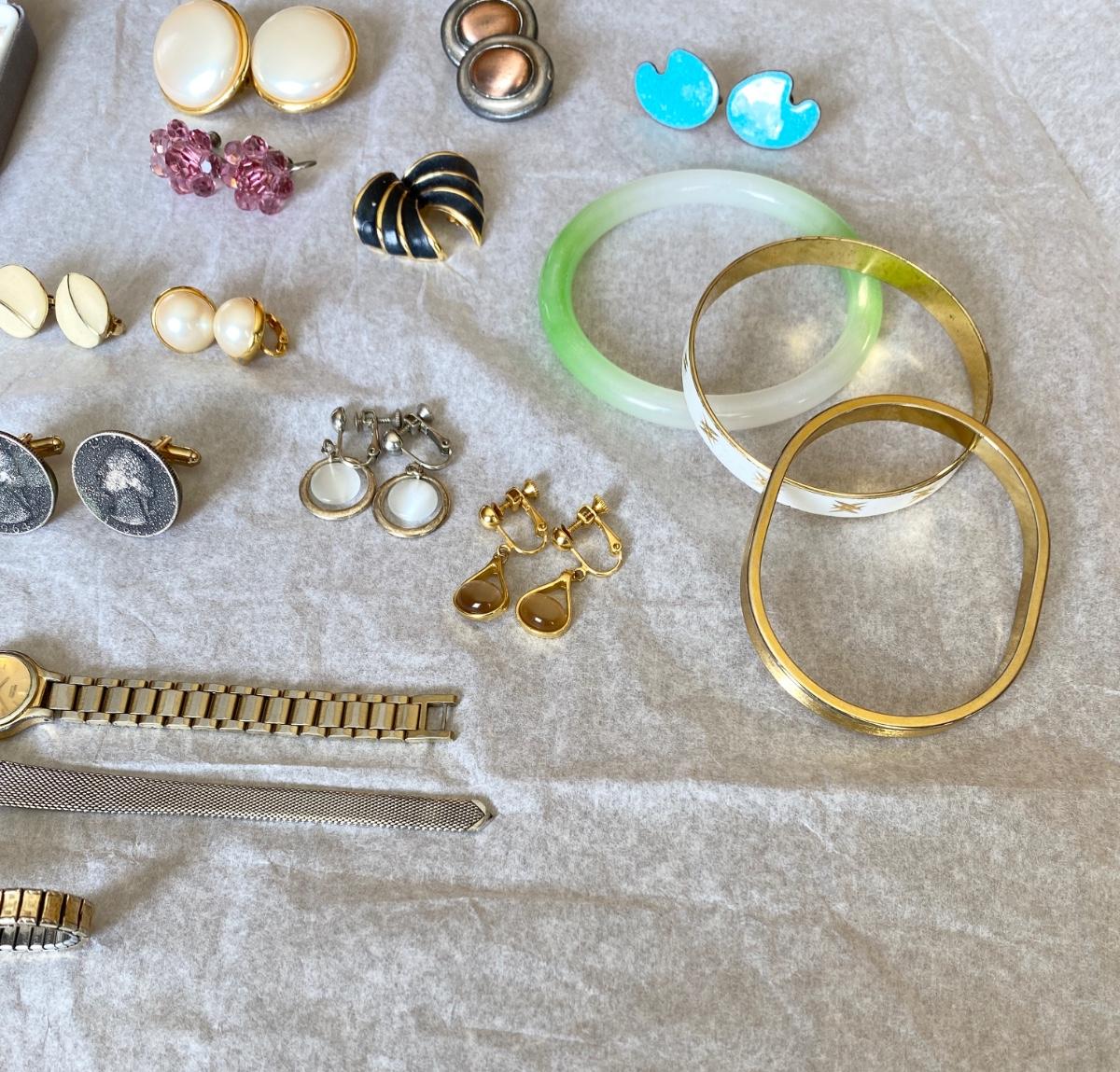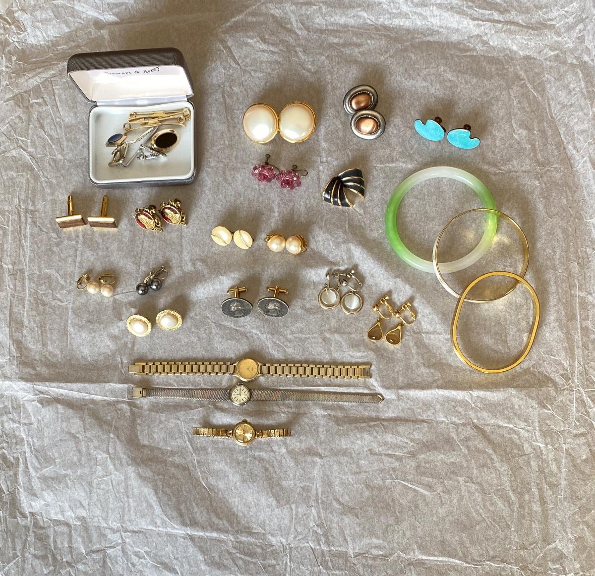 Lot includes earrings, bracelets, and watches ( don’t know if they run). There are a few pair of cuff links, including some mid century coin links, and several single cuff links.