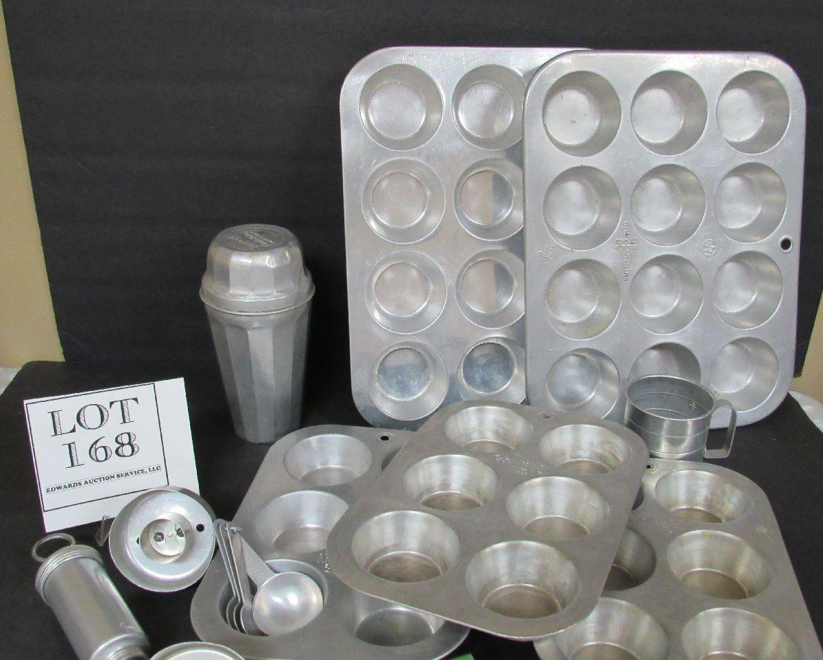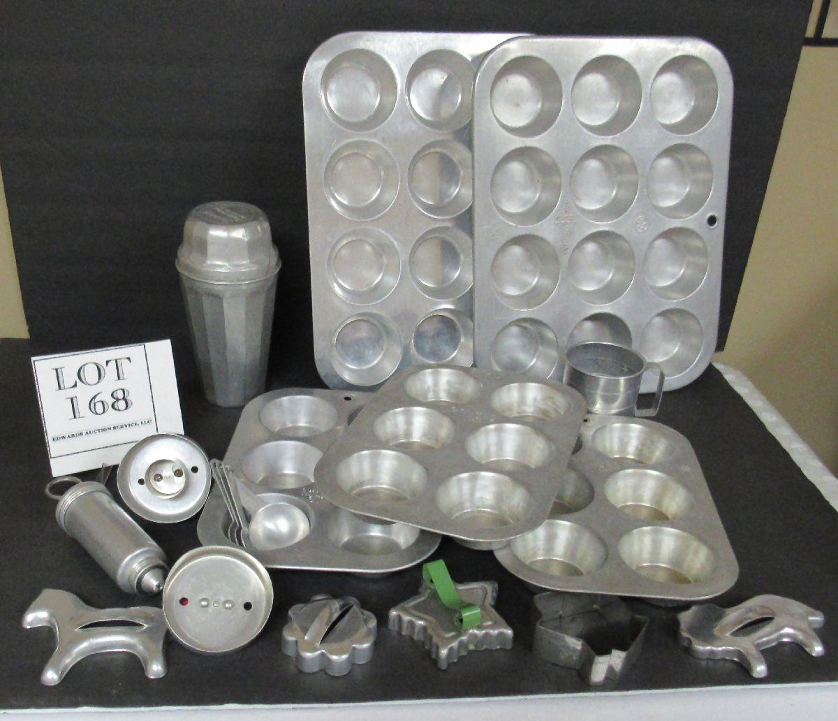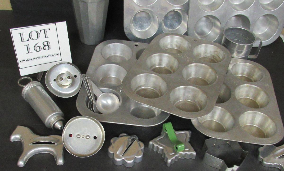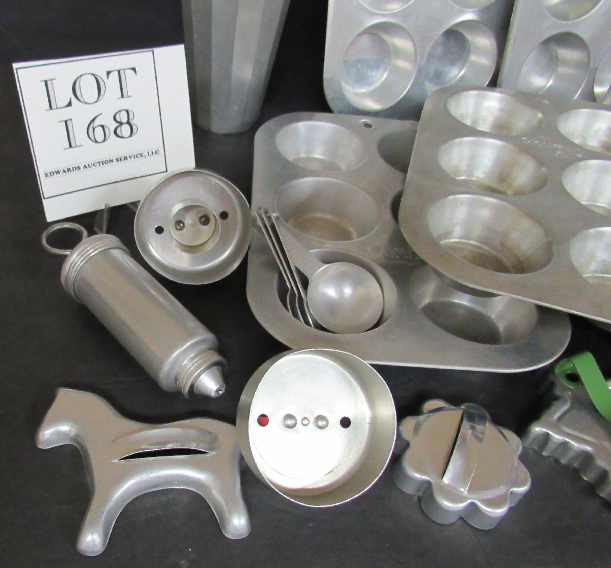 Large Lot Vintage Kitchenware Aluminum Tins, Cutters, Cake Decorator, Malted Milk, More
