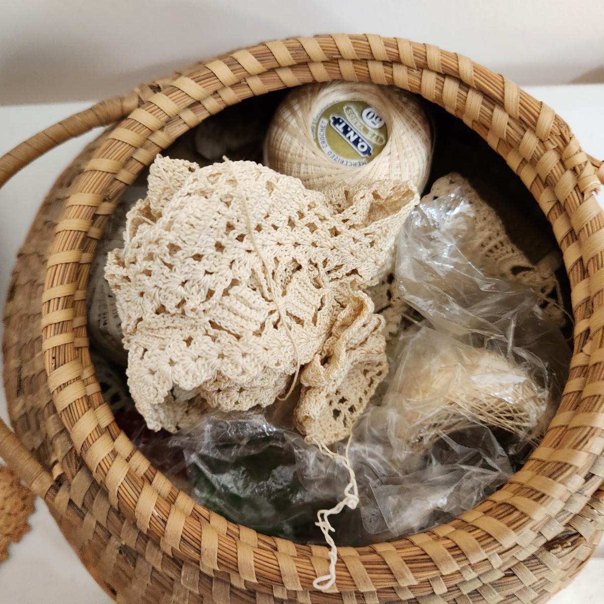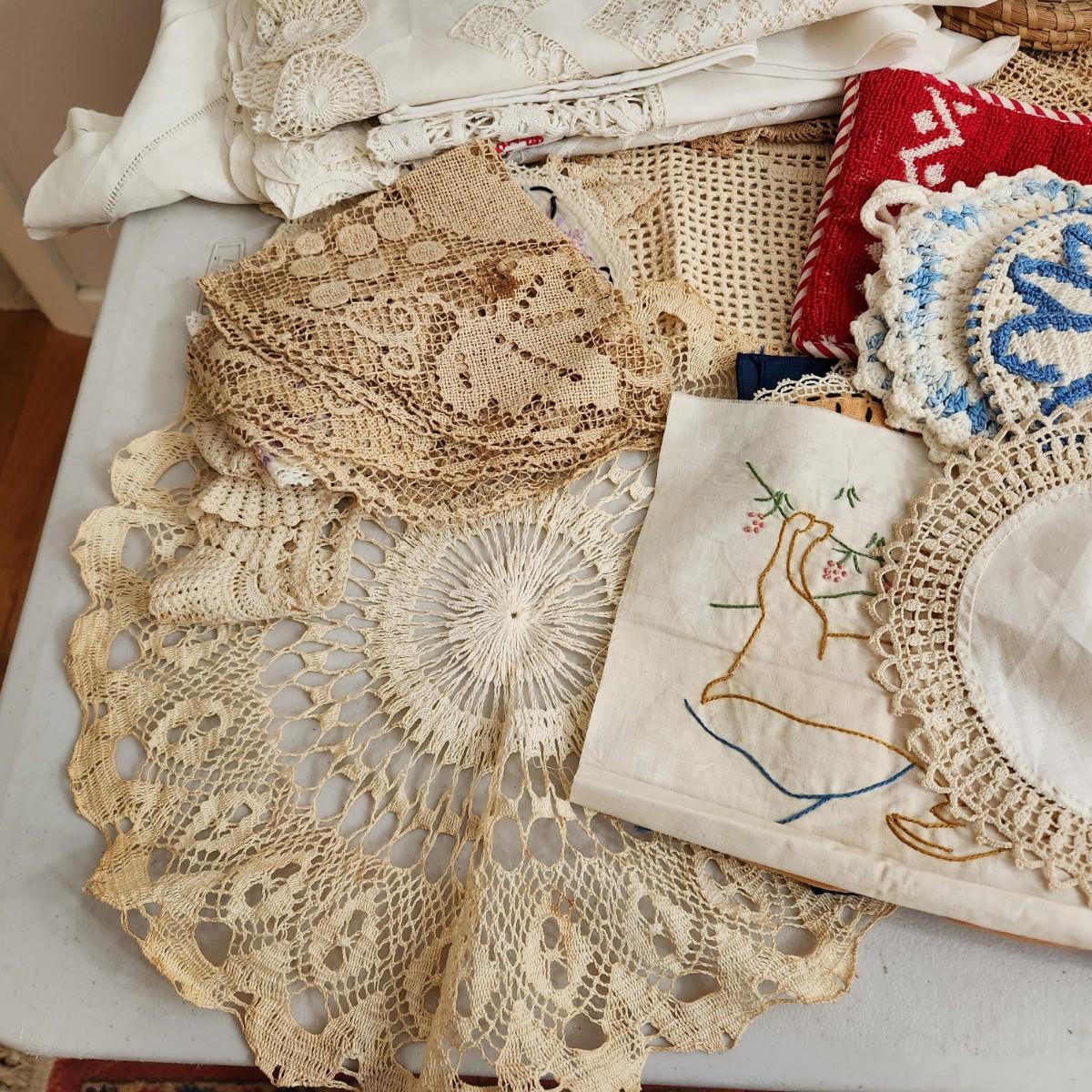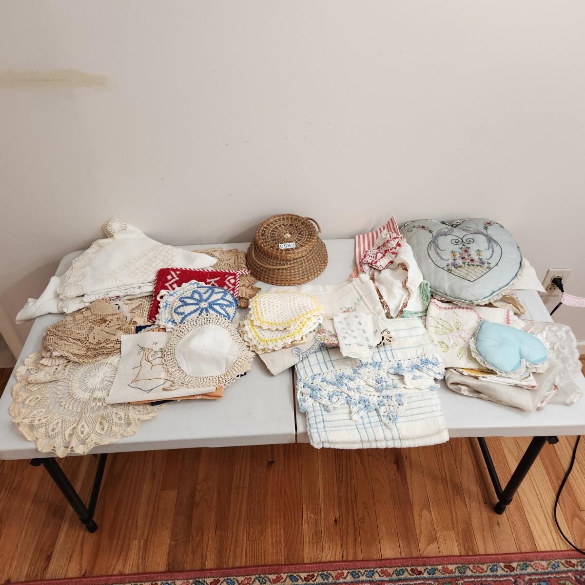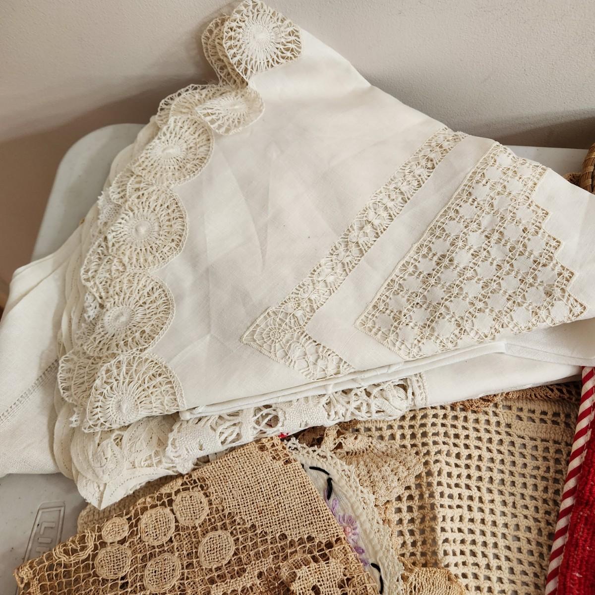 Large Lot Vintage Linens Textiles Lace Basket Lot  583