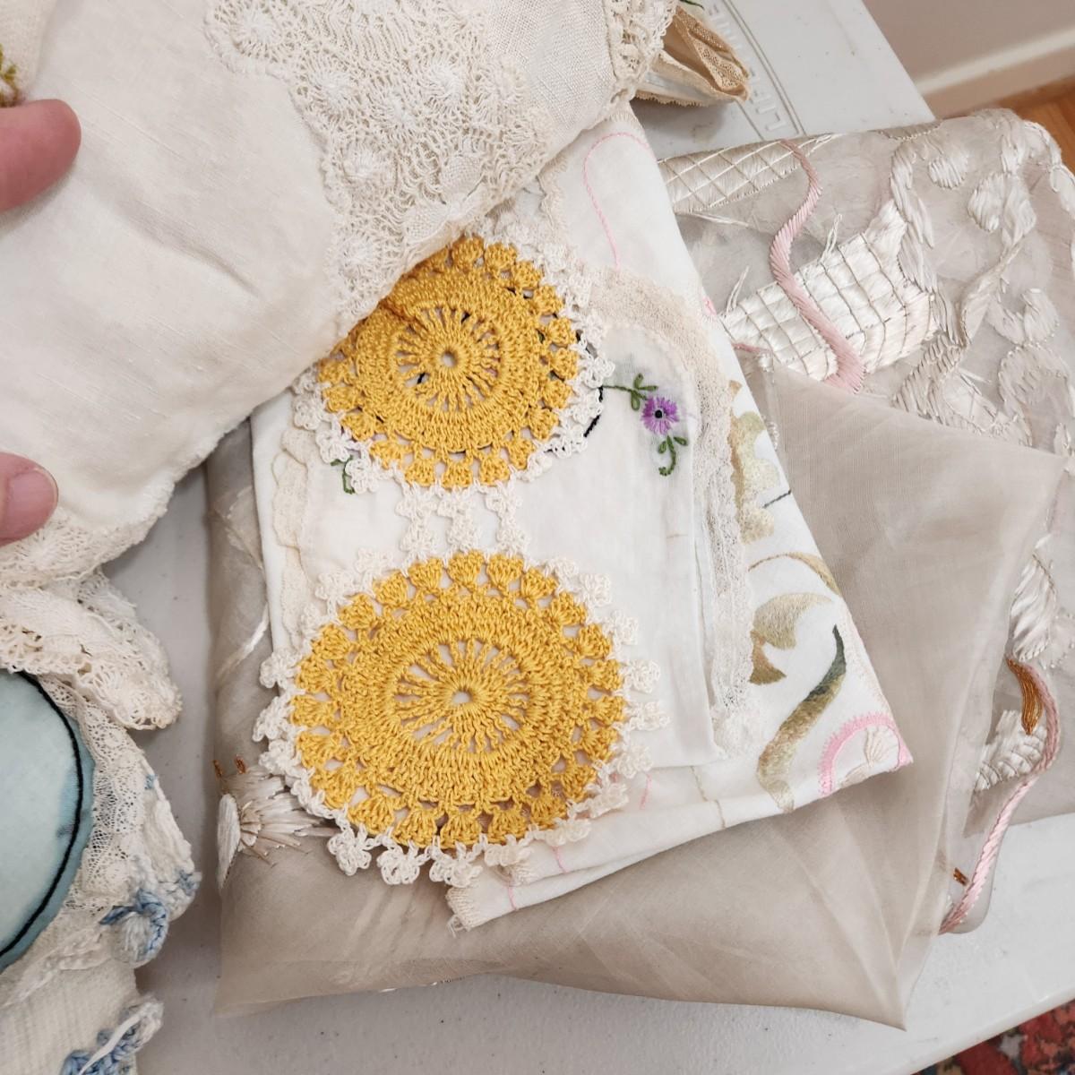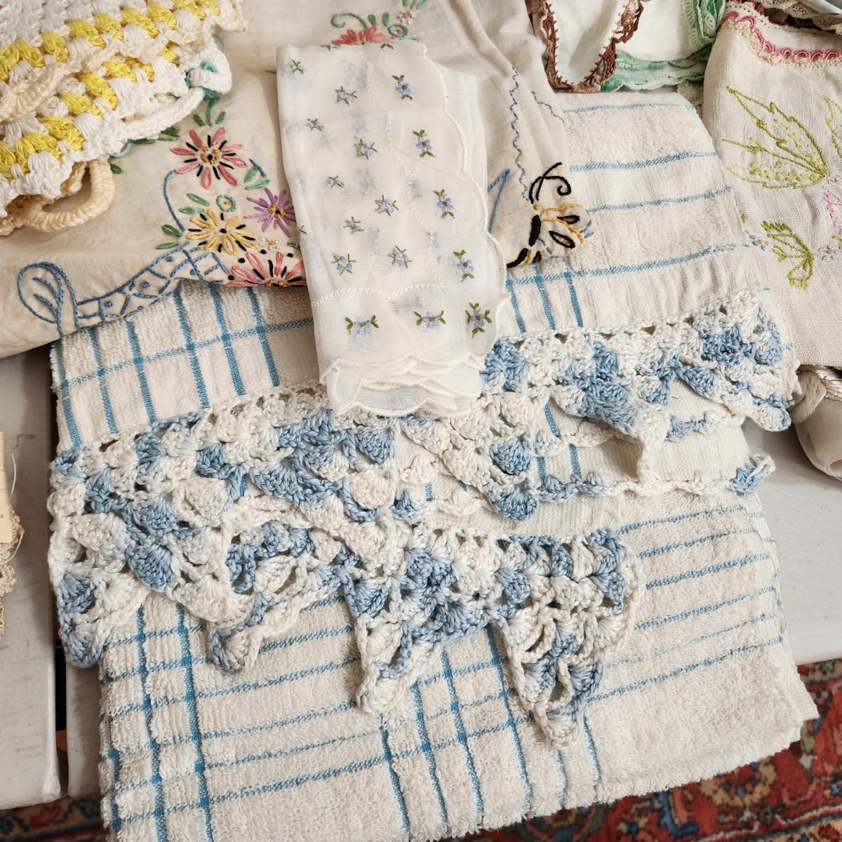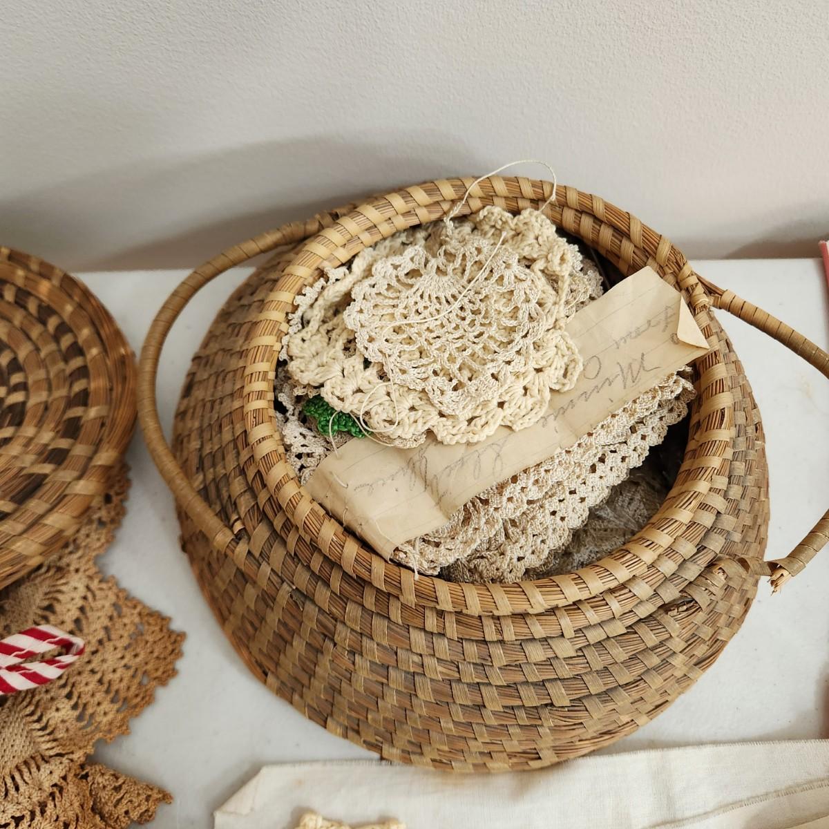 Large Lot Vintage Linens Textiles Lace Basket Lot  583