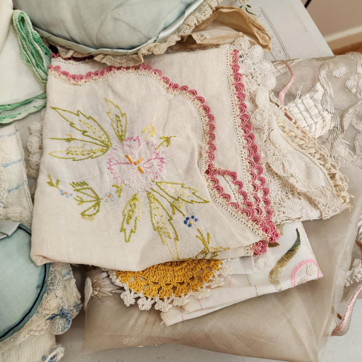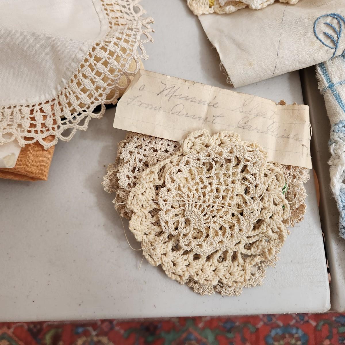 Large Lot Vintage Linens Textiles Lace Basket Lot 583