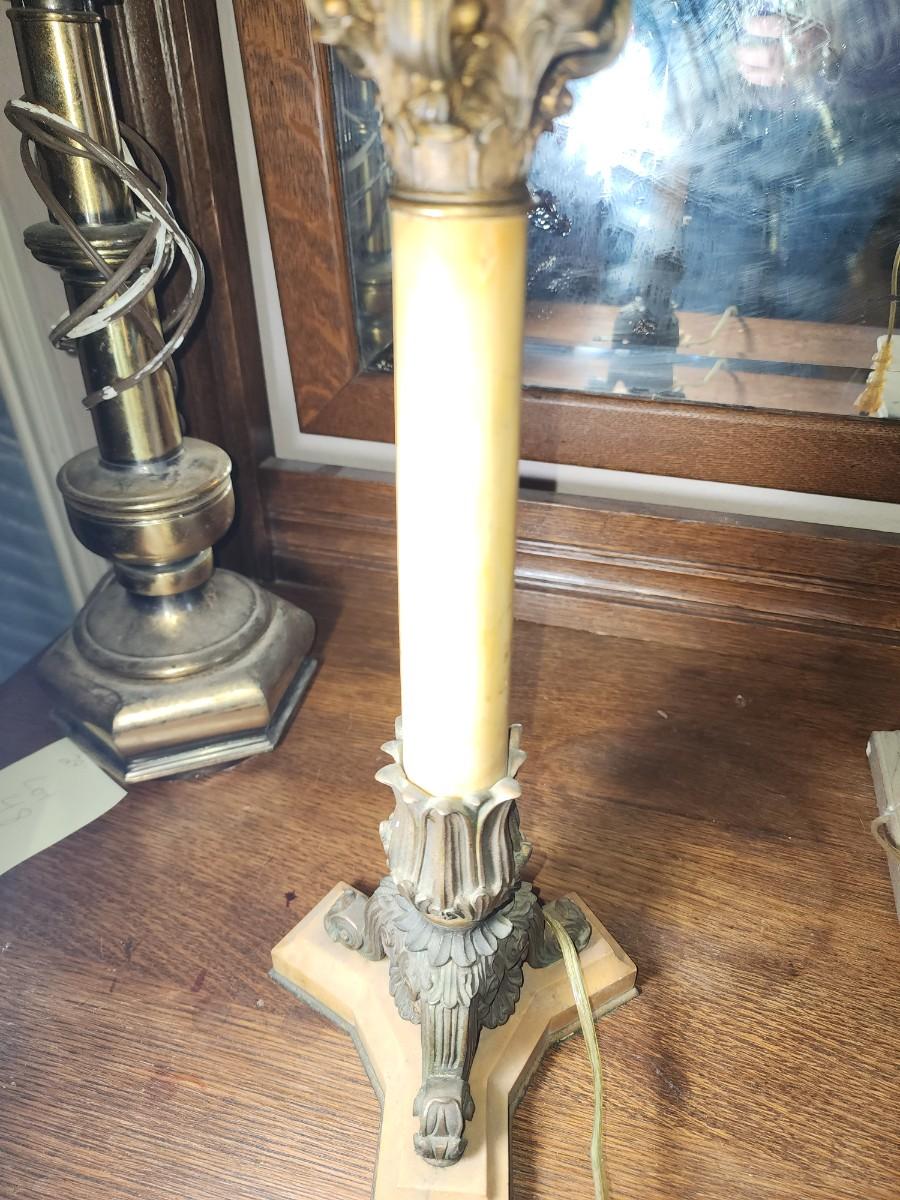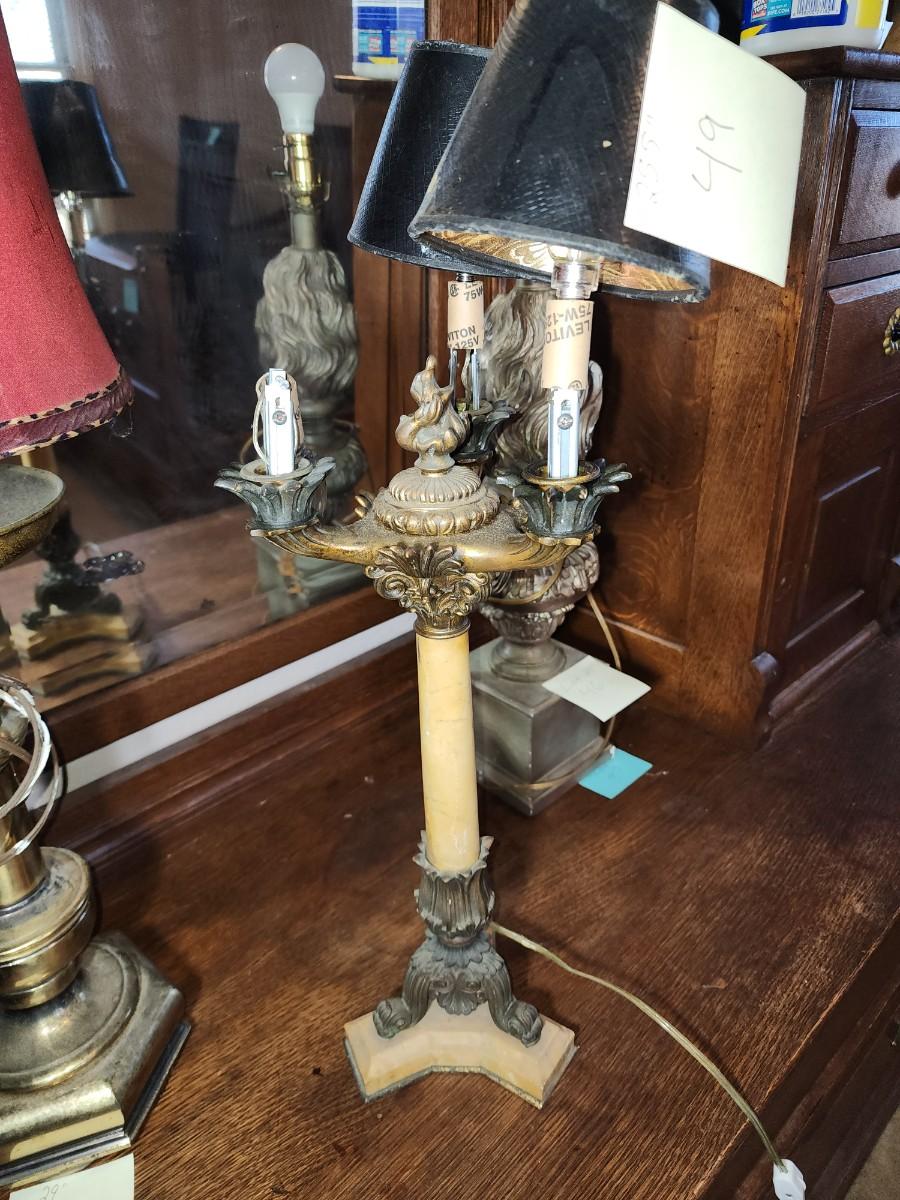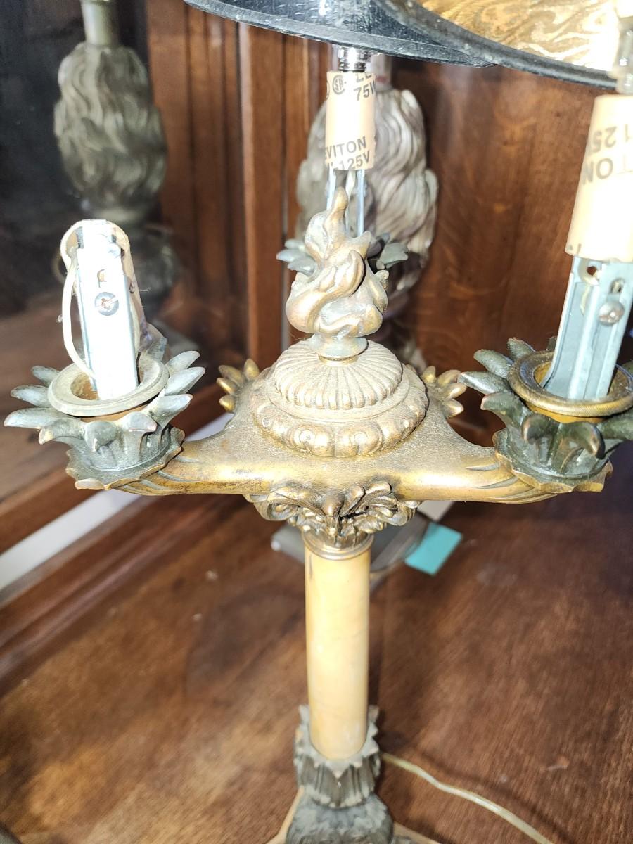 Three bulbs. One piece needs repair for sure. Very heavy lamp.
