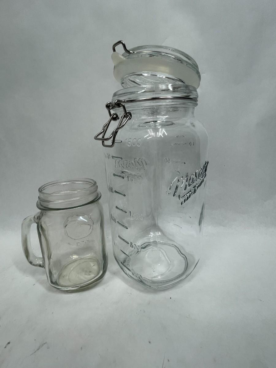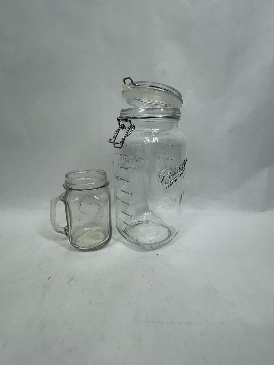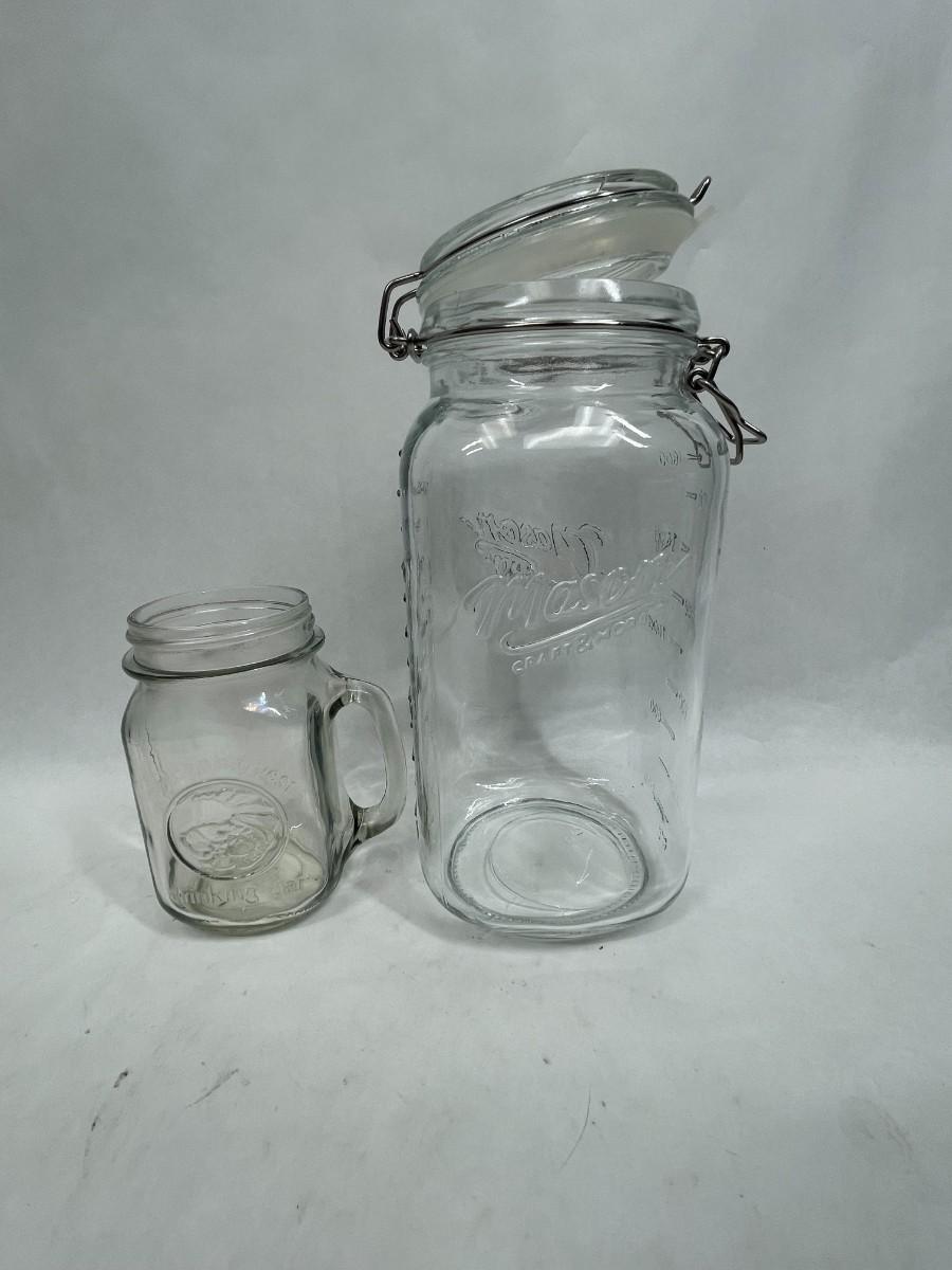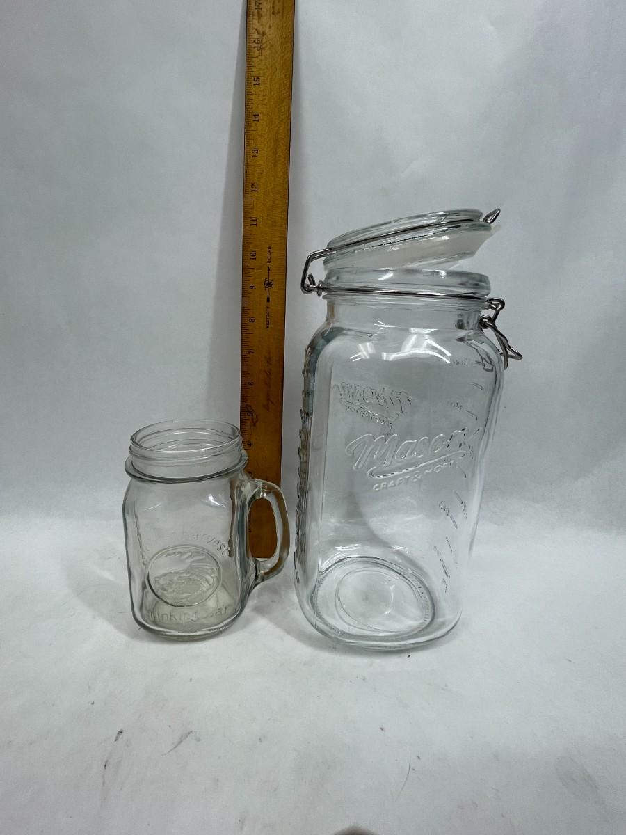 Large Mason Glass Jar with. hinged lid and small Ball jar