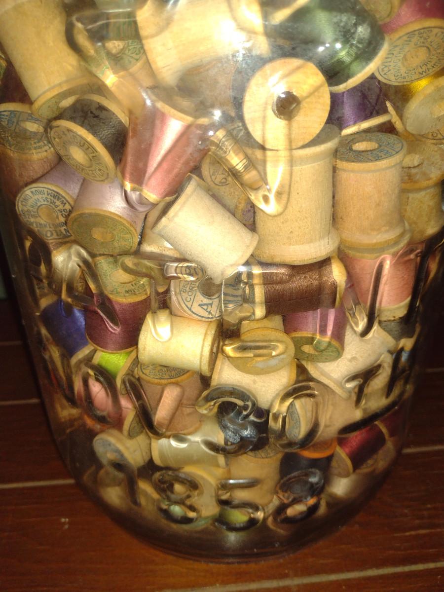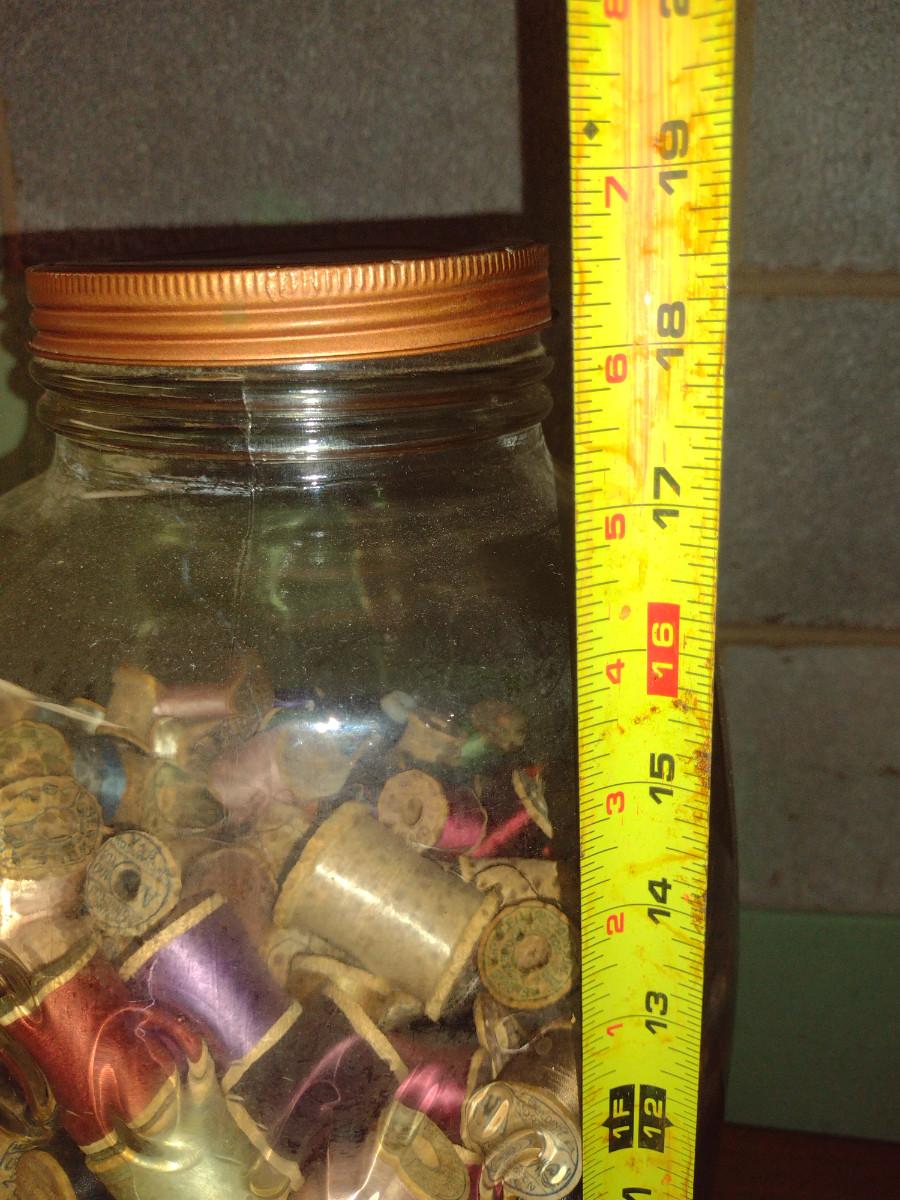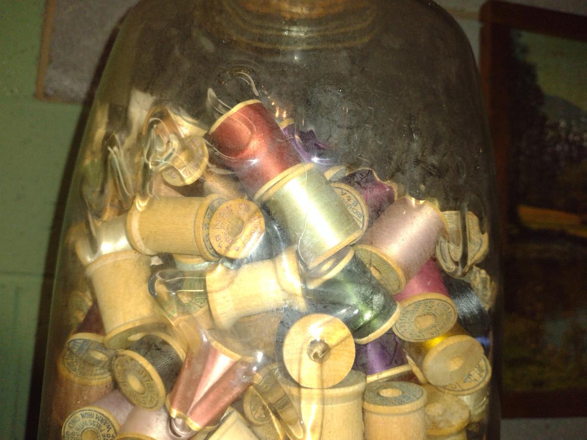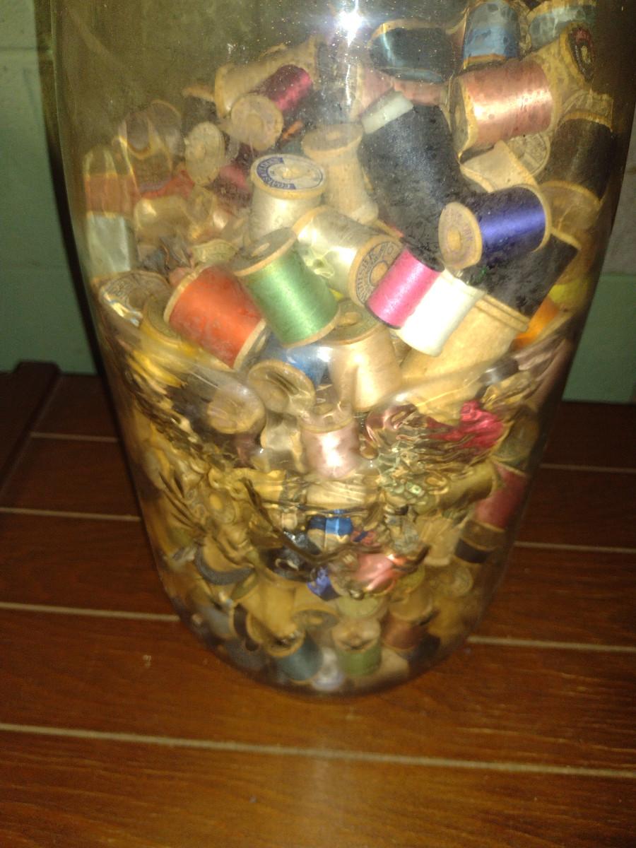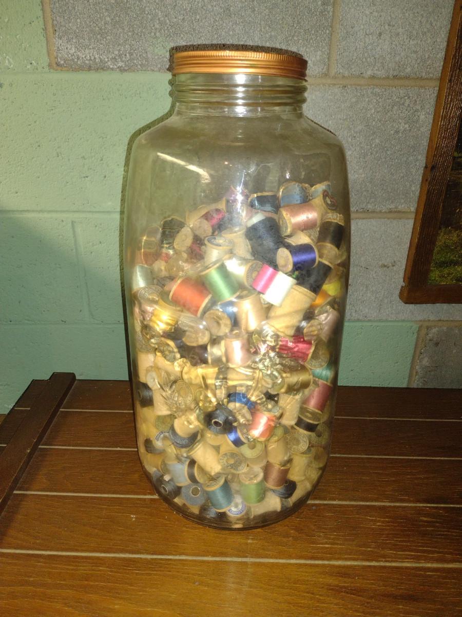 Large, Mason Jar with Eagle Filled with Spools of Thread- Approx 18 1/2" Tall. Lid has been cross threaded and may be difficult to remove.