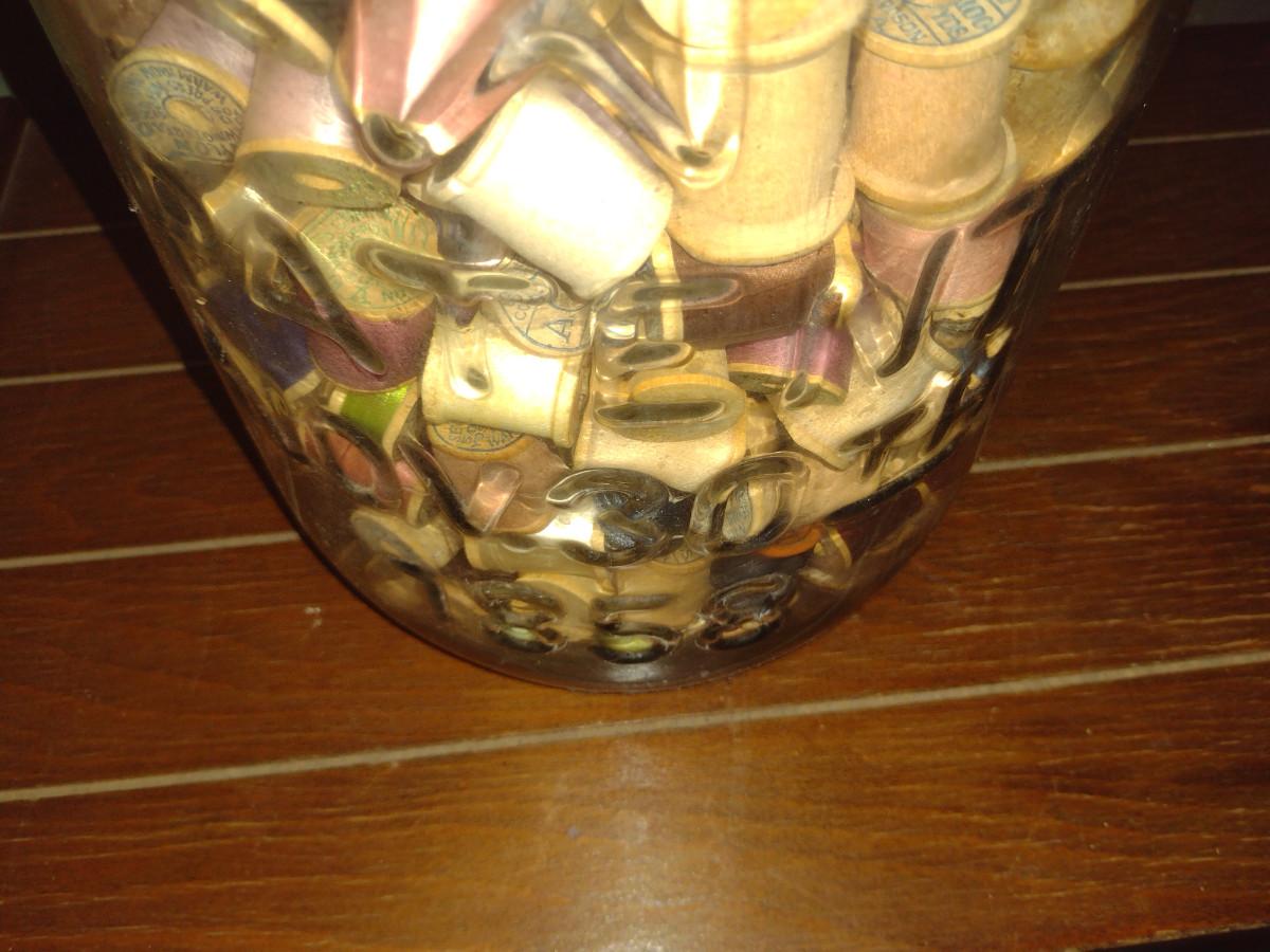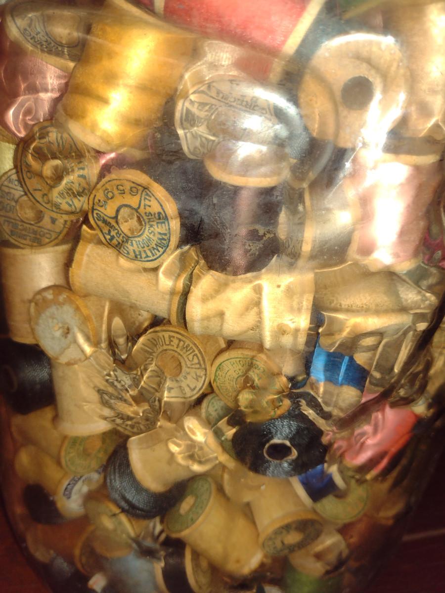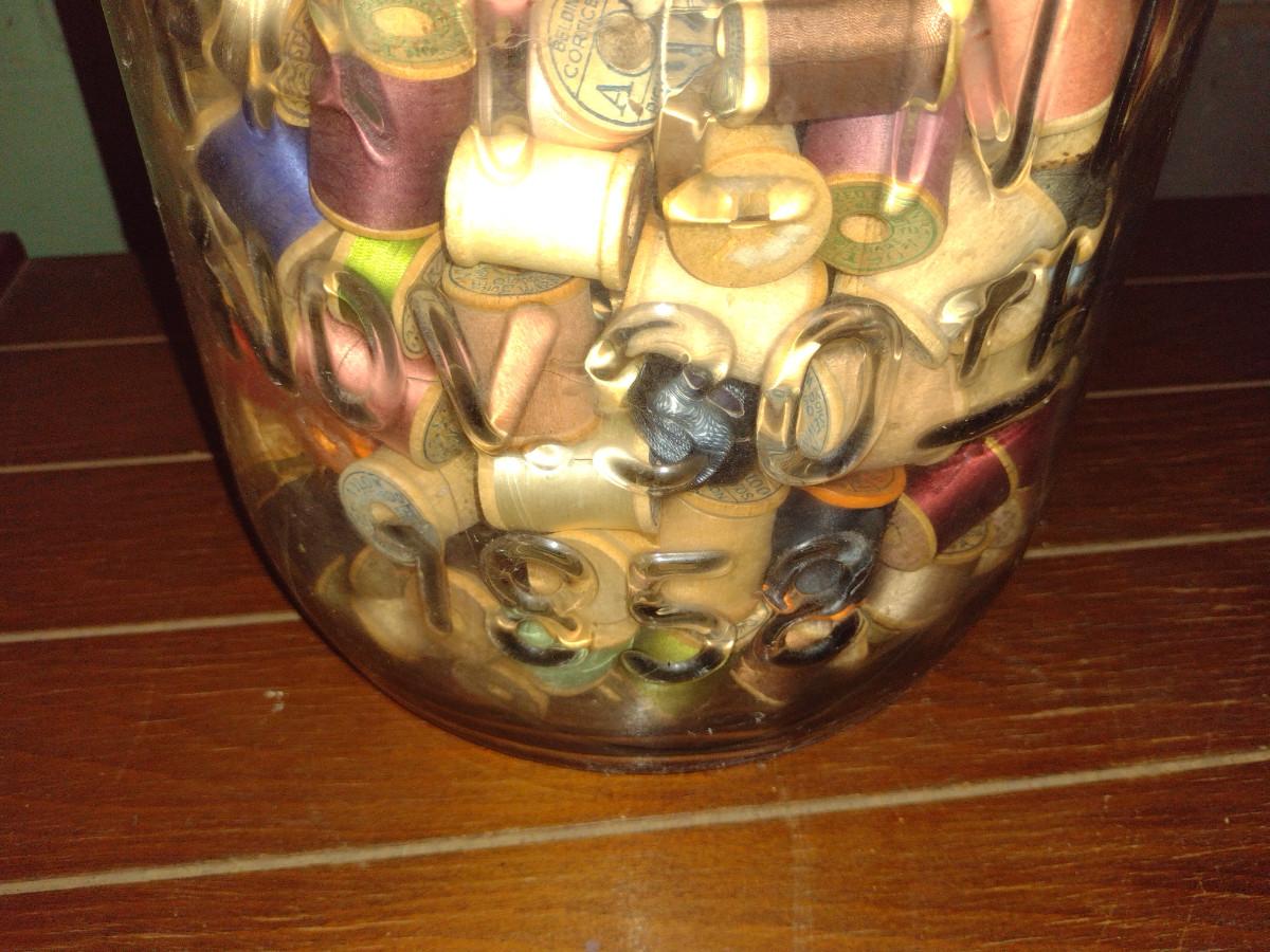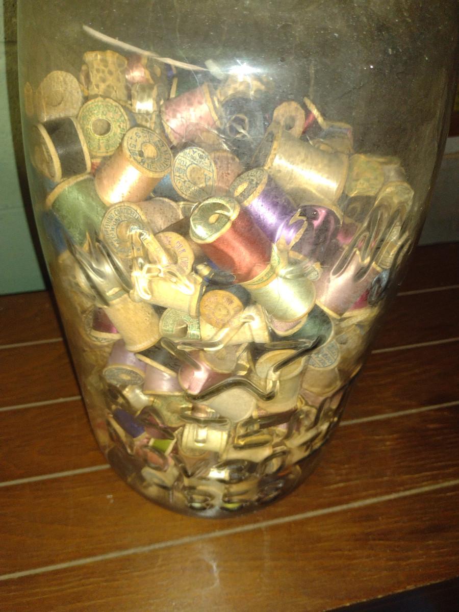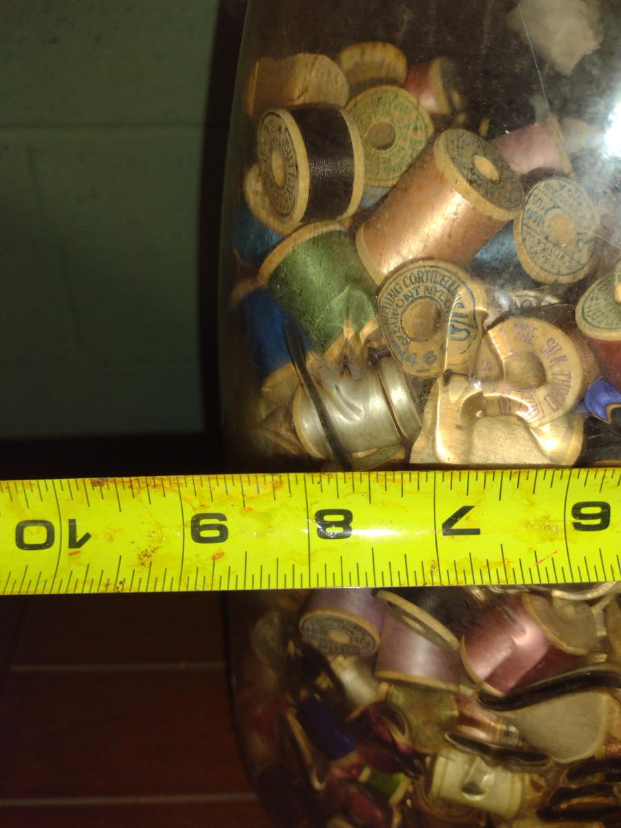 Large, Mason Jar with Eagle Filled with Spools of Thread- Approx 18 1/2" Tall. Lid has been cross threaded and may be difficult to remove.