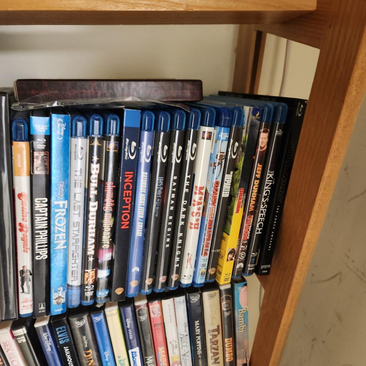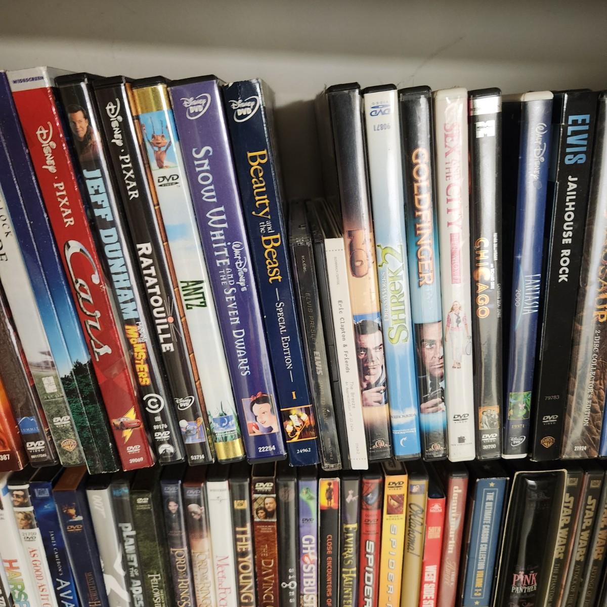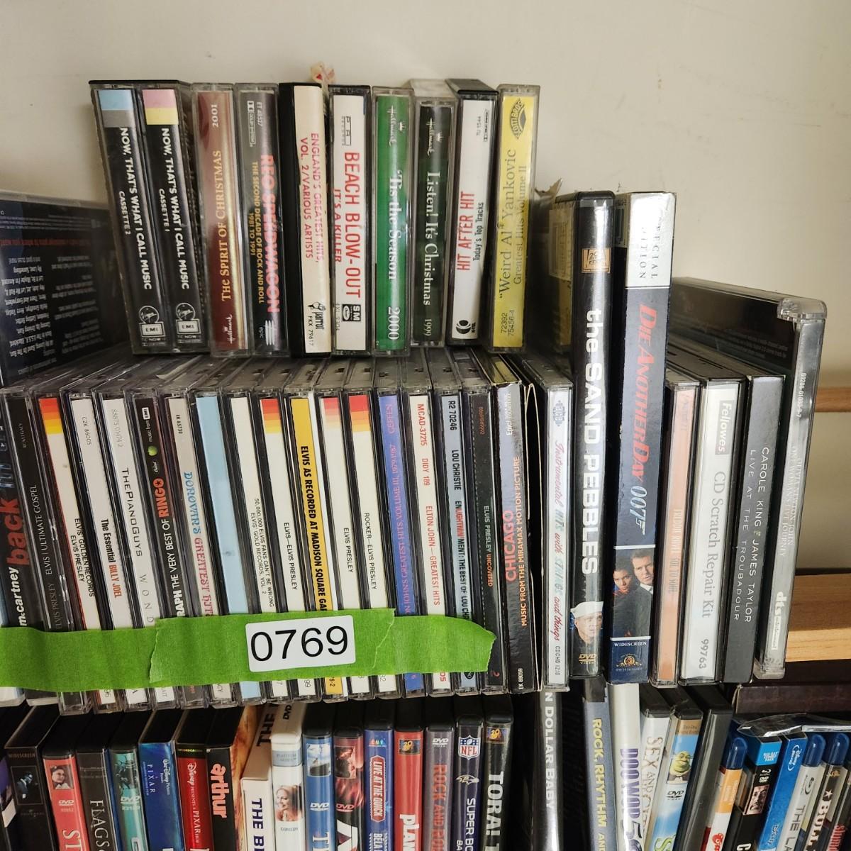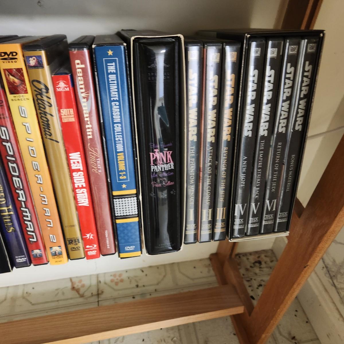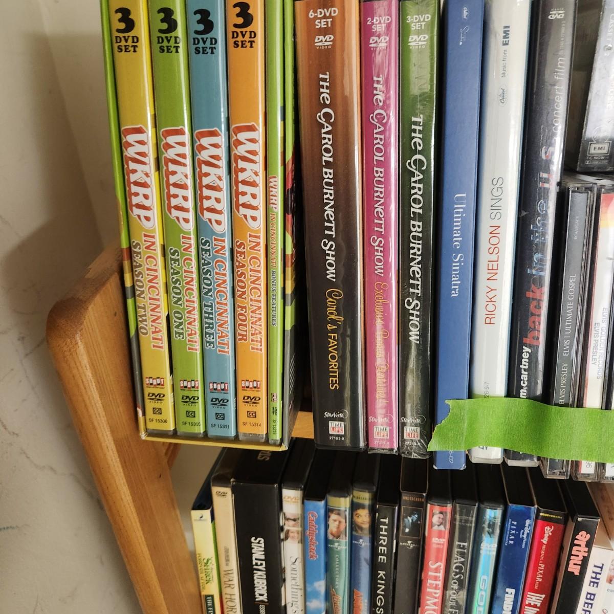 Large Media Lot w rack DVDs CDs Blu-Ray Cassettes Wkrp Star Wars Elvis Disney 007