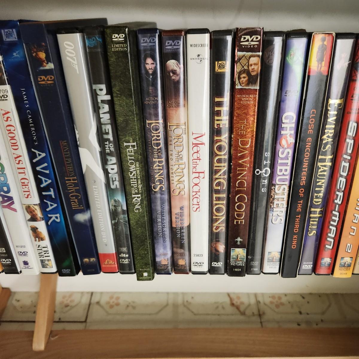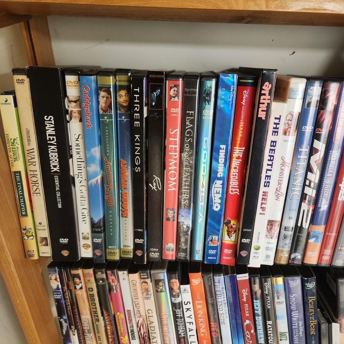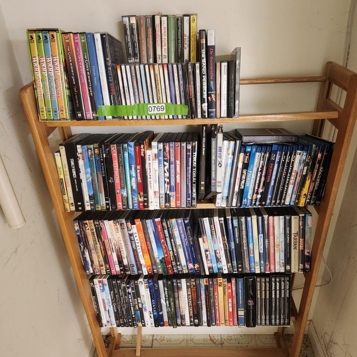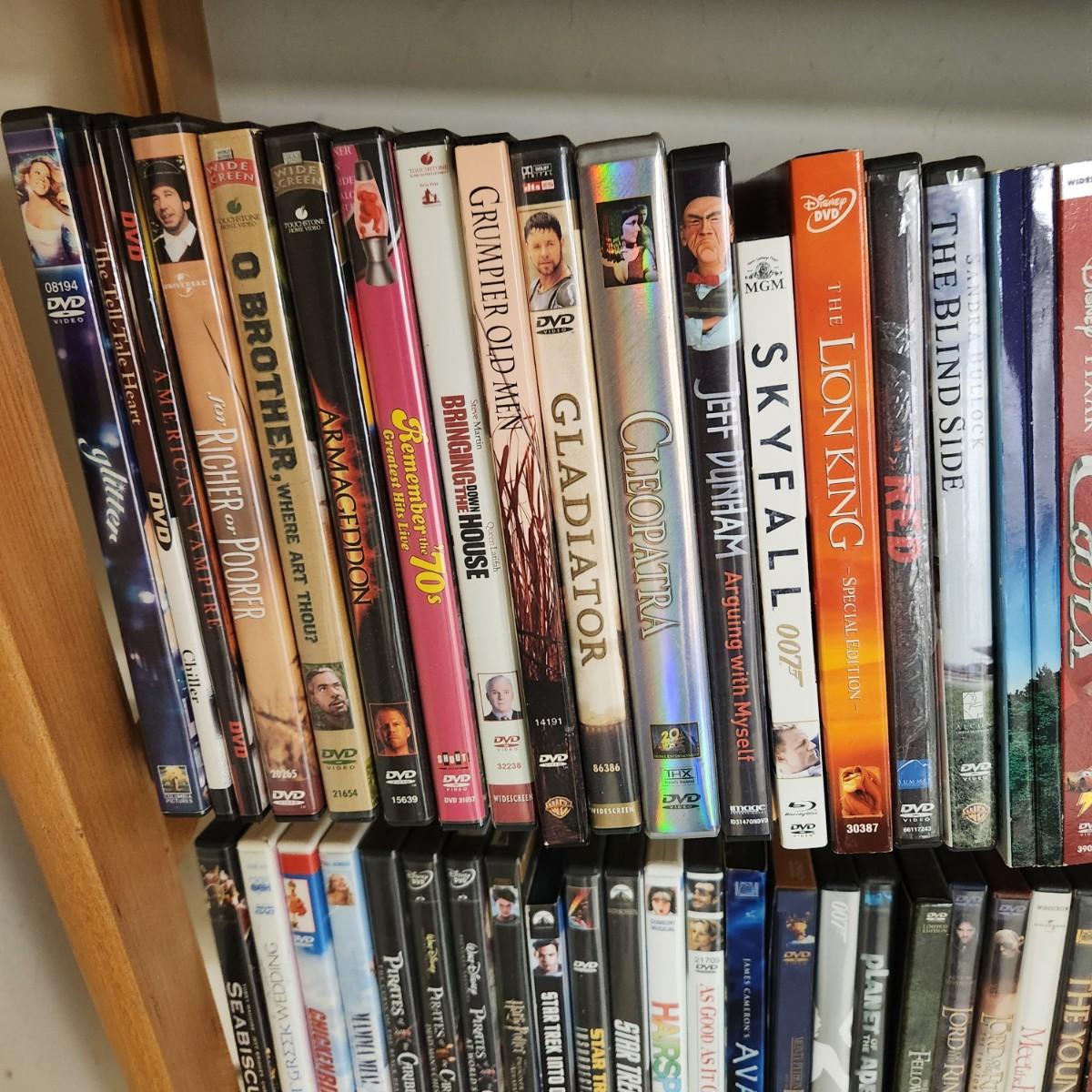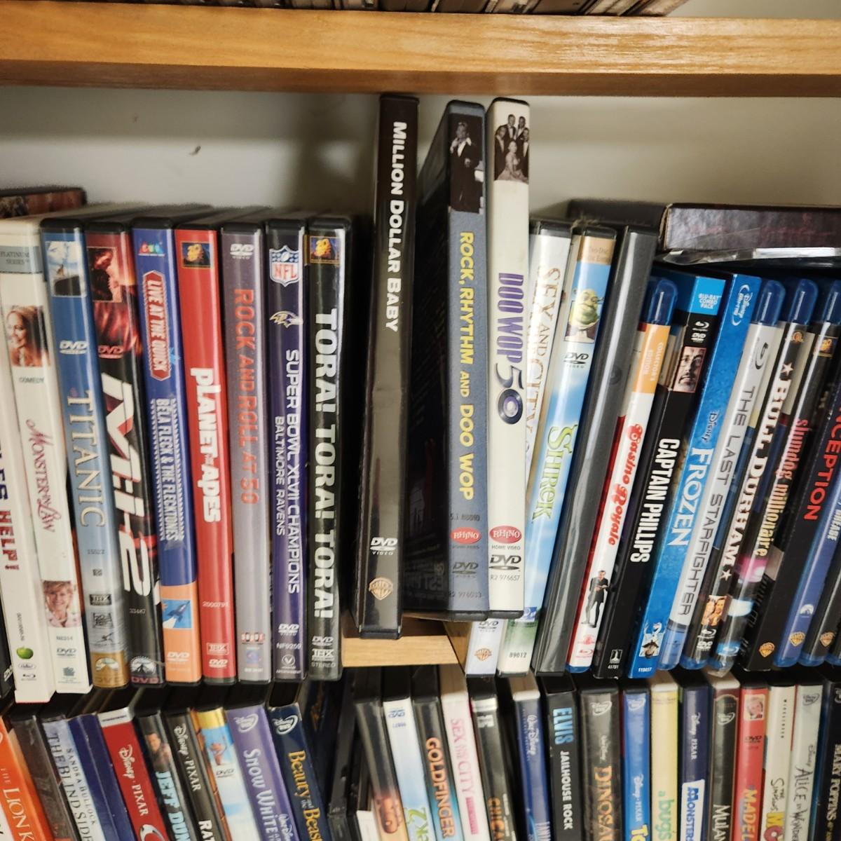 Large Media Lot w rack DVDs CDs Blu-Ray Cassettes Wkrp Star Wars Elvis Disney 007