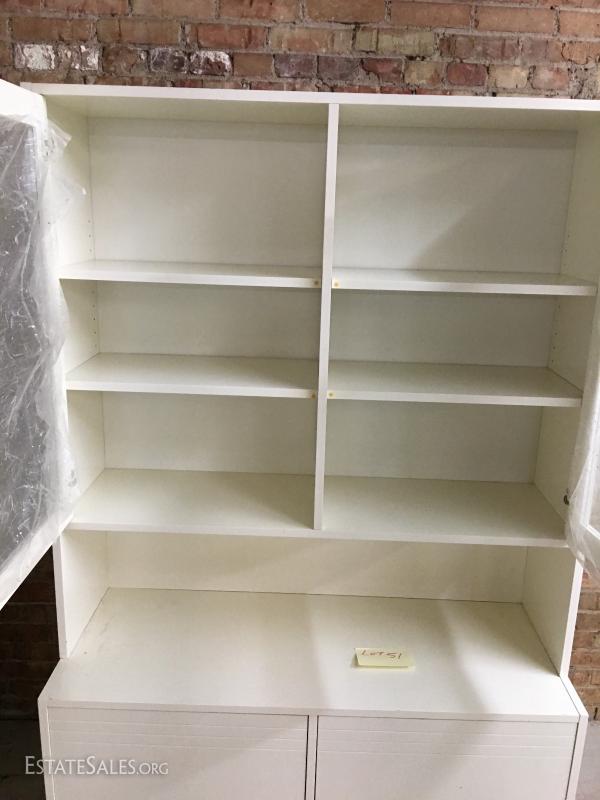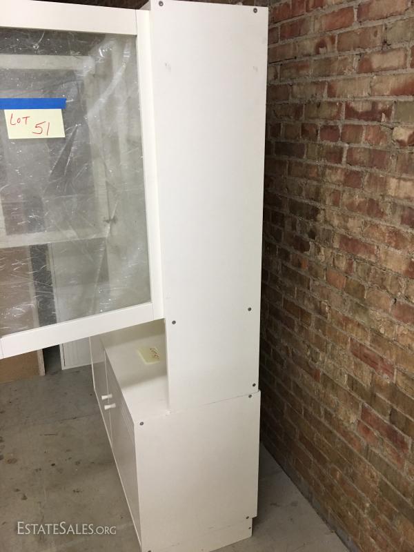 Large melamine shelving unit w/ glass doors. Lot#51