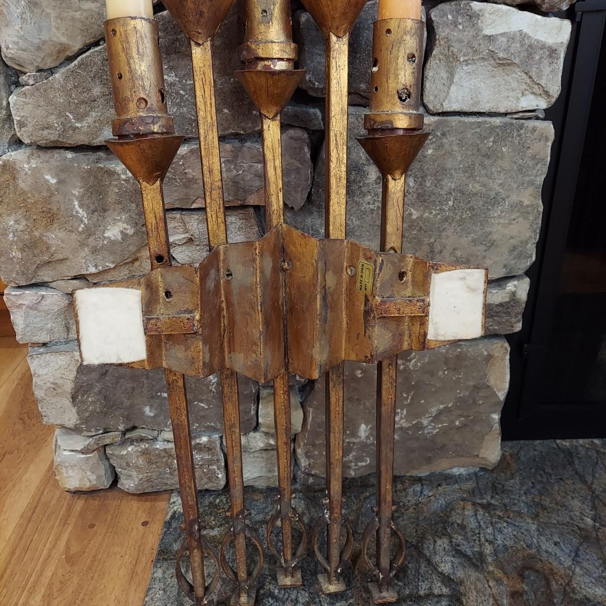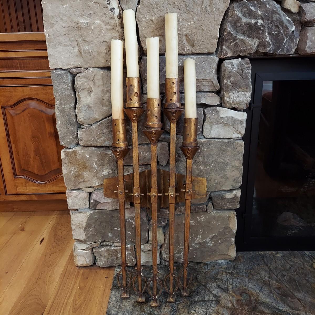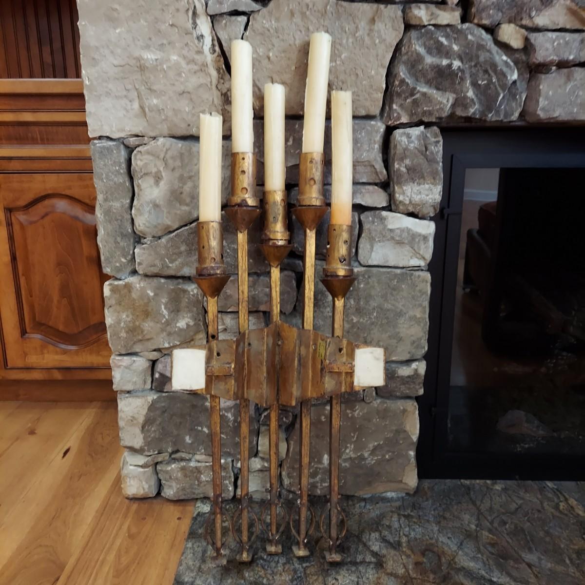 Large gold colored metal candle holder. It is made of a sturdy metal and hangs on the wall like a sconce. The base is approximately 14.5" x 6". The item itself is approximately 29"H (and 37"H with the candles). Shipping available. Shipping can be costly. We suggest contacting our preferred local shipping provider, Postage Express, with dimensions and getting an estimate before bidding: (828) 670-5501or postageexpress@yahoo.com.