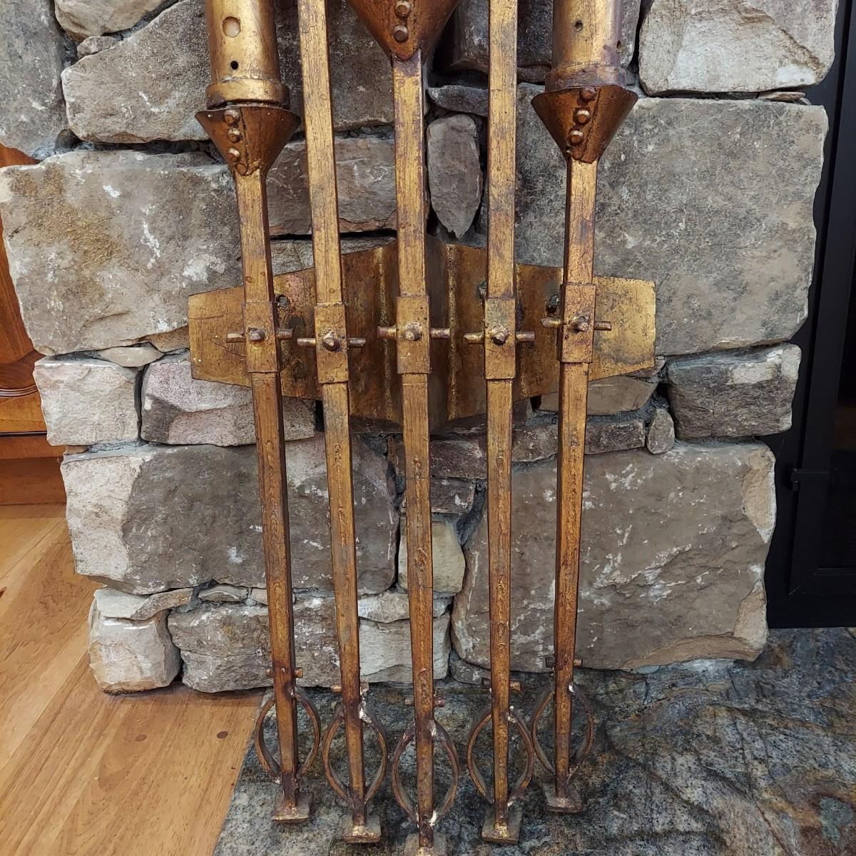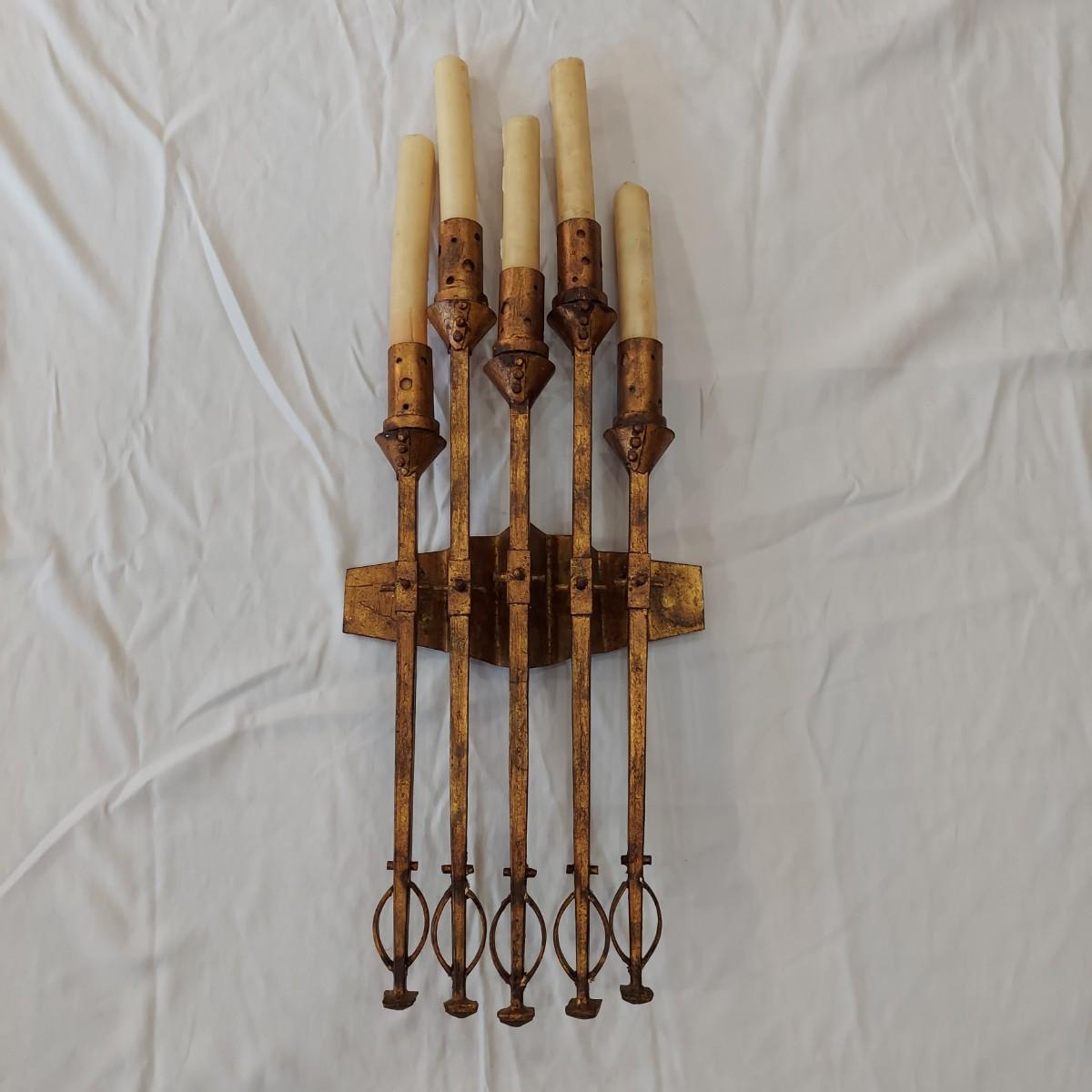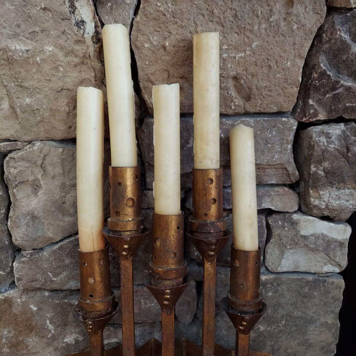 Large gold colored metal candle holder. It is made of a sturdy metal and hangs on the wall like a sconce. The base is approximately 14.5" x 6". The item itself is approximately 29"H (and 37"H with the candles). Shipping available. Shipping can be costly. We suggest contacting our preferred local shipping provider, Postage Express, with dimensions and getting an estimate before bidding: (828) 670-5501or postageexpress@yahoo.com.