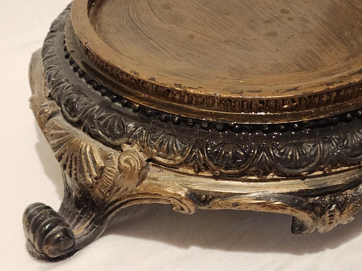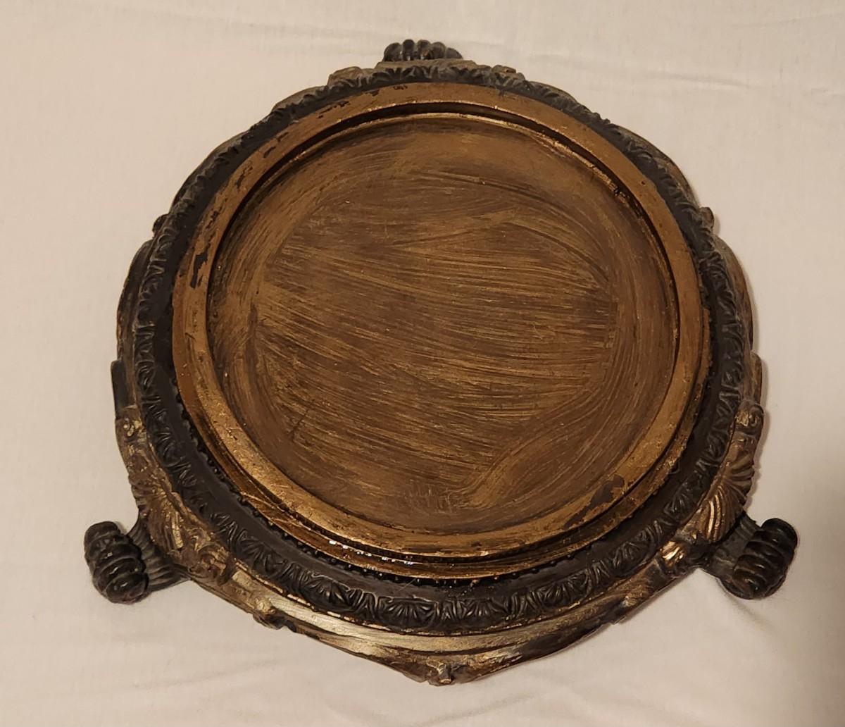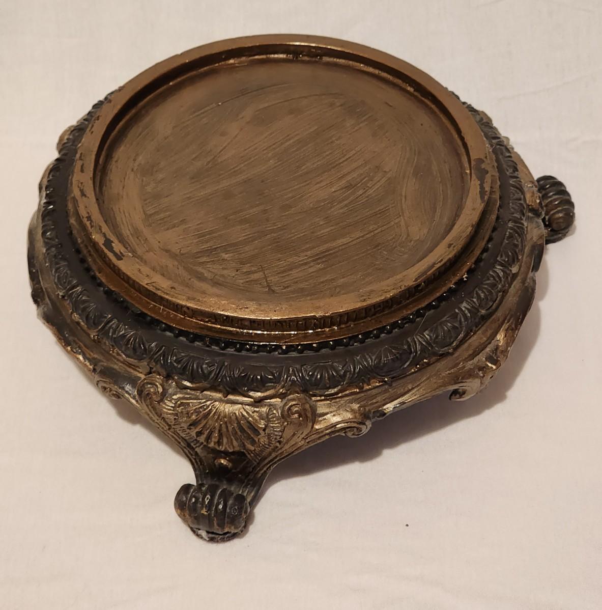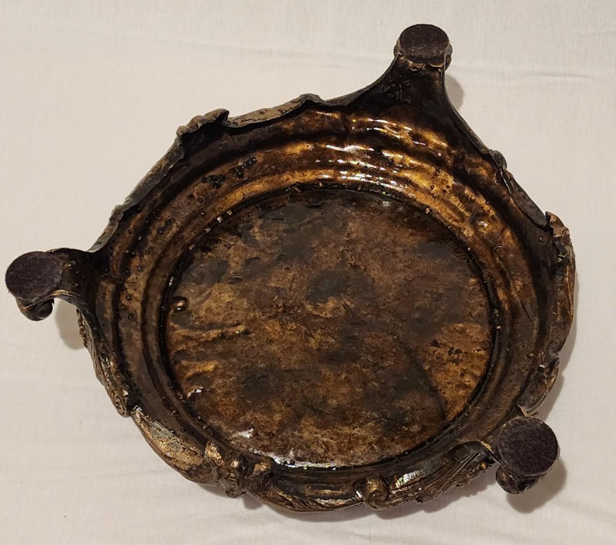 Bronze colored metal in 3 shades. Overall diameter 10". Will fit a pot with a 6.5" base.
